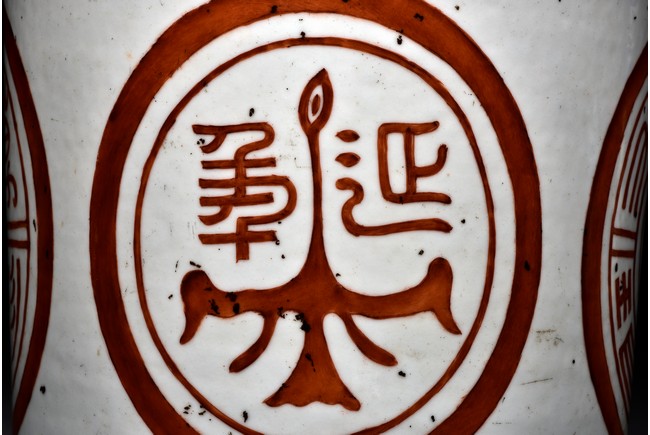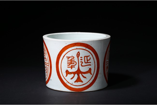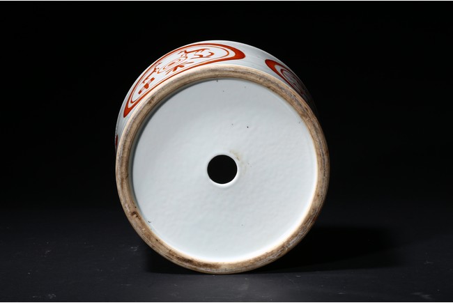 Of cylindrical form, the brushpot is painted with roundels enclosing stylized characters in red. The bottom drilled in hole. Qing Dynasty period.