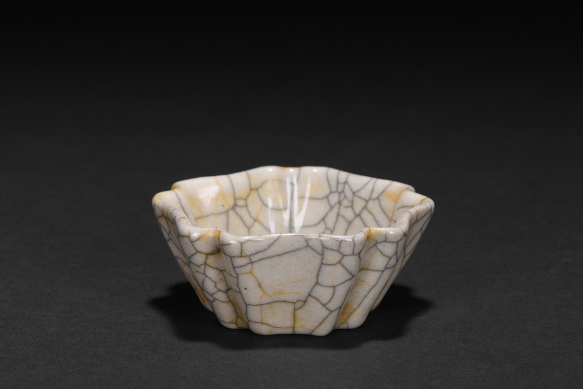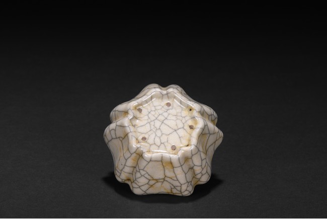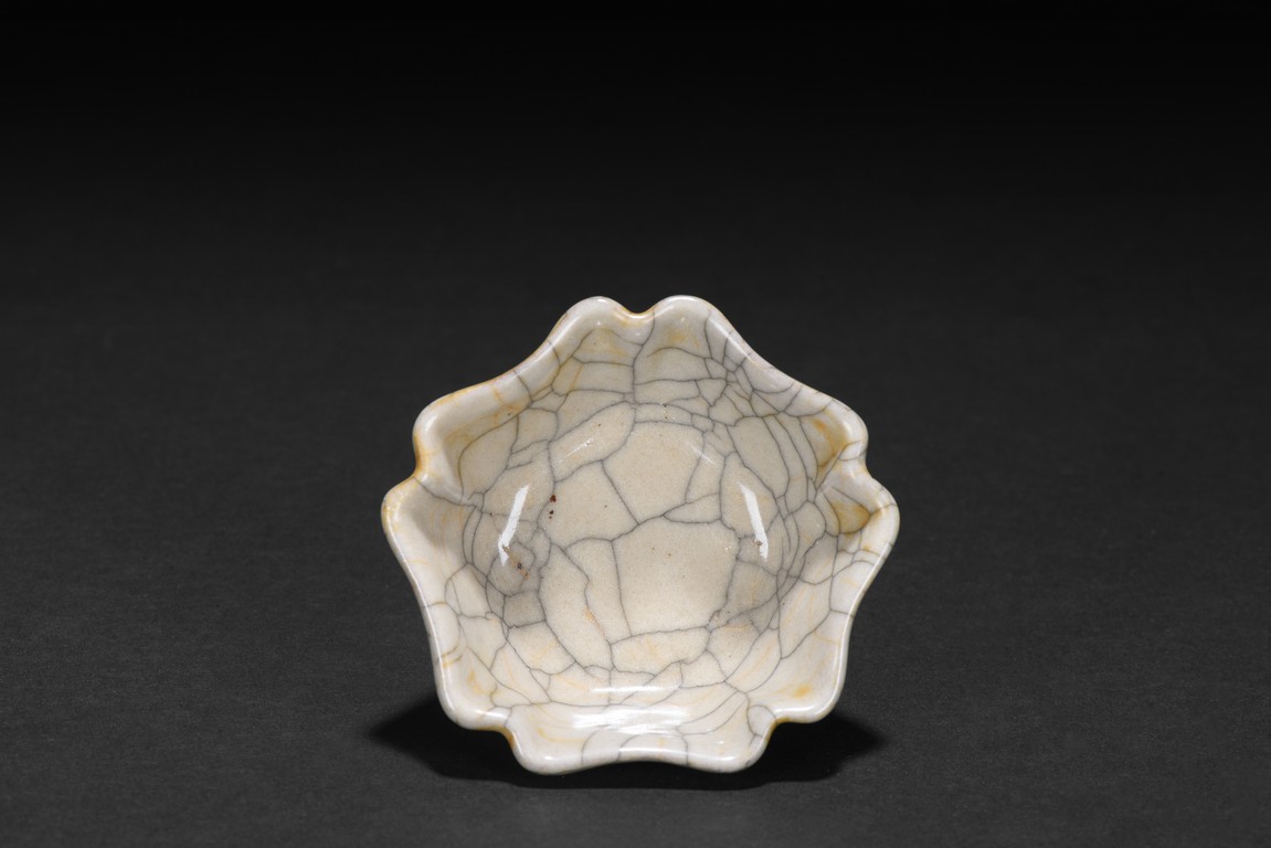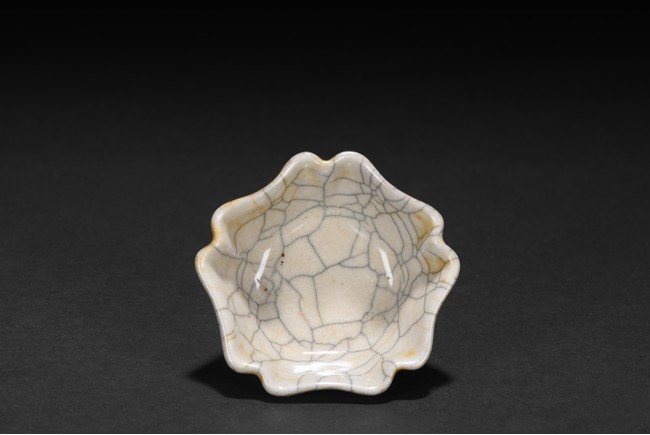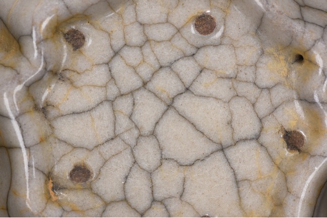 Of lobed form, overall covered with a glaze of bone-white infused with fine gold and black crackles, the base with five spur marks.