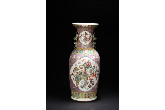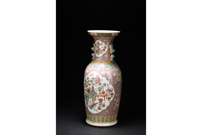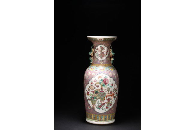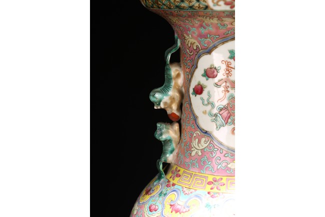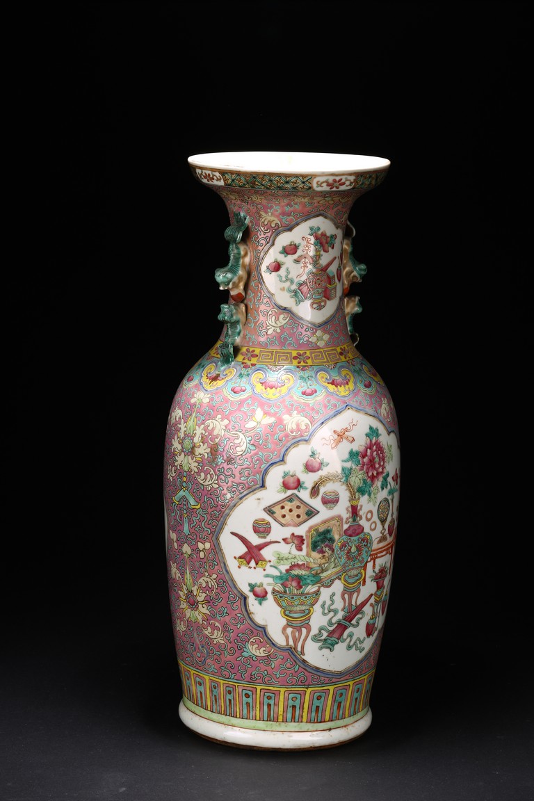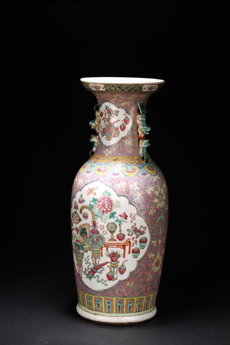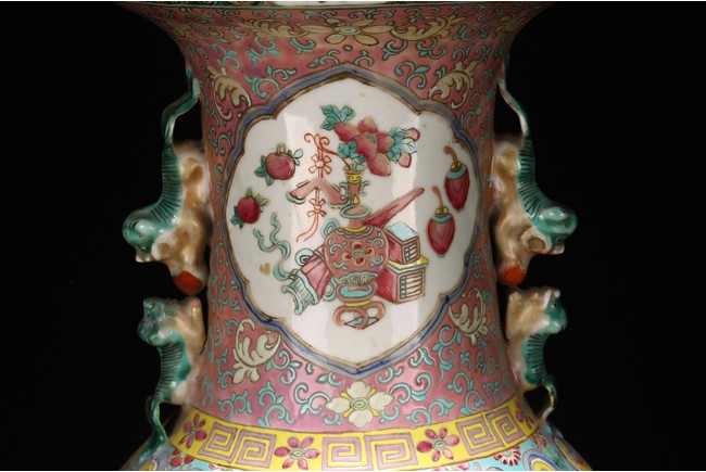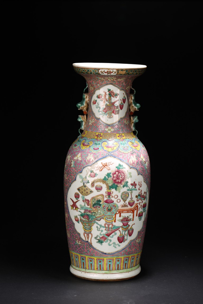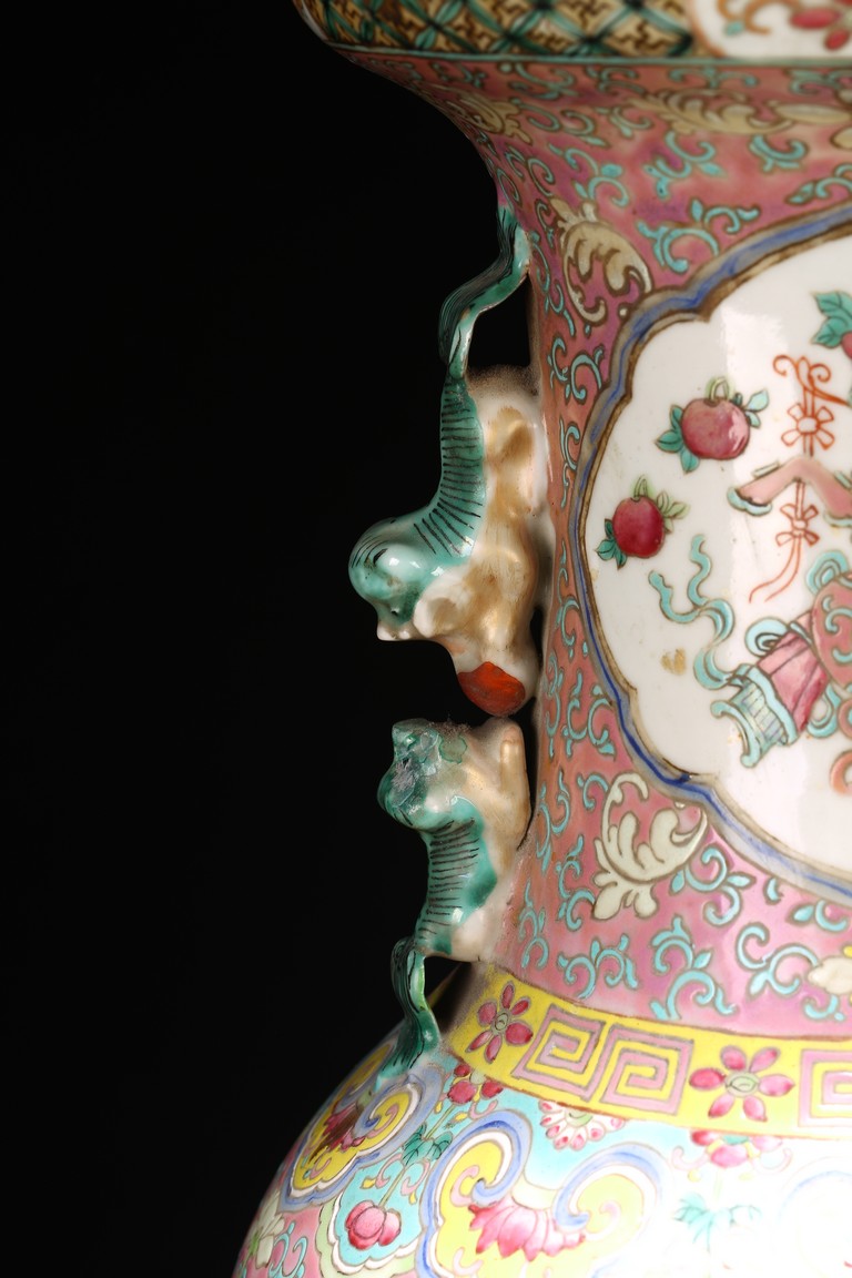 Qing Dynasty period. The baluster vase decorated in famille rose to the exterior with antiques and scholar objects enclosed within a shaped cartouches on front and back, the neck with similar decoration and flanked by buddhist lion pair as handles.