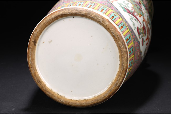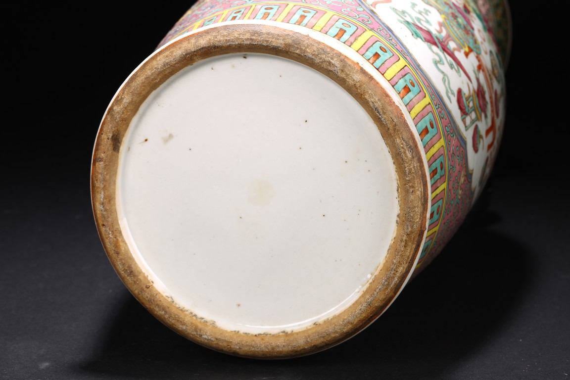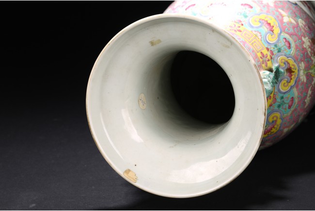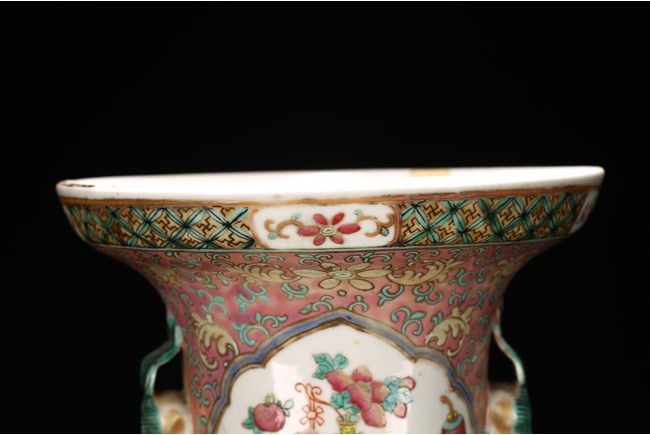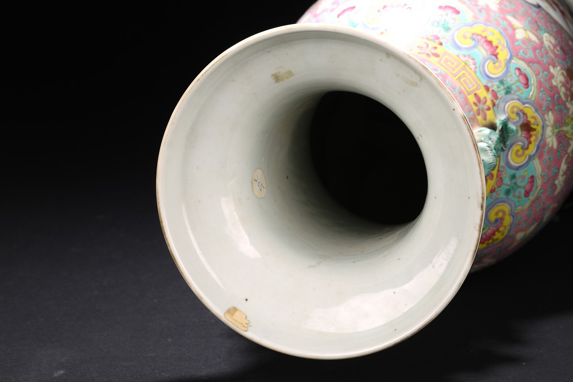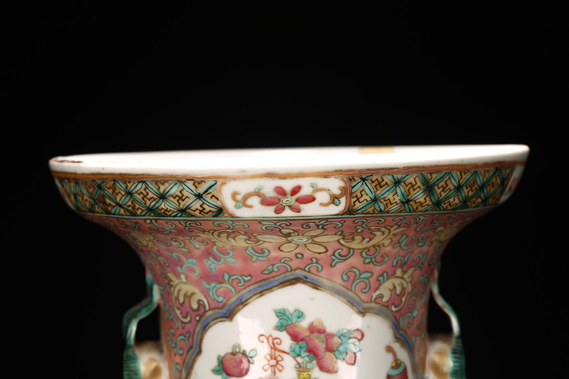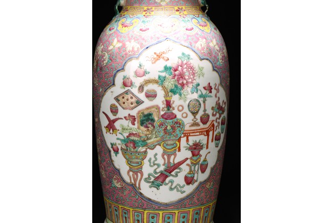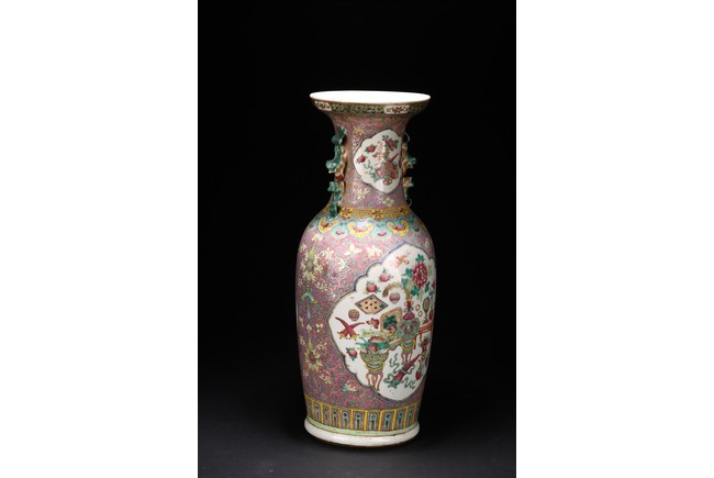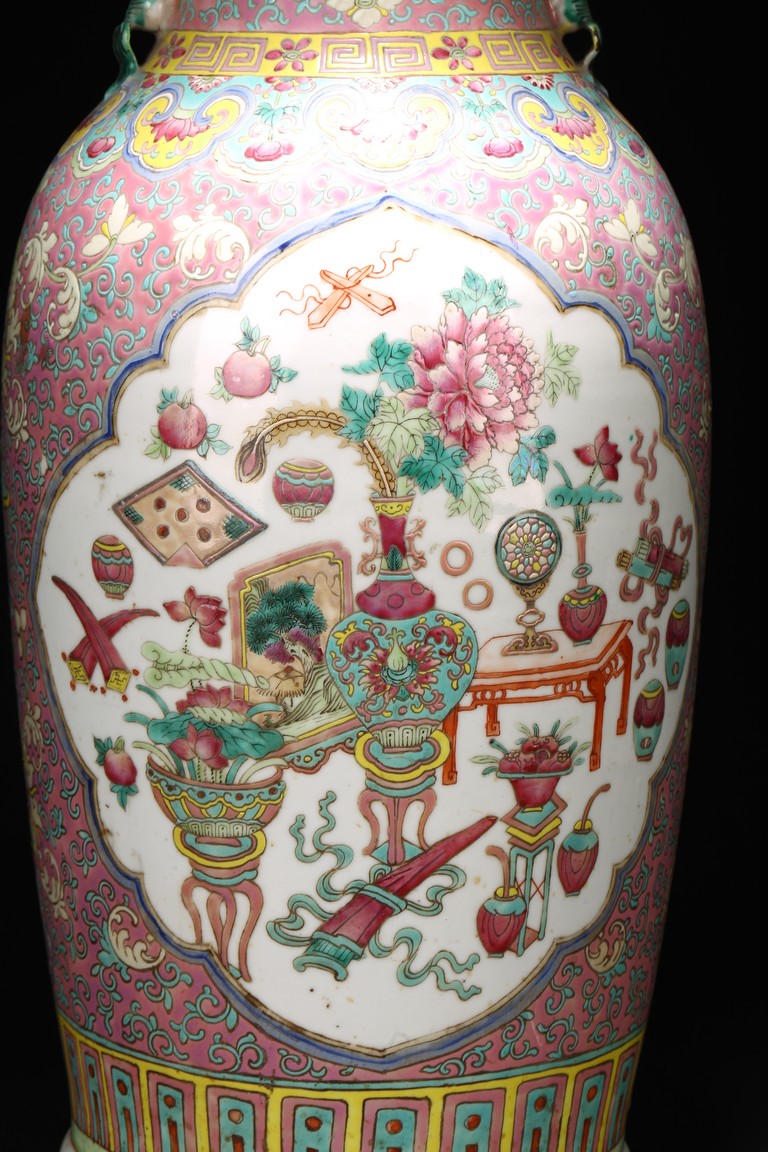 Qing Dynasty period. The baluster vase decorated in famille rose to the exterior with antiques and scholar objects enclosed within a shaped cartouches on front and back, the neck with similar decoration and flanked by buddhist lion pair as handles.