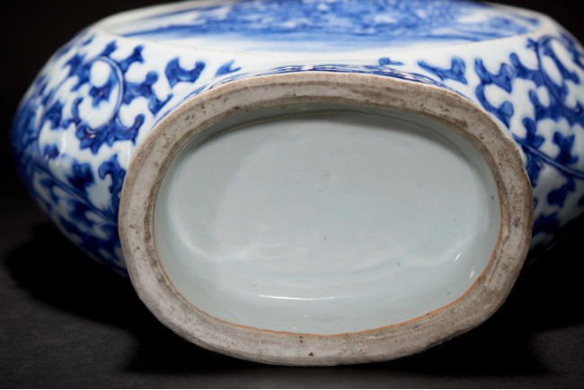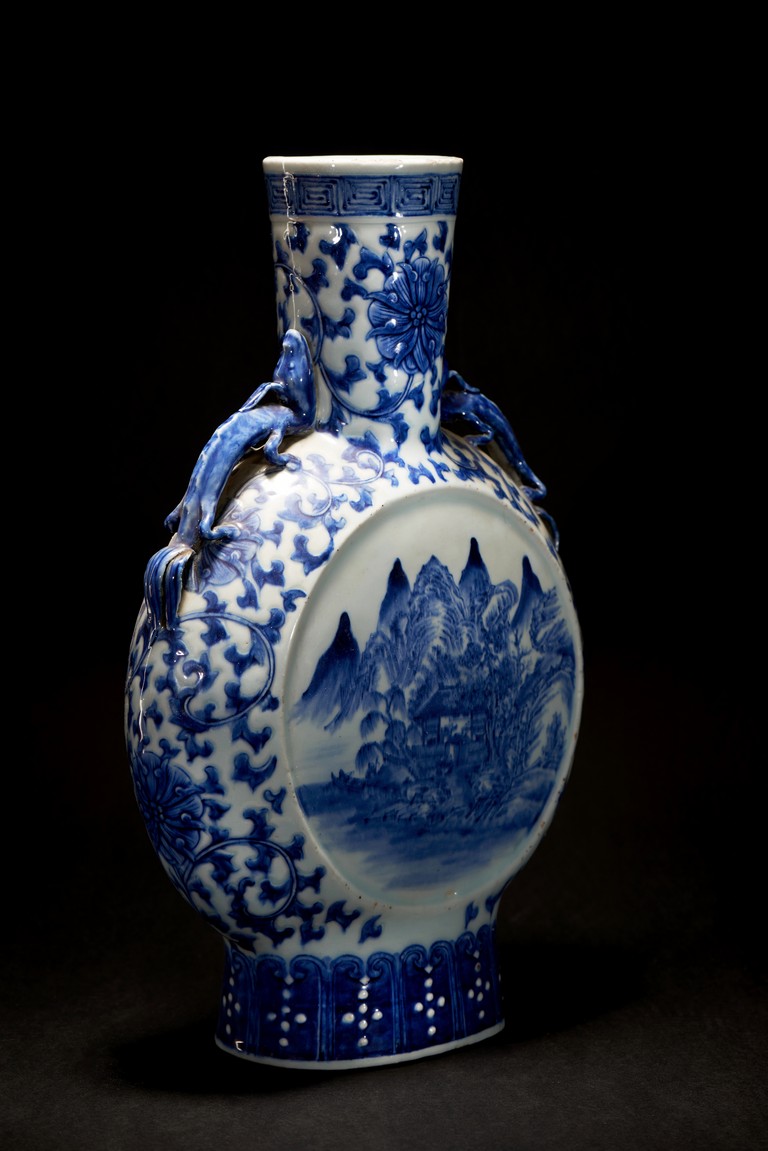 The vase is applied with twin dragon handles to the shoulder, painted to each side with circular panels of riverside and mountain landscape, surrounded by scrolling lotus foliage. Late Qing Dynasty period.