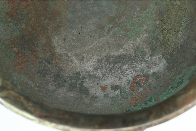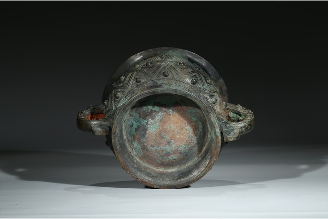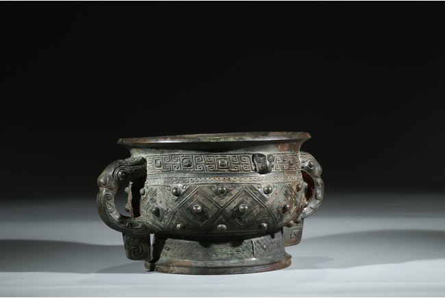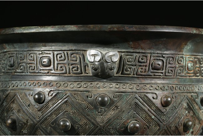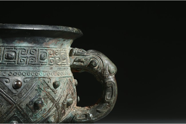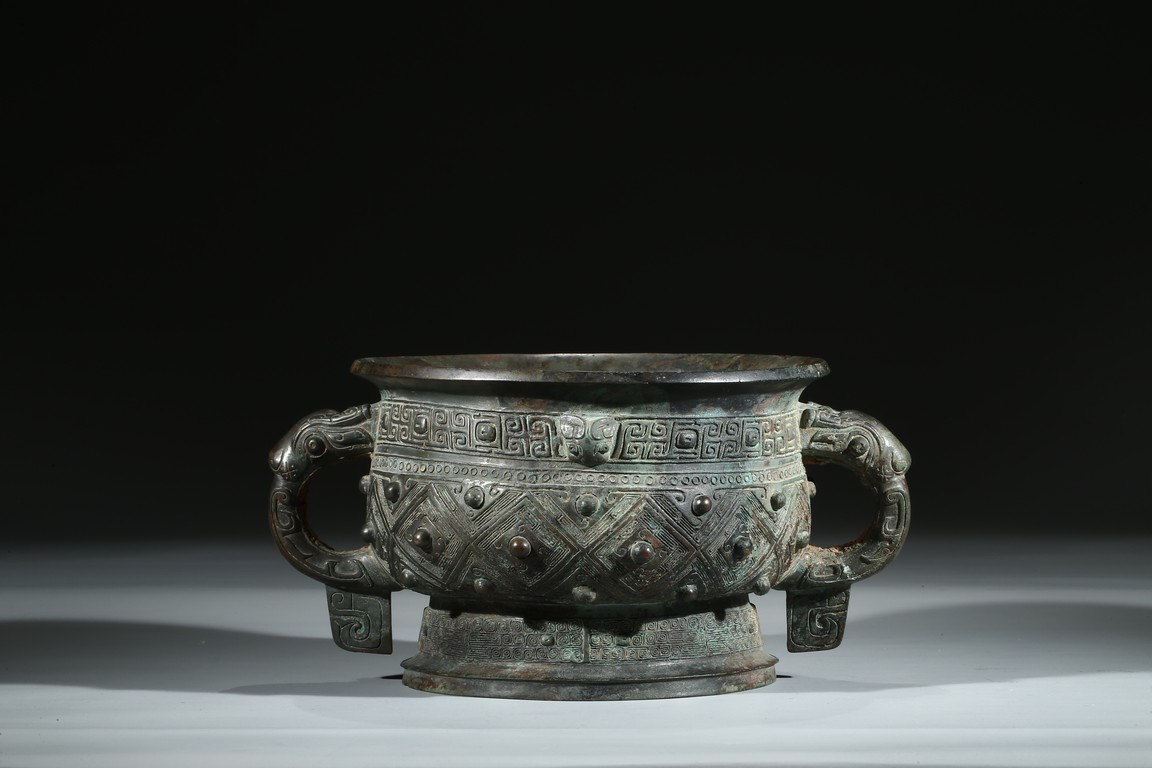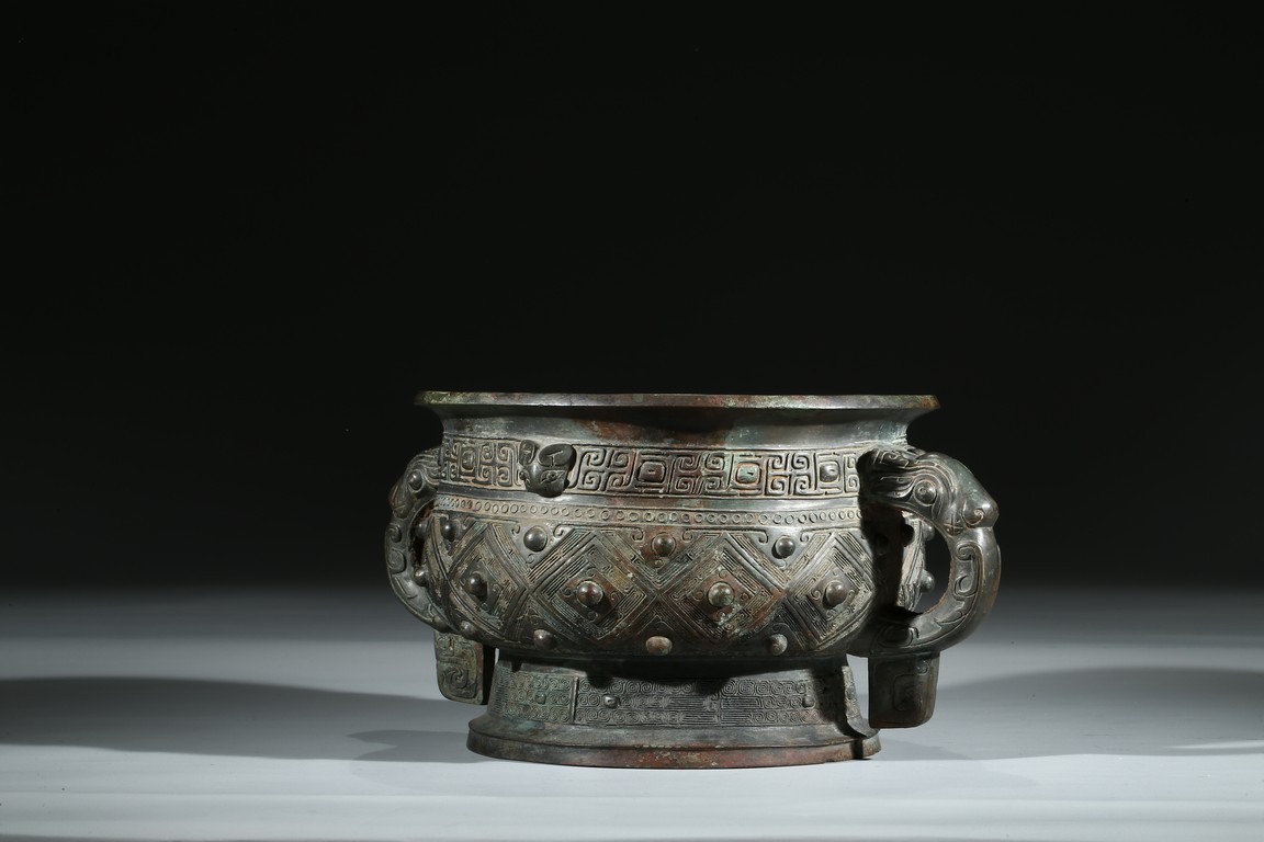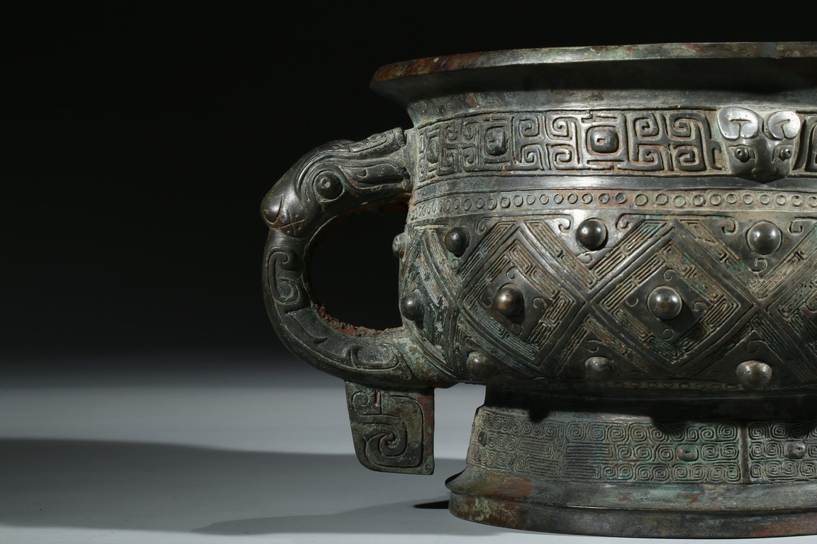 Of bombé form, rising from splayed foot to a gently flaring rim flanked by loop handles emerging from the jaws of a horned beast, the sides crisply cast with a wide band of raised bosses against a lozenge ground, bordered on either side by ring-punched bands, all below four pairs of stylized dragons centered on a pair of animal masks below the rim, the foot with a band of confronted dragons. Western Zhou Dynasty period.