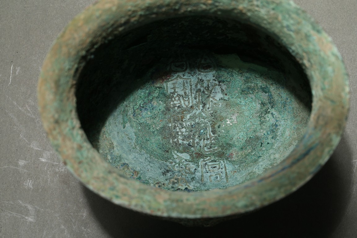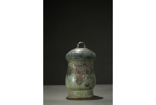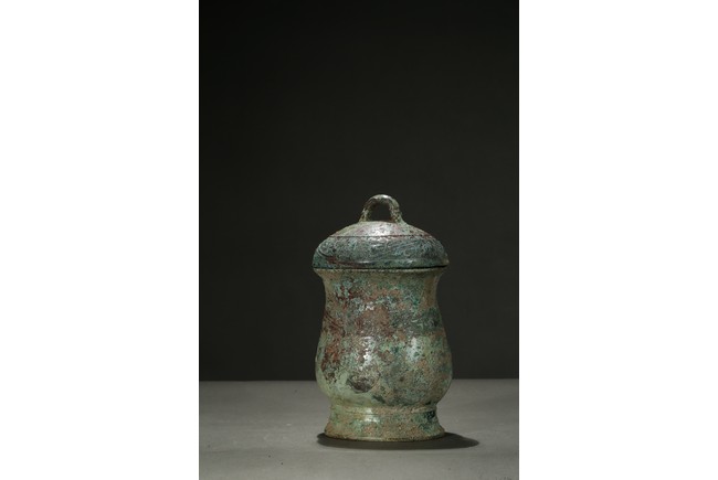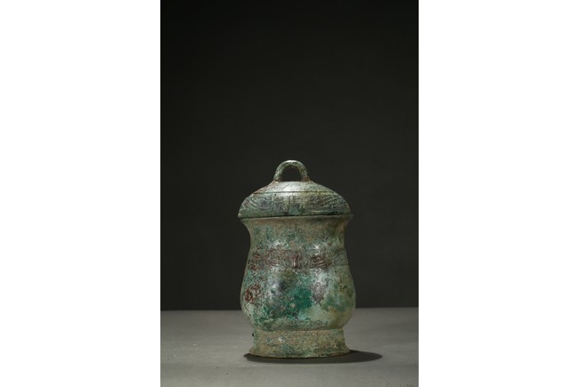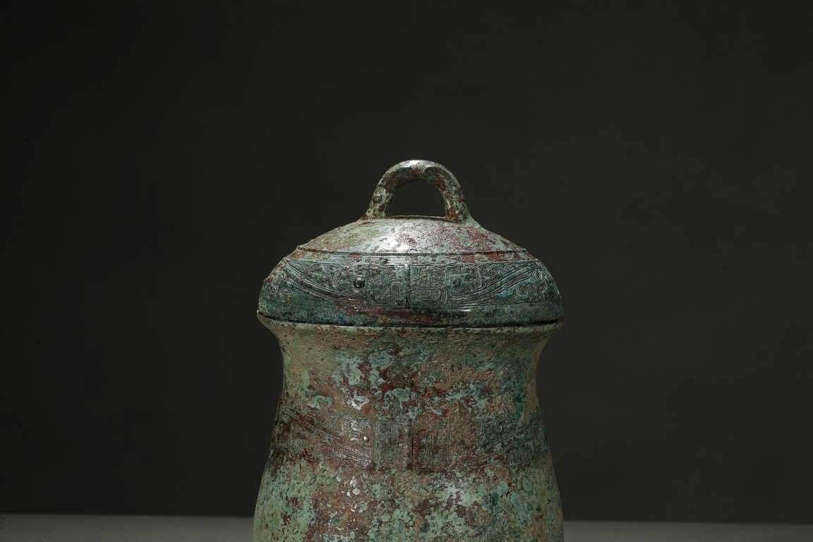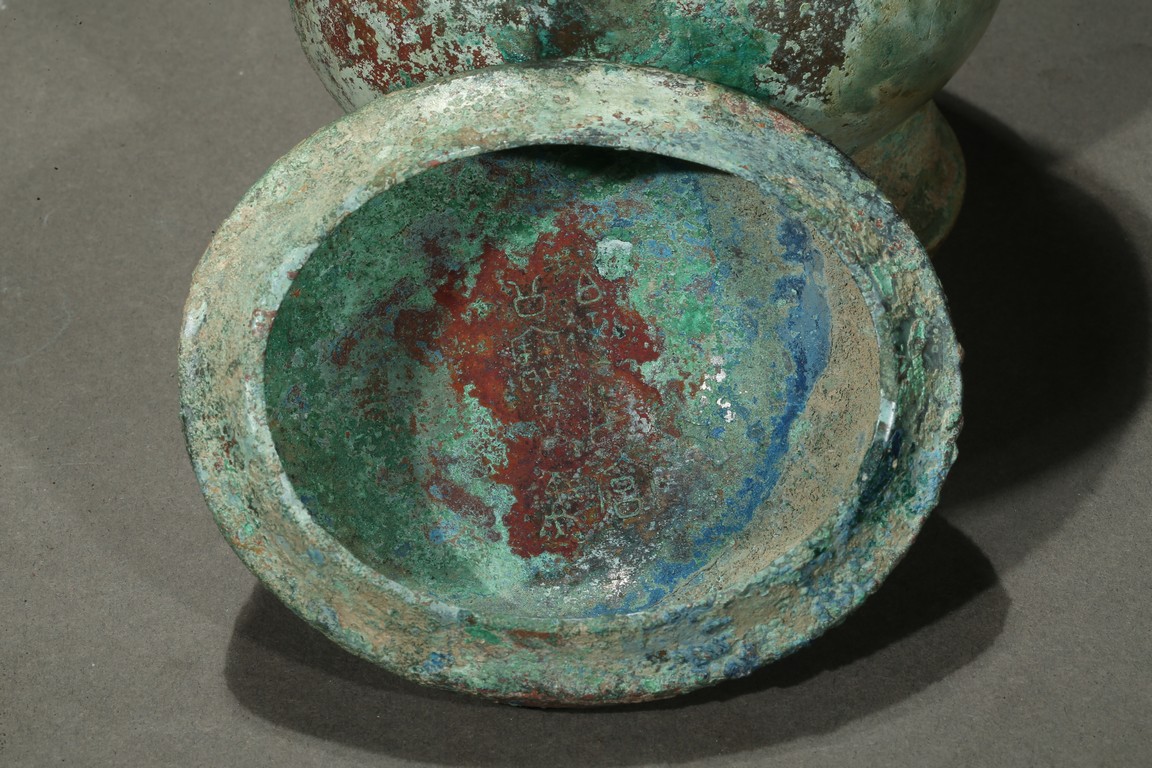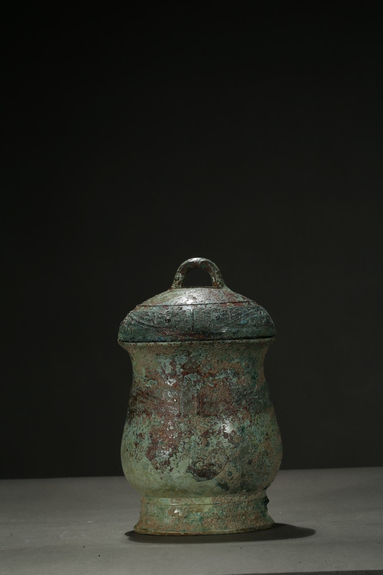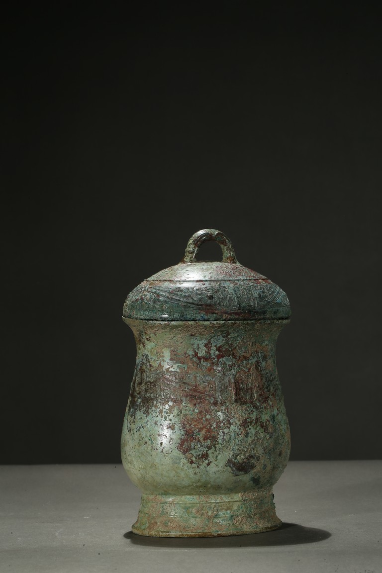 The pear-shaped body is raised on a spreading foot, decorated with a single frieze of taotie mask. The cover has slightly waisted sides and a domed top surmounted by a looped handle, cast with a band of match stylized match taotie design. An eight-character inscription is cast inside the cover. Shang Dynasty or later.