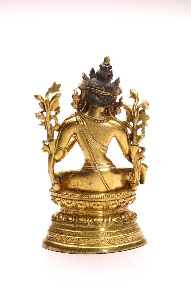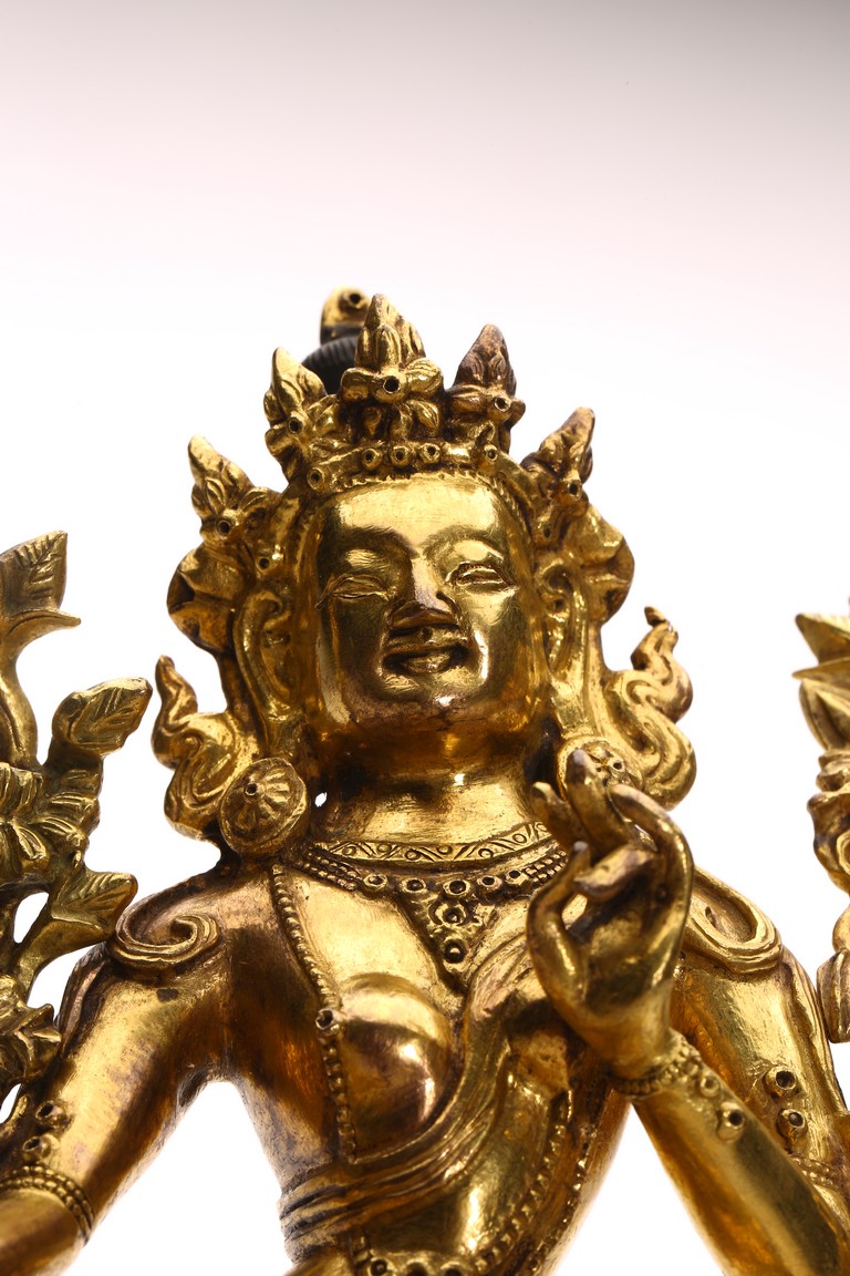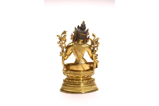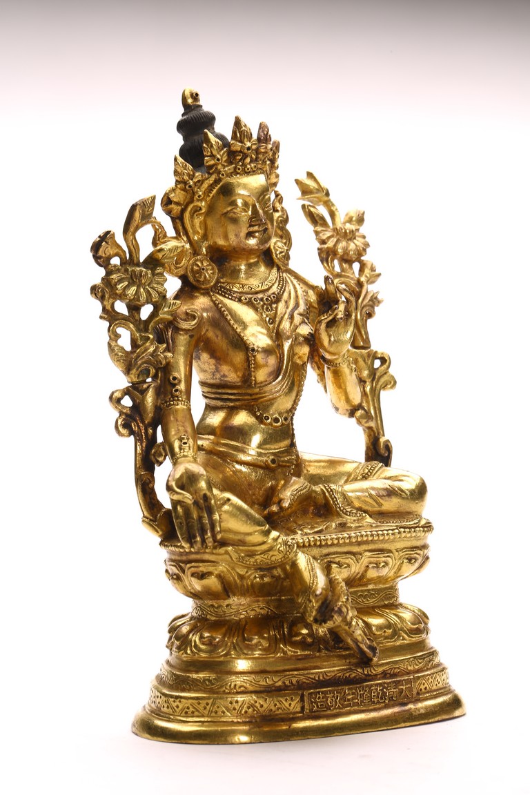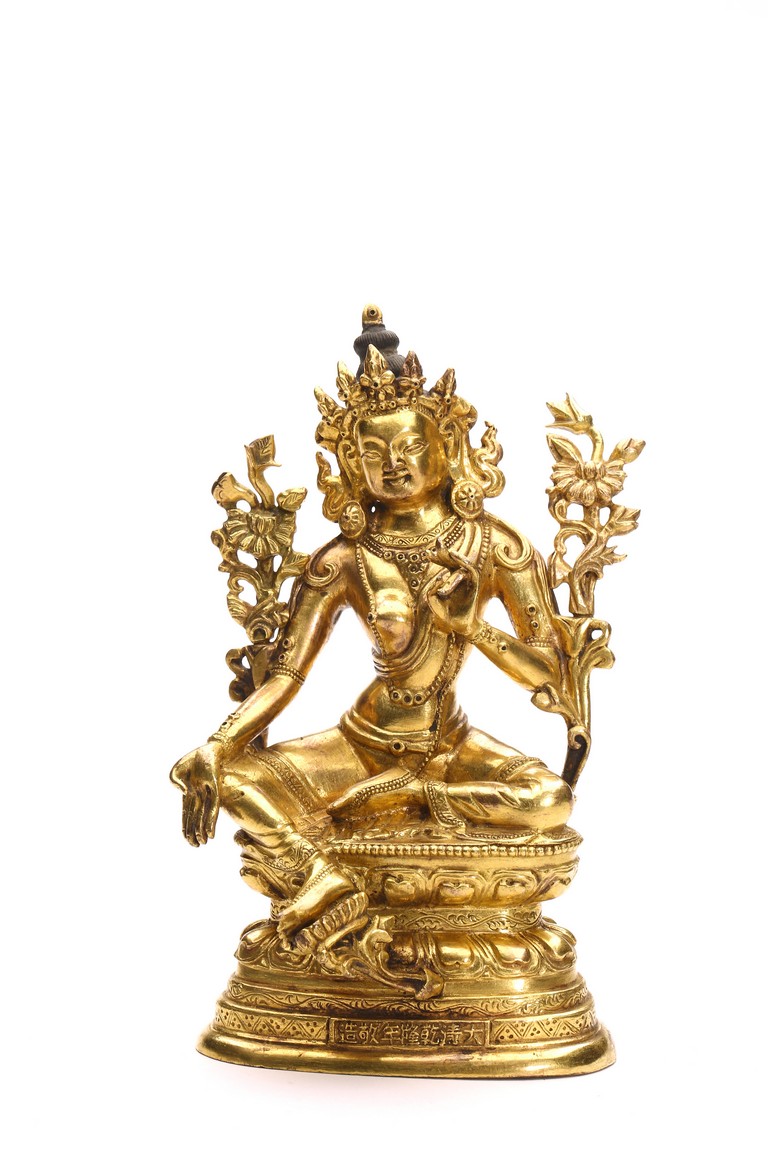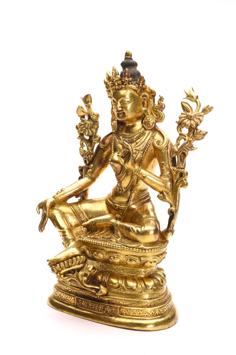 Qing Dynasty period. Cast seated in lalitasana on a double-lotus base, the right hand extended in varadamudra and the left hand raised to the chest, flanked by leafy uptala lotuses rising above the shoulders, dressed in a dhoti incised with a foliate borders, further embellished with beaded jewellery, crowned with a five-leaf tiara. The lower front base cast with six character Qianlong mark.