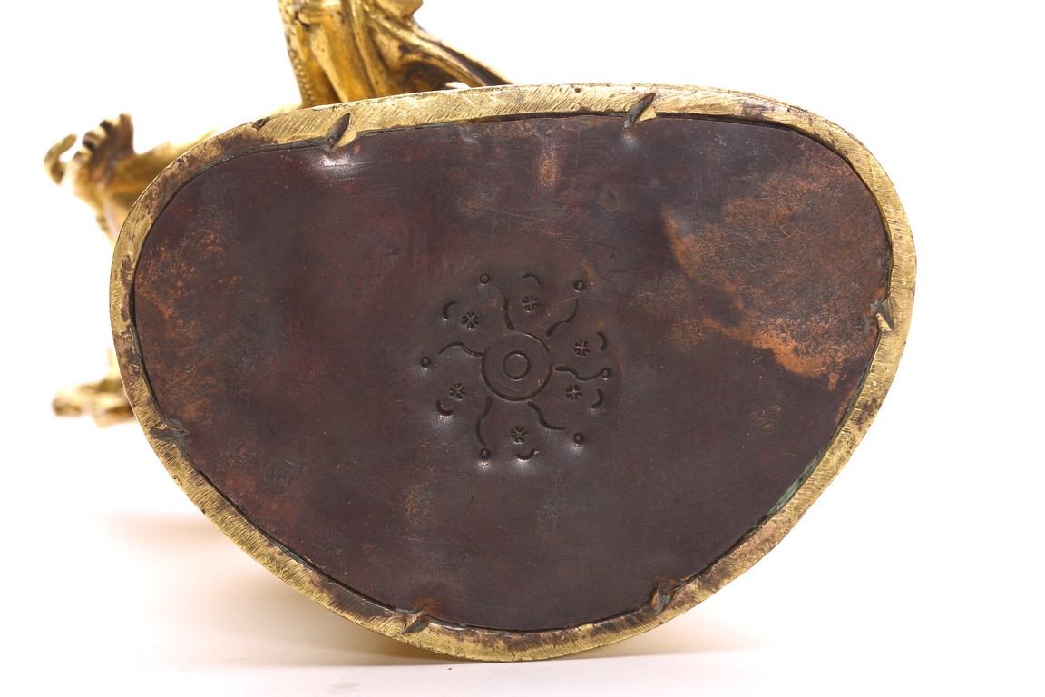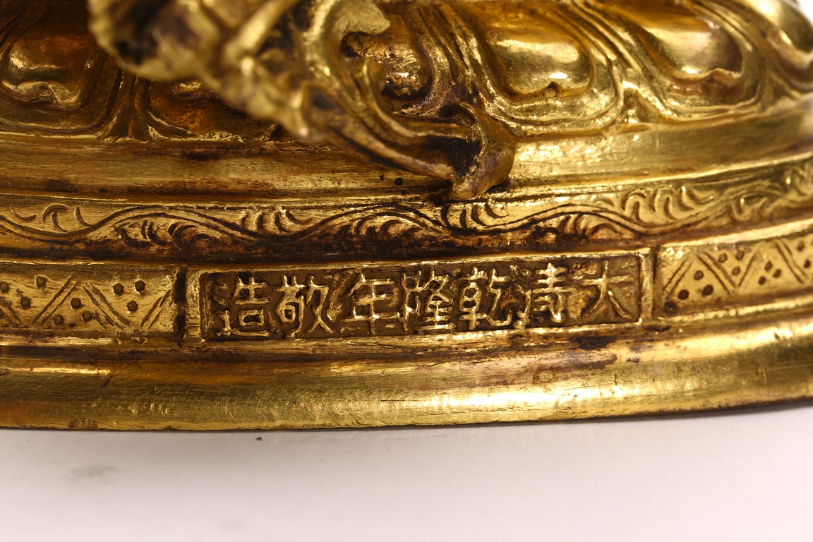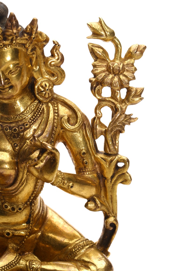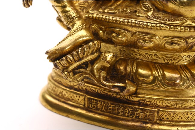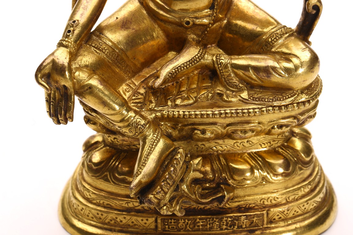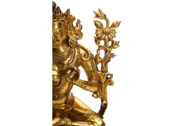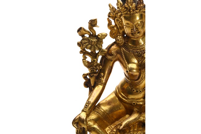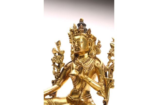 Qing Dynasty period. Cast seated in lalitasana on a double-lotus base, the right hand extended in varadamudra and the left hand raised to the chest, flanked by leafy uptala lotuses rising above the shoulders, dressed in a dhoti incised with a foliate borders, further embellished with beaded jewellery, crowned with a five-leaf tiara. The lower front base cast with six character Qianlong mark.
