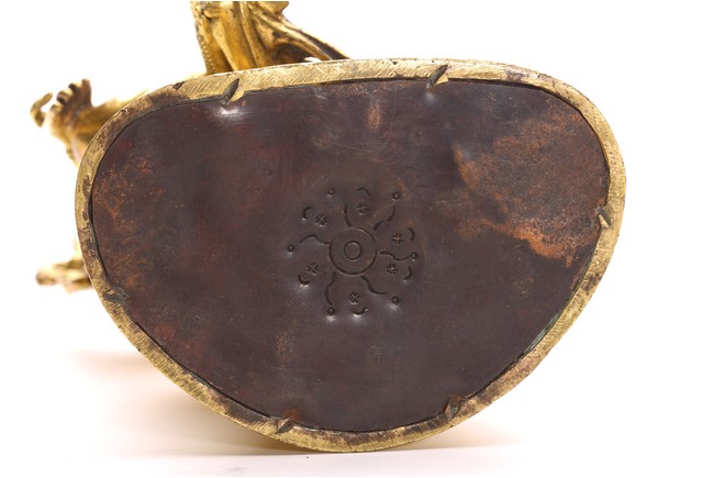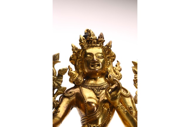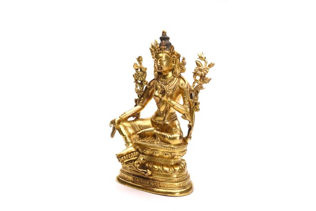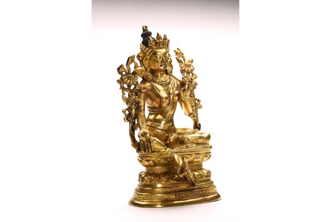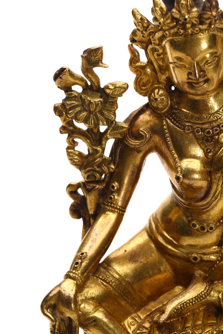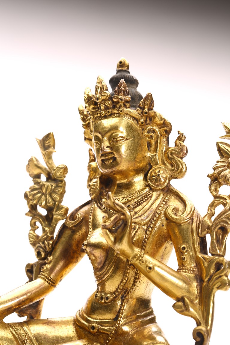 綠度母,全稱聖救度佛母,是二十一尊度母之一,為觀世音菩薩的化身,是所有度母之主尊,總攝其餘二十尊化身之所有功德。此尊頭戴五葉花冠,面相圓潤,高鼻薄唇,眼作笑意,相容和煦,各處嵌飾彩石,耳戴圓珰,頭向右微傾,身體呈三折式,豐乳細腰,體態婀娜。左腿單盤,右足踏一莖仰蓮,舒坐於臺座上。上軀袒露,佩戴瓔珞釧環,下著綢裙,上鏨刻有華美細密的紋飾。右手自然置於右膝施與願印,左手風空二指於胸前相撚作說法印。最精彩的是兩株茂盛的蓮花繞臂而上,齊肩綻放,臺座蓮瓣六寬闊飽滿,整像造型生動,鎏金淳厚。