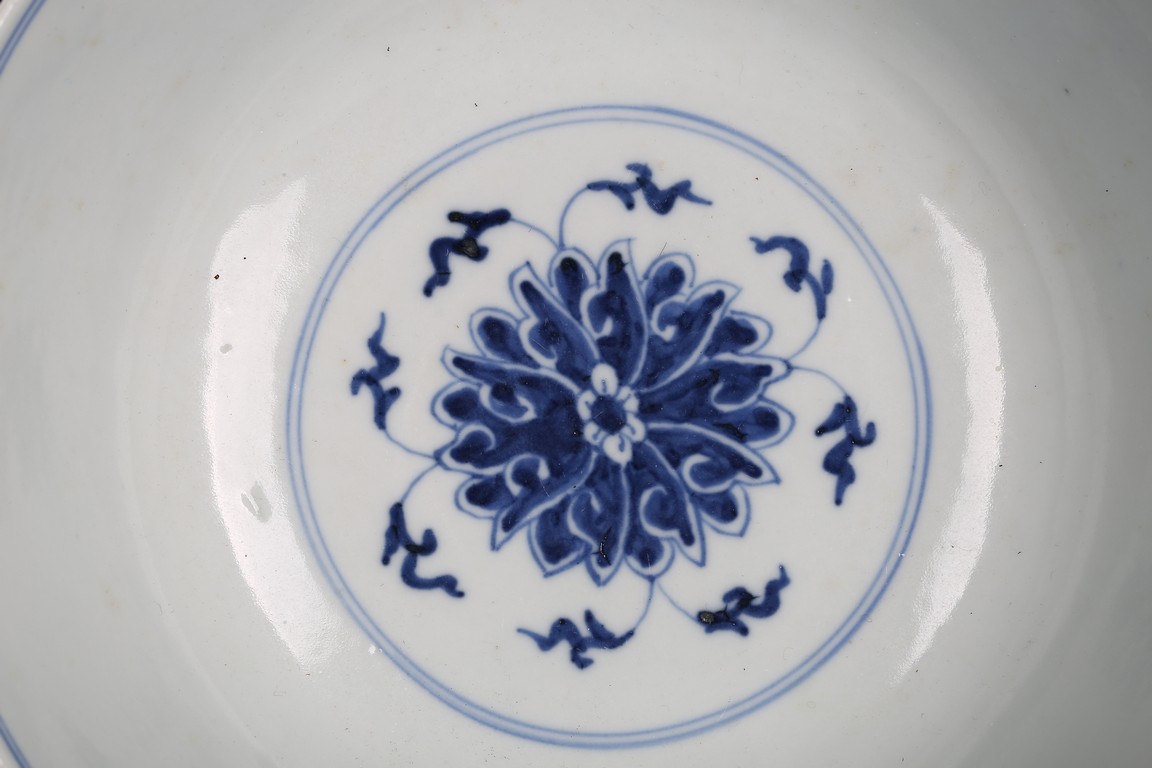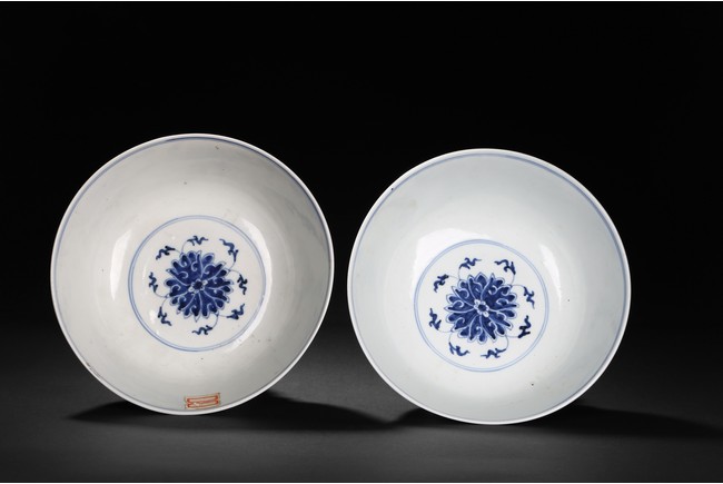 Each bowl is painted around the exterior with scrolling stylised foliage borne on lotus blooms.The interior is decorated with a matching central medallion. Late Qing Dynasty period.
