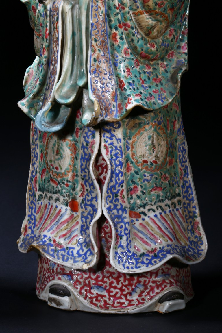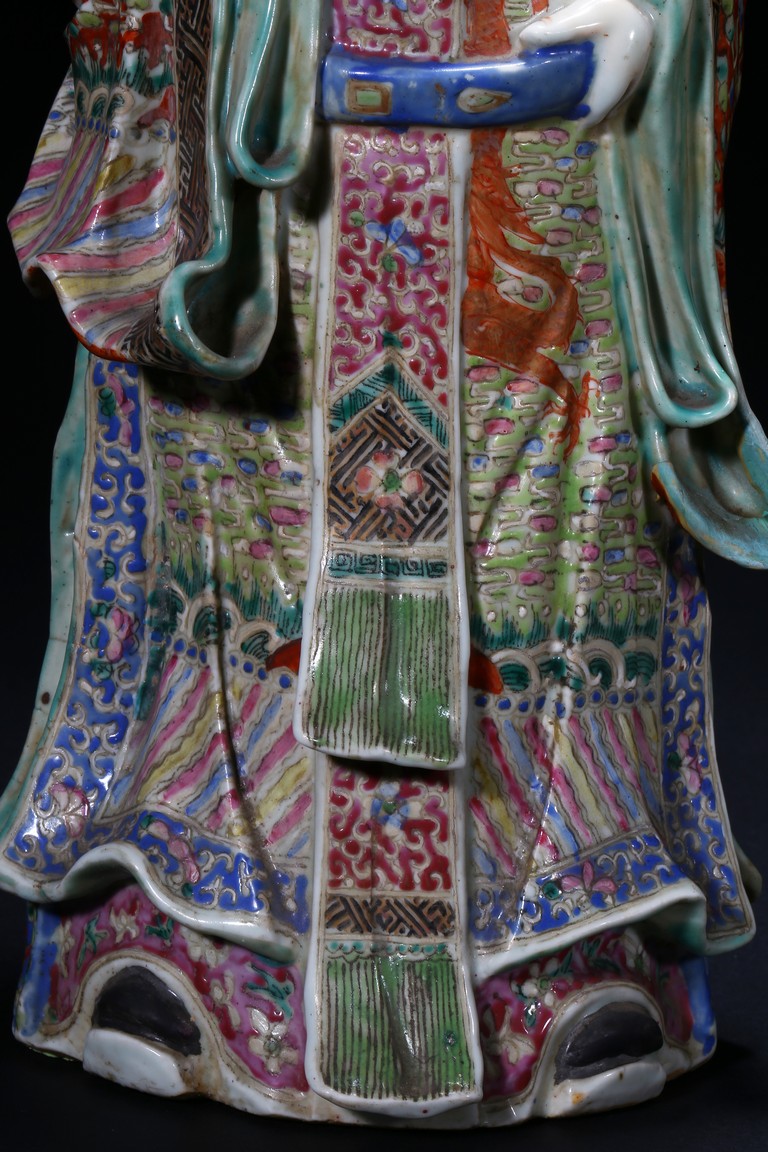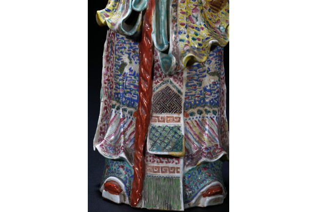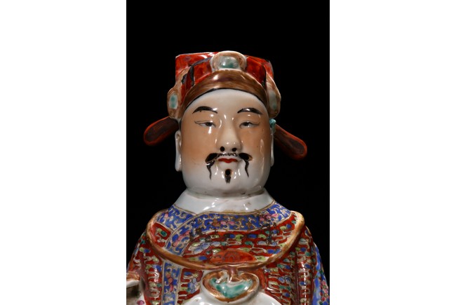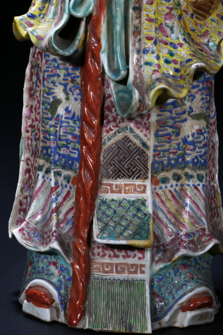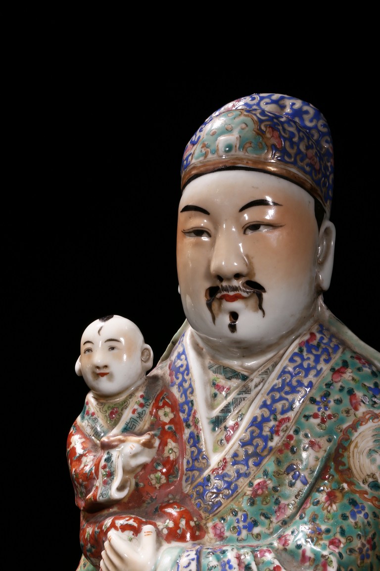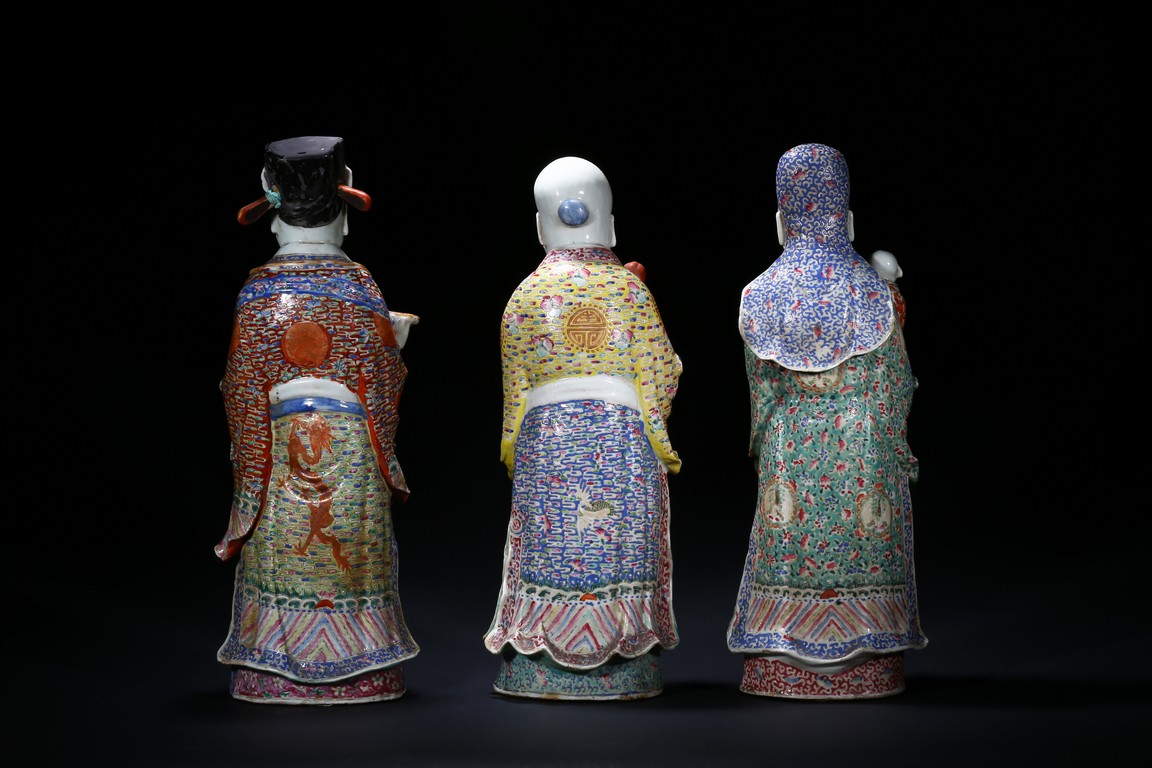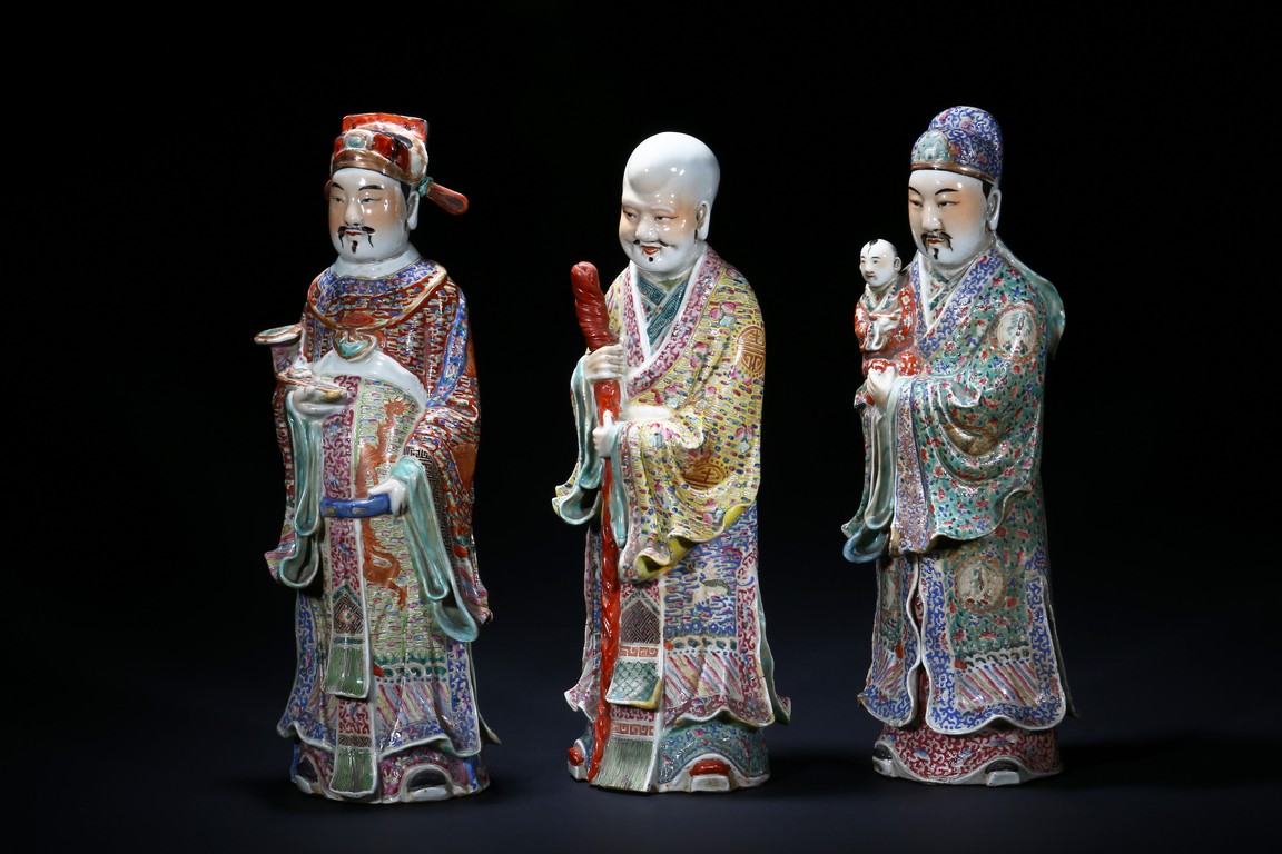 Depicting Shou (longevity) as a bald and white-bearded old man with the staff, Fu (wealth) lifting a baby who grasps a gold ingot and Lu (official status) holding a scepter in his left hand and grasping his official's belt with his right hand (Lu's bonnet lacking crossbar). Republic period.