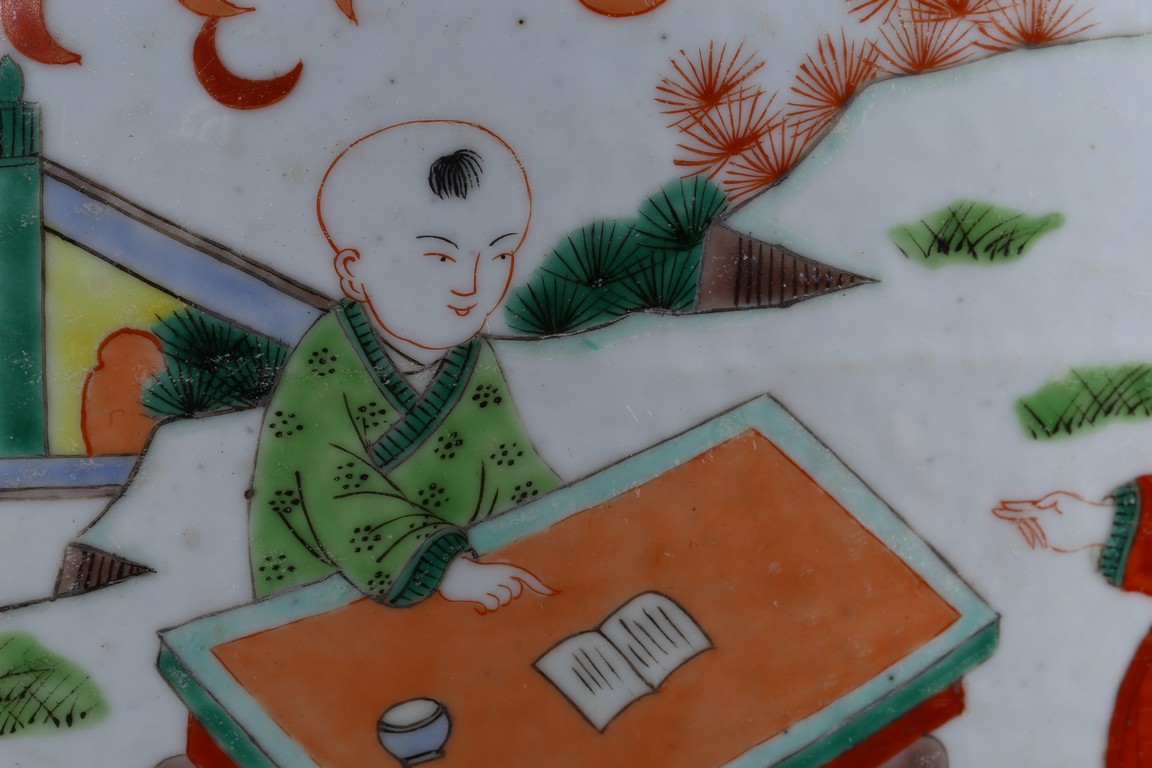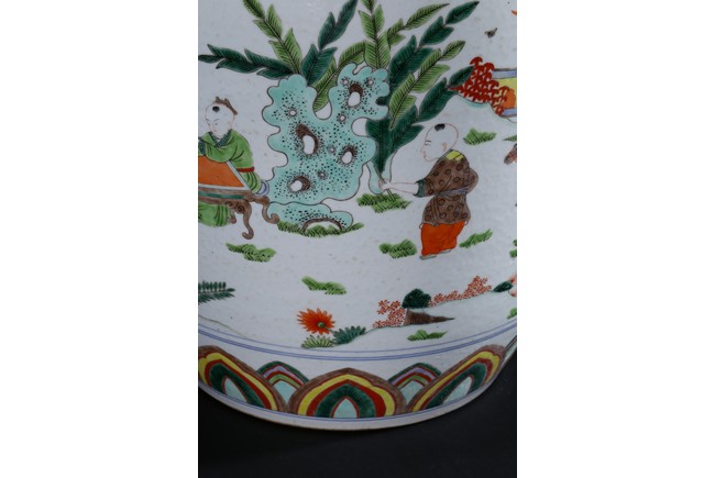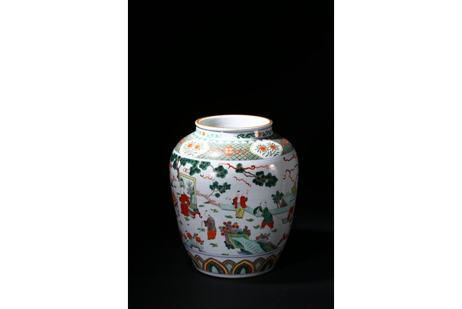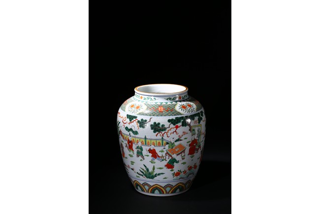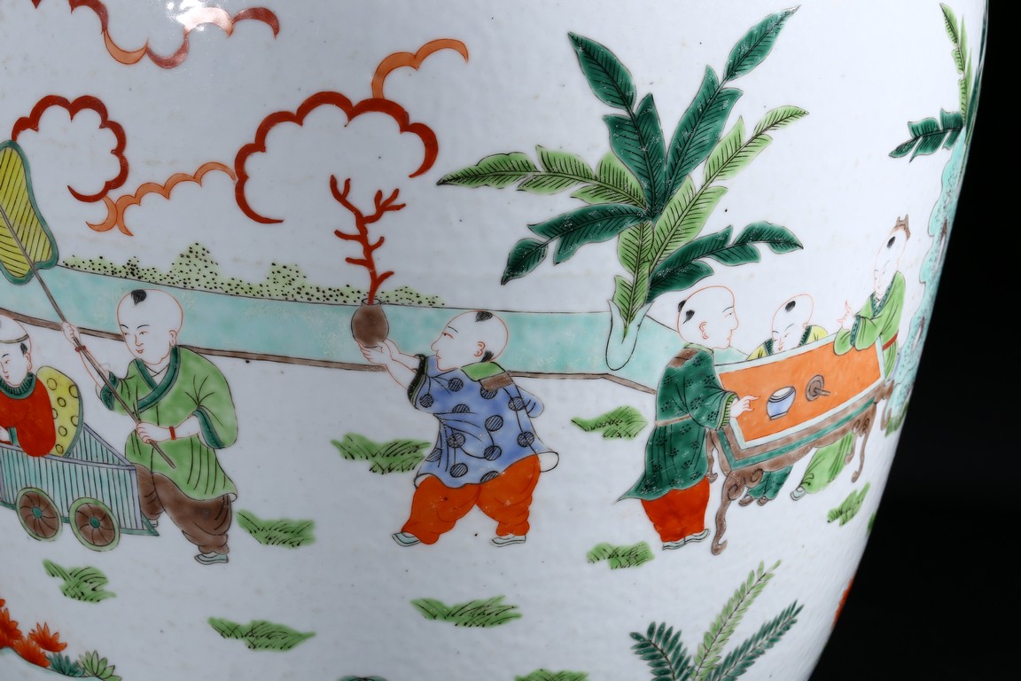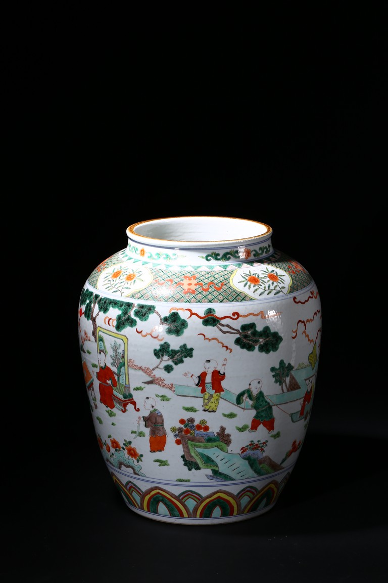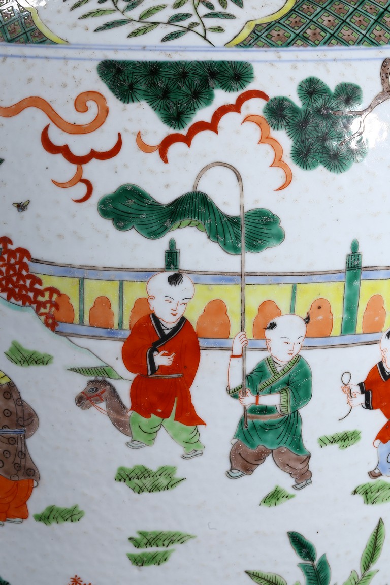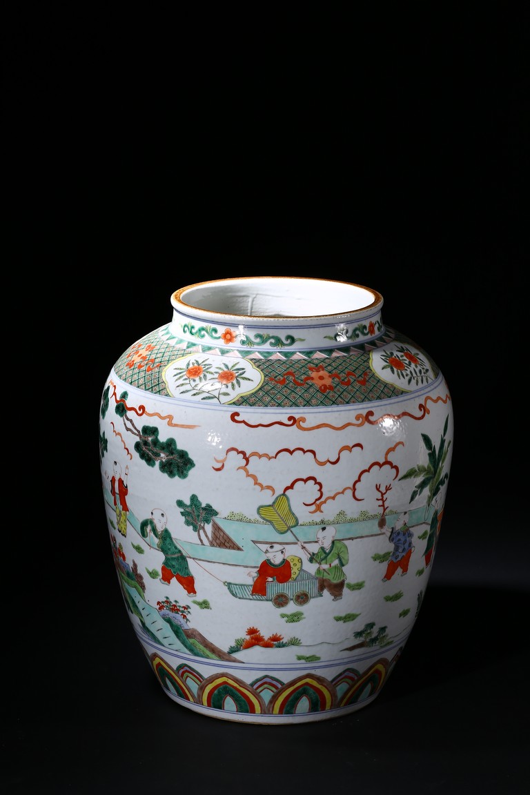 The ovoid body surmounted by tapered neck, exterior finely painted with boys engaging in playful activities in an outdoor garden setting with rockworks and pine trees, the shoulder decorated with a frieze of four similarly decorated cartouches against a diaper ground at the shoulder. Qing Dynasty period.