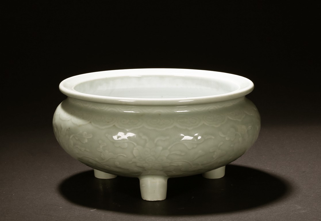 Supported on three short feet, the body is of compressed globular form, body finely carved with a band of continuous scroll lotus in relief, below a ruyi-head band below the rim.