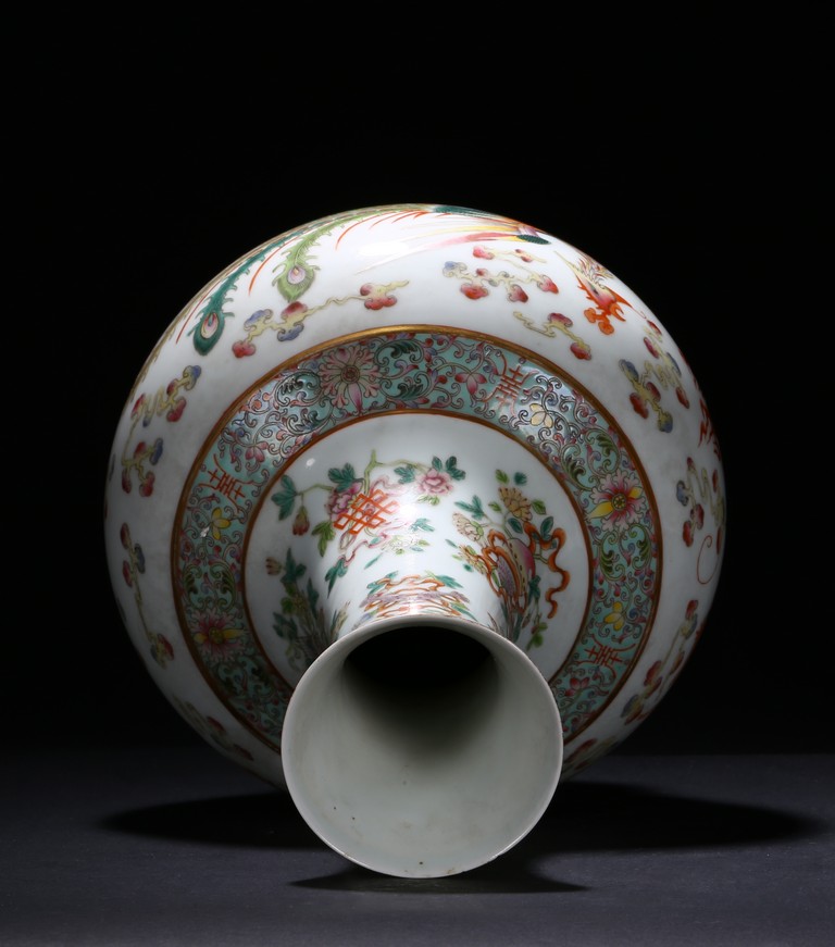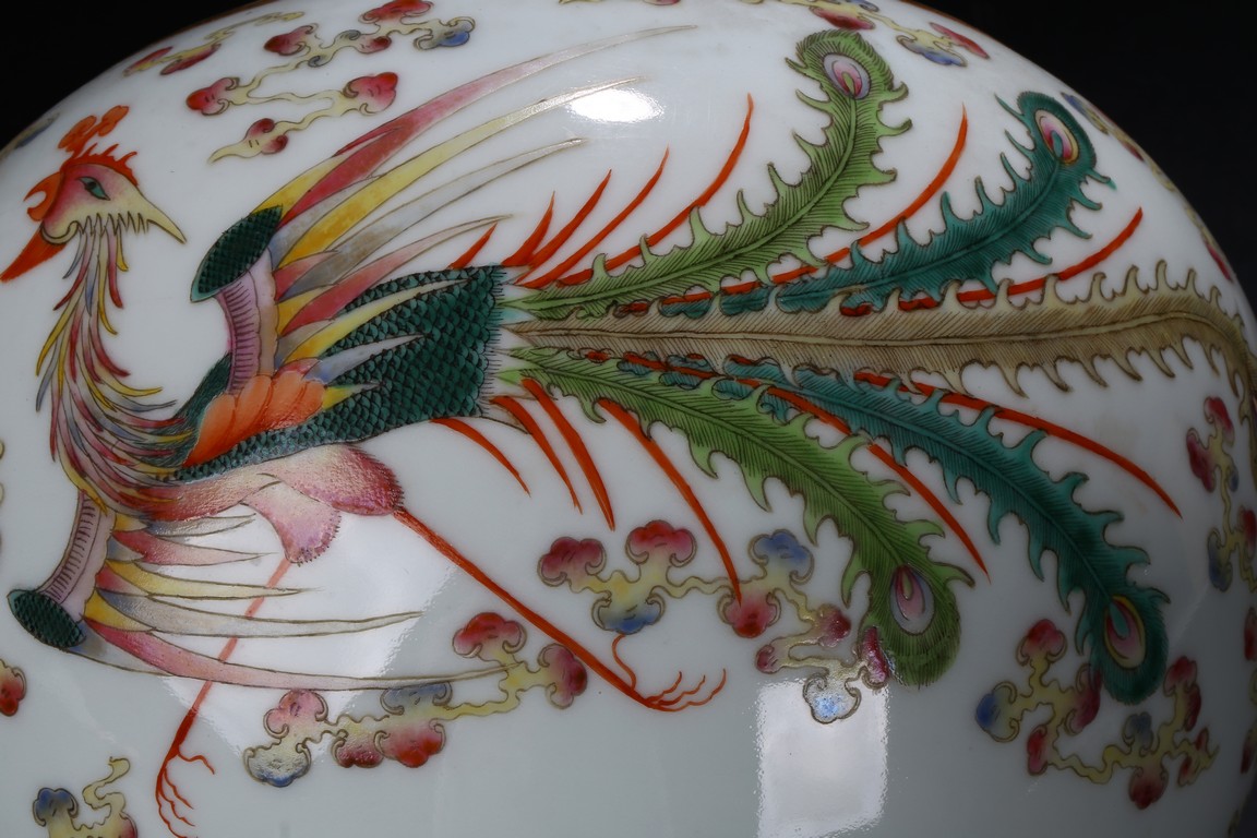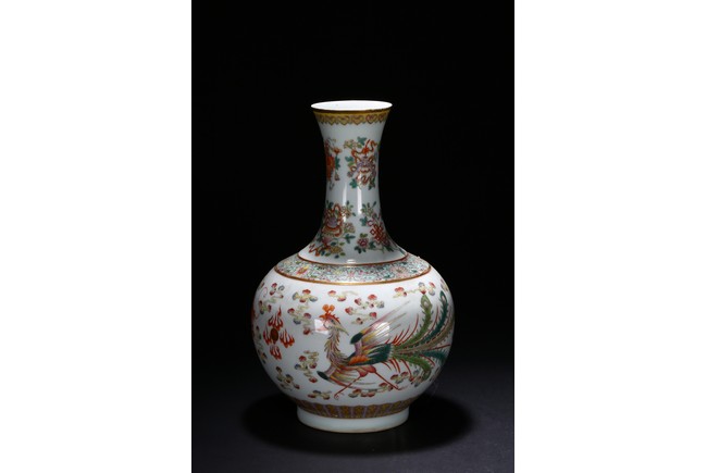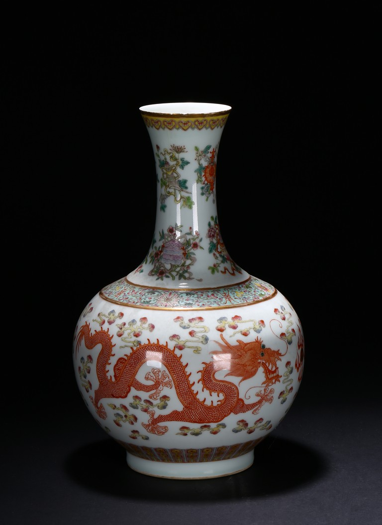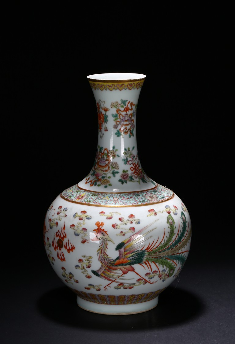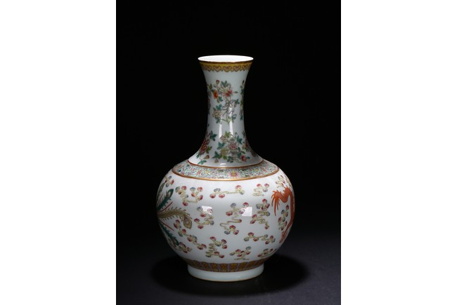 The globular body supported on a slightly splayed foot, decorated around the exterior with a five-clawed dragon and a large phoenix, all among clouds, the neck painted with the 'Eight Buddhist Emblems' wreathed by flowering sprays, the gilt rim encircled by yellow ruyi, the base inscribed in underglaze blue with a six-character reign mark.