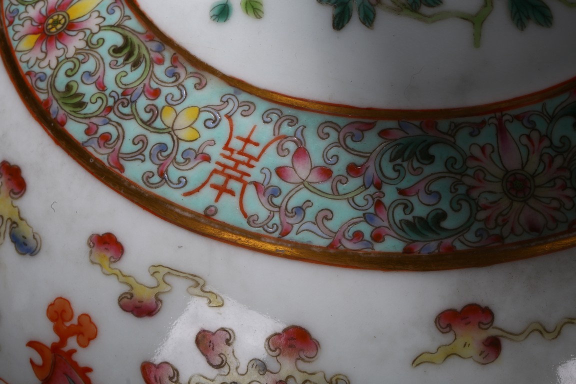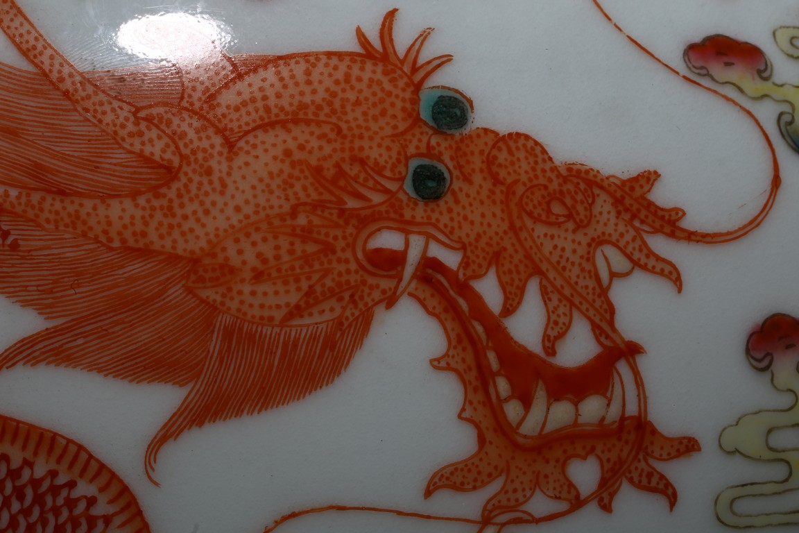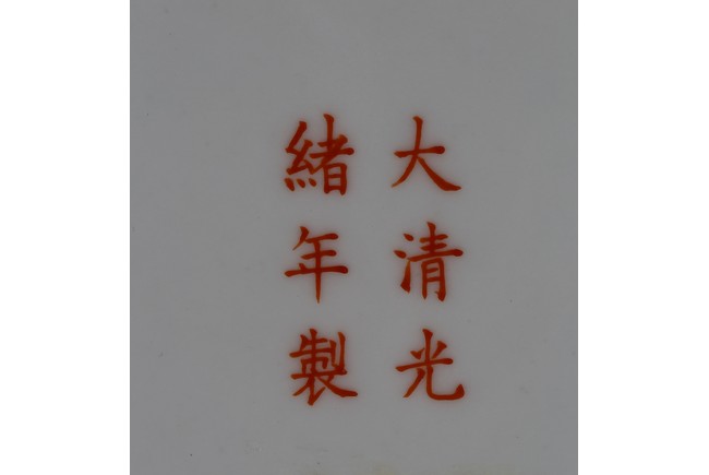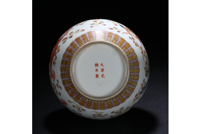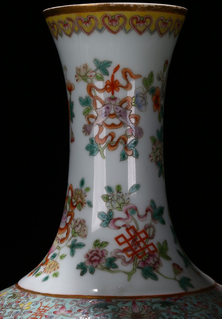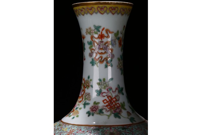 The globular body supported on a slightly splayed foot, decorated around the exterior with a five-clawed dragon and a large phoenix, all among clouds, the neck painted with the 'Eight Buddhist Emblems' wreathed by flowering sprays, the gilt rim encircled by yellow ruyi, the base inscribed in underglaze blue with a six-character reign mark.