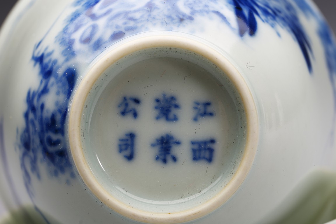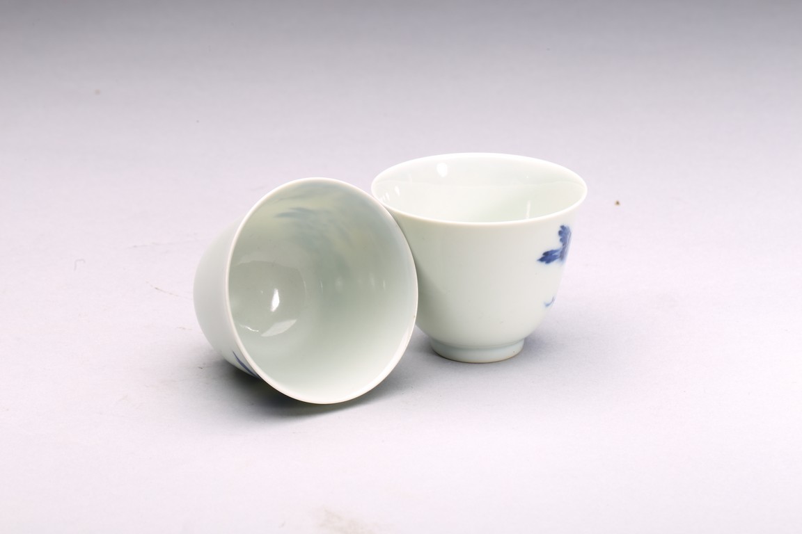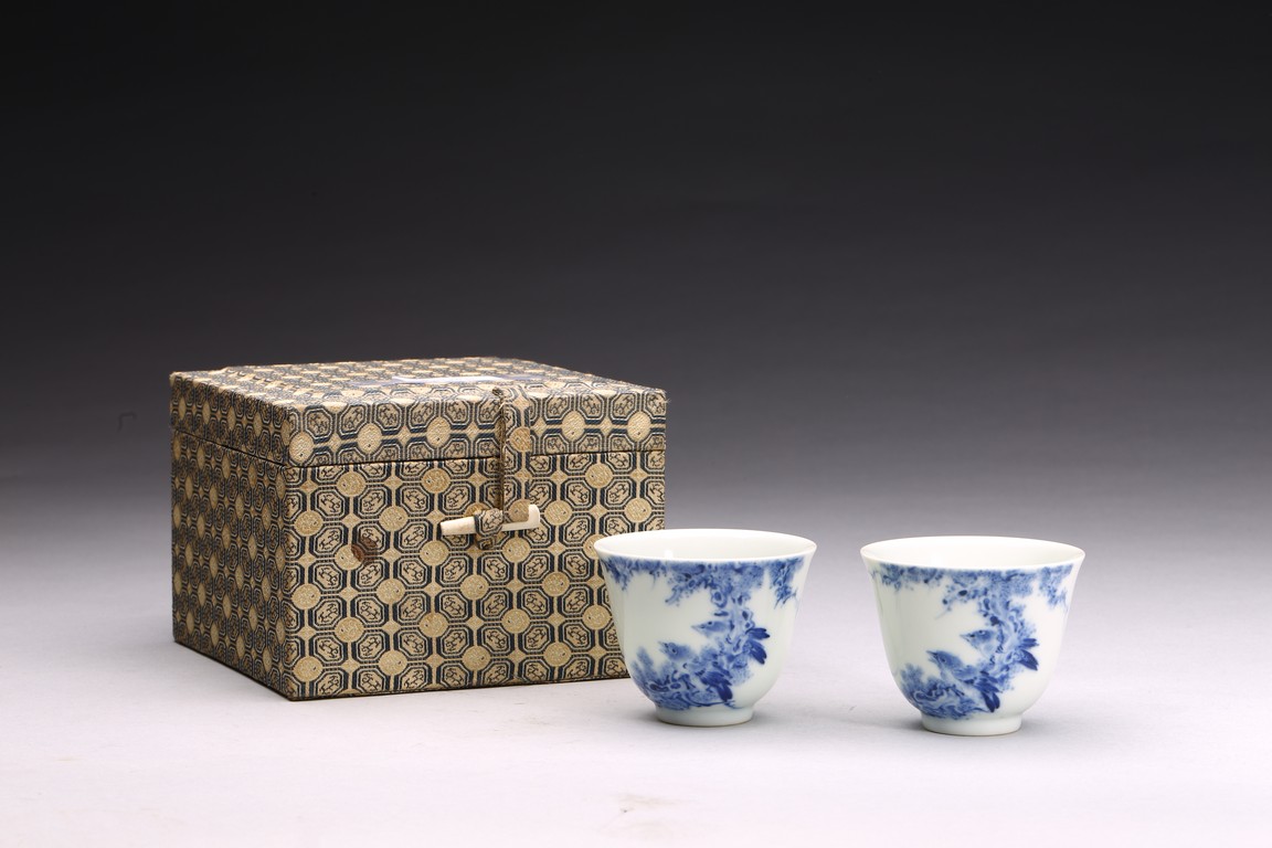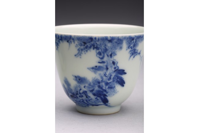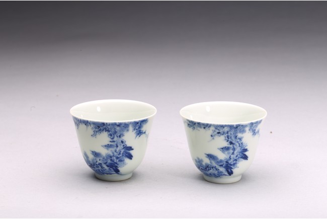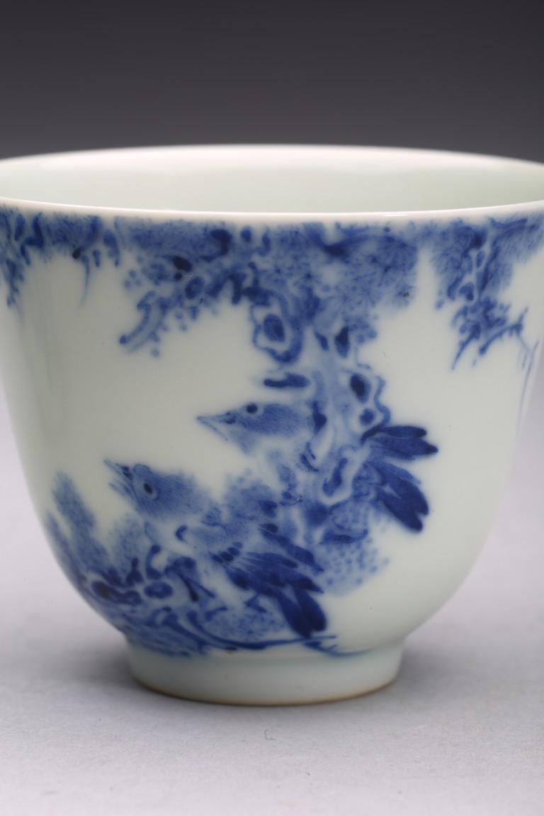 Each cup is finely potted with deep sides rising to a slightly everted rim, the exterior decorated with a magpie flying towards two magpies perching on branch, base with mark. Republic period.