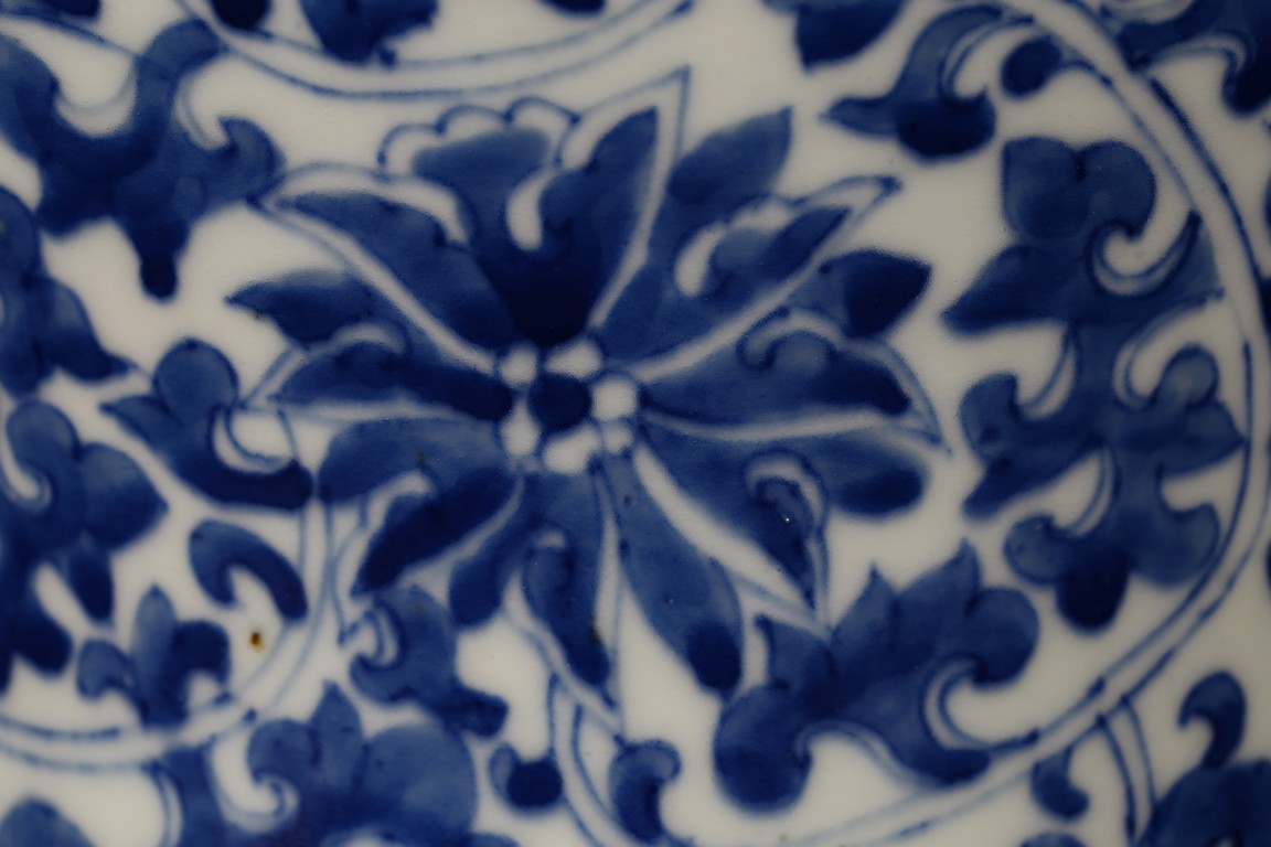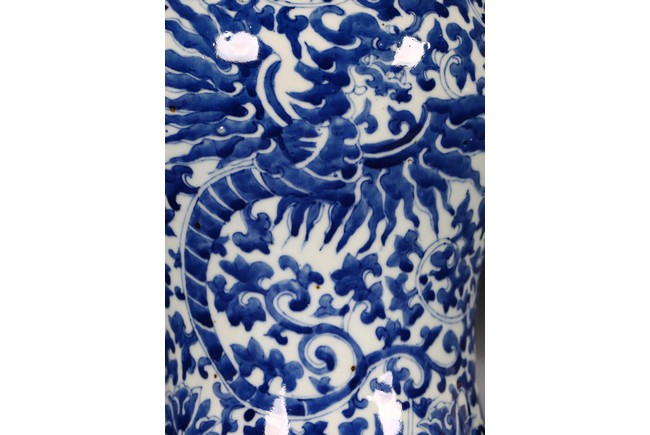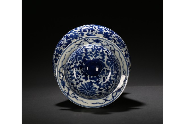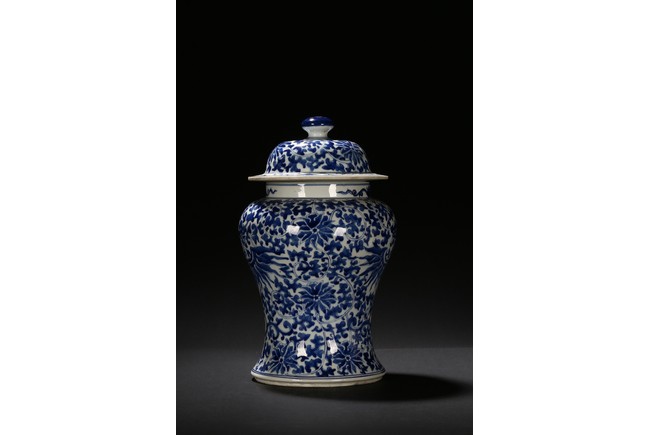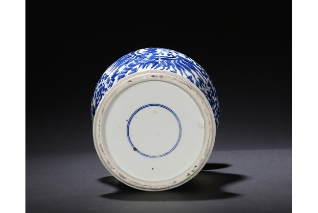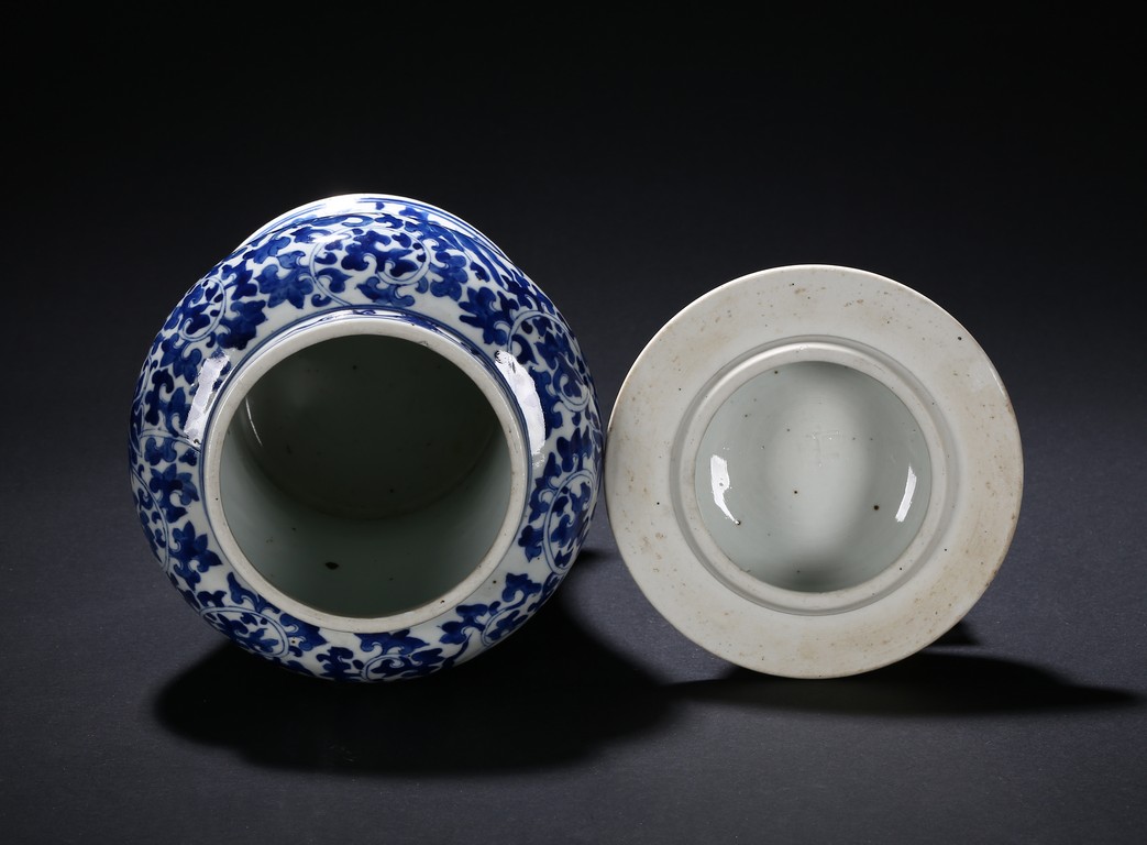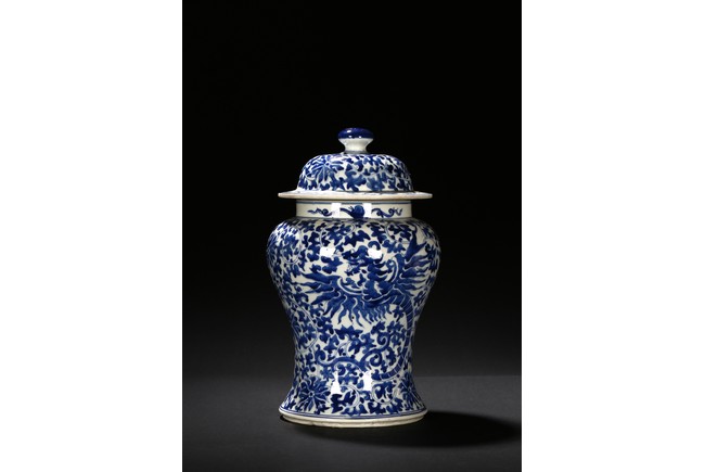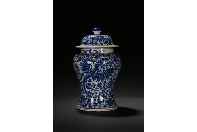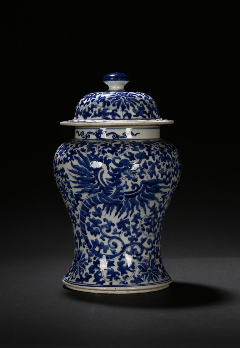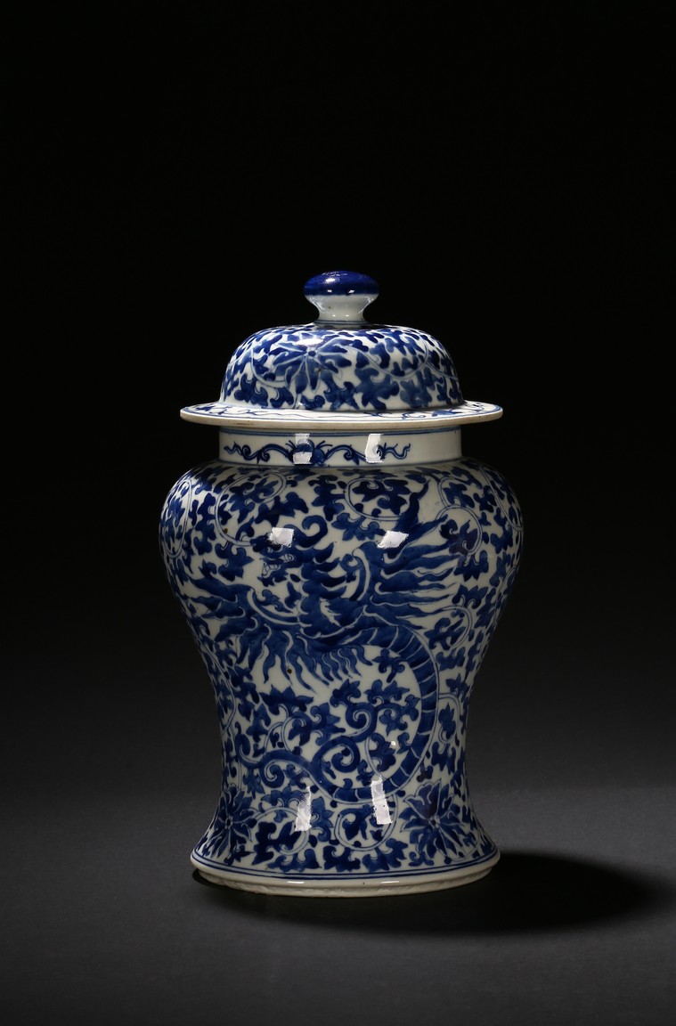 Of baluster form, brightly painted around the exterior with two mythical beast with dragon head and phoenix body, reserved on a dense leafy lotus scroll ground, the domed cover similarly decorated and surmounted by a circular finial. Qing Dynasty period.