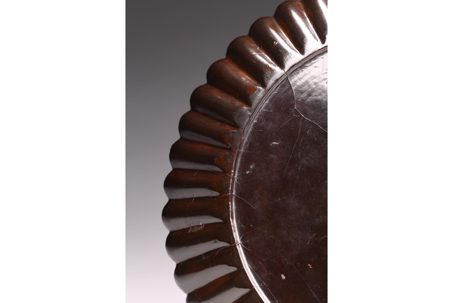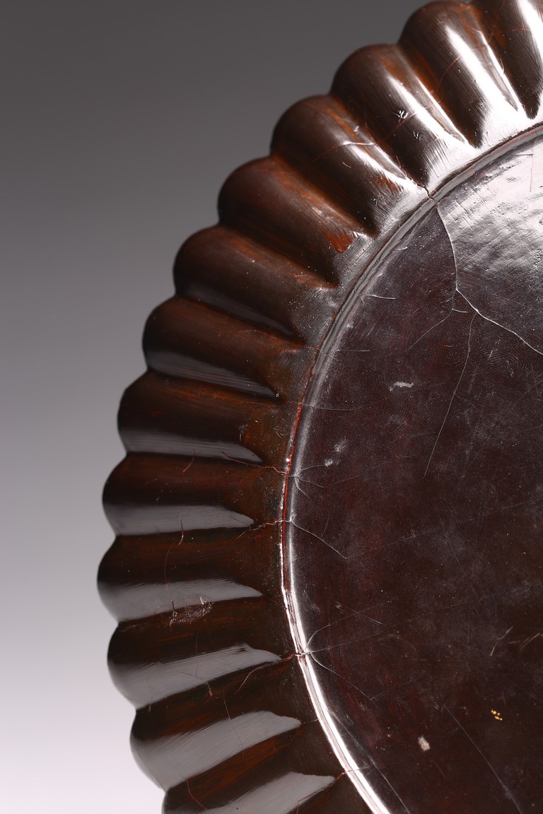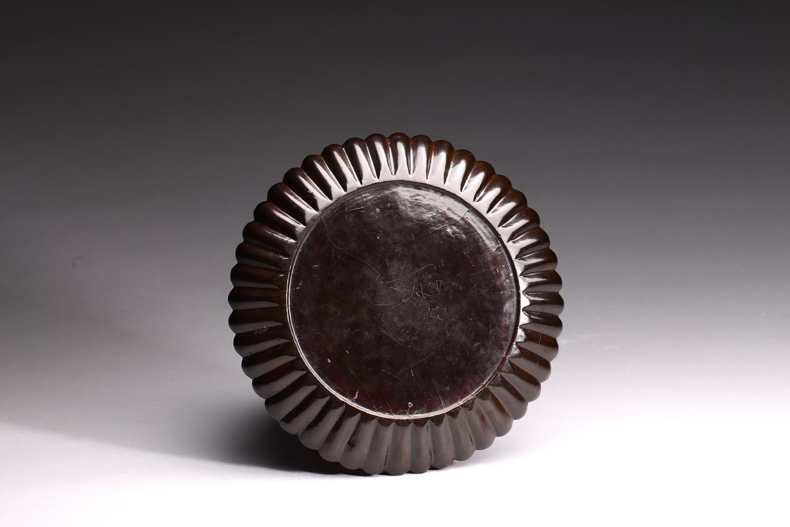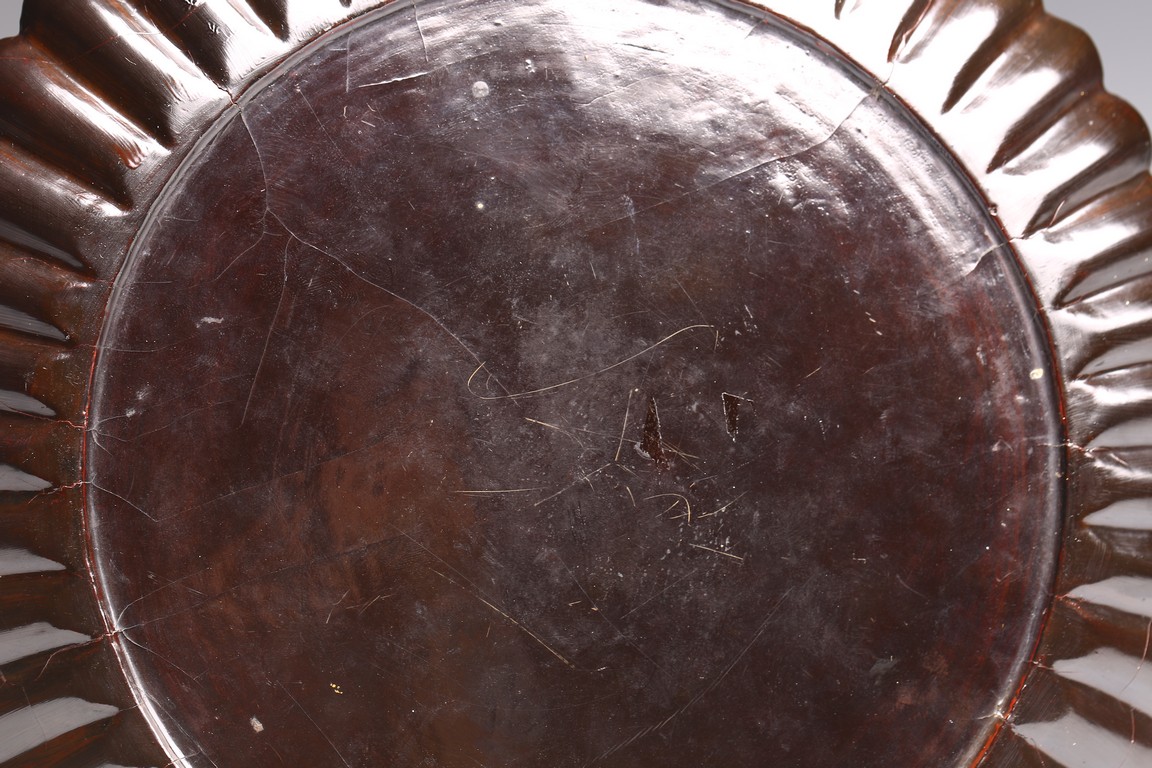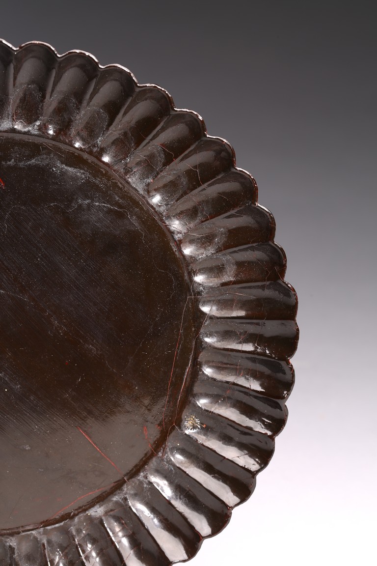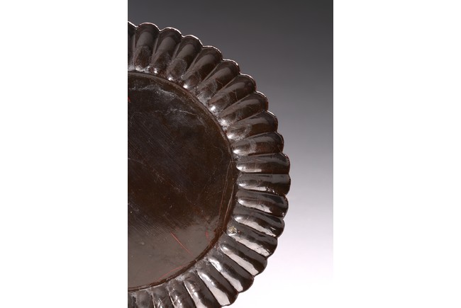 Ming Dynasty period. The dish delicately modelled with numerous lobes resembling radial chrysanthemum petals, all supported on countersunk base, overall covered in lustrous black lacquer, with age-related cracks and scratches.