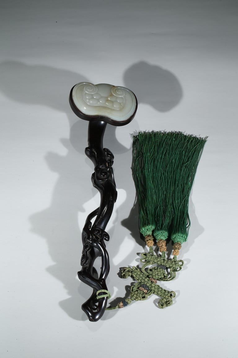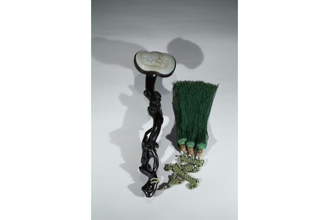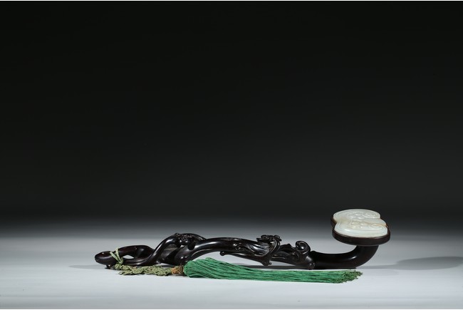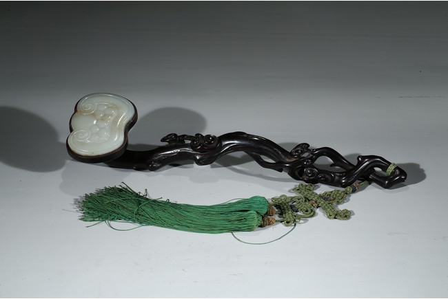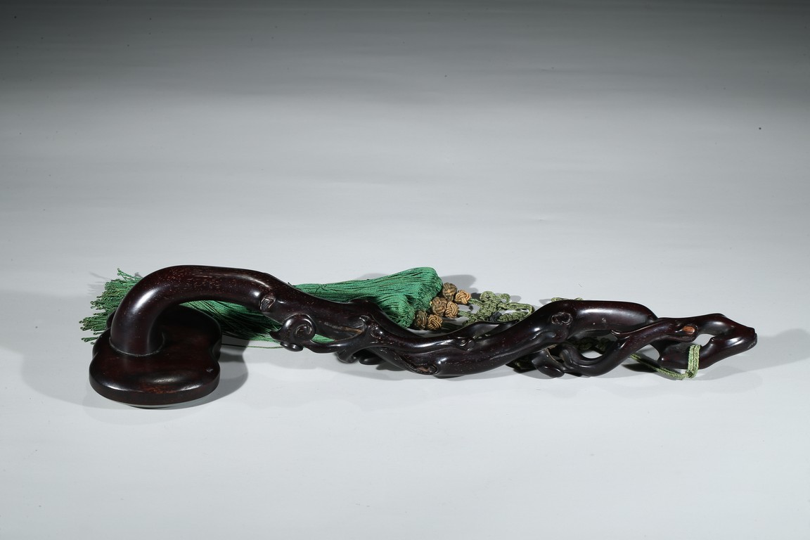 Carved in the form of gnarled lingzhi branch, the ruyi head inlaid with jade plaque.