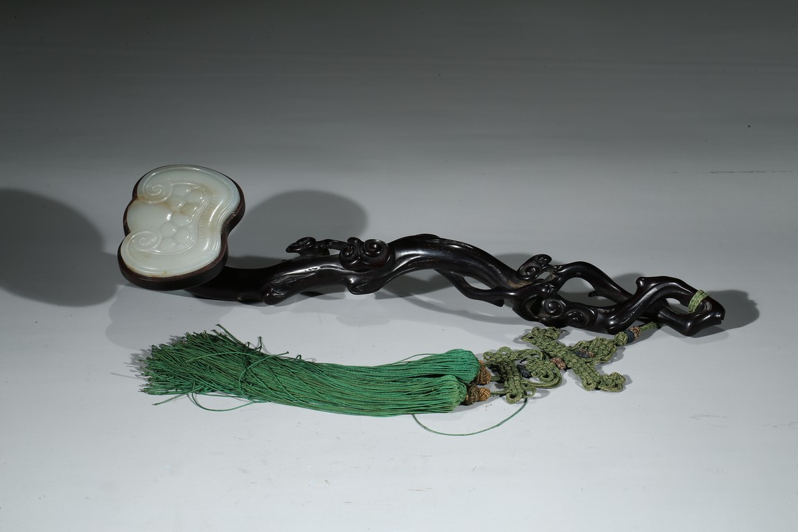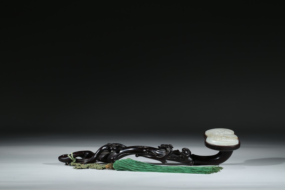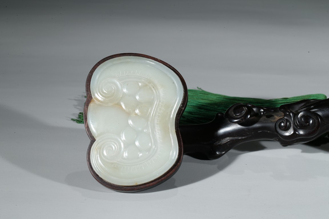 A ZITAN JADE INLAID LINGZHI RUYI SCEPTER 紫檀嵌玉靈芝如意