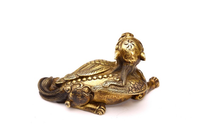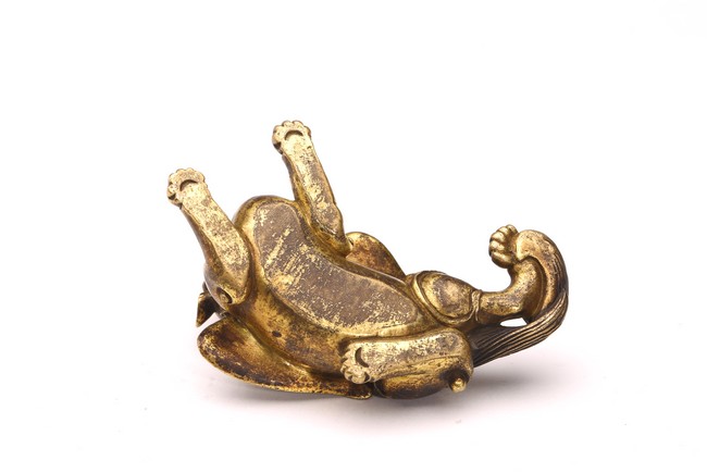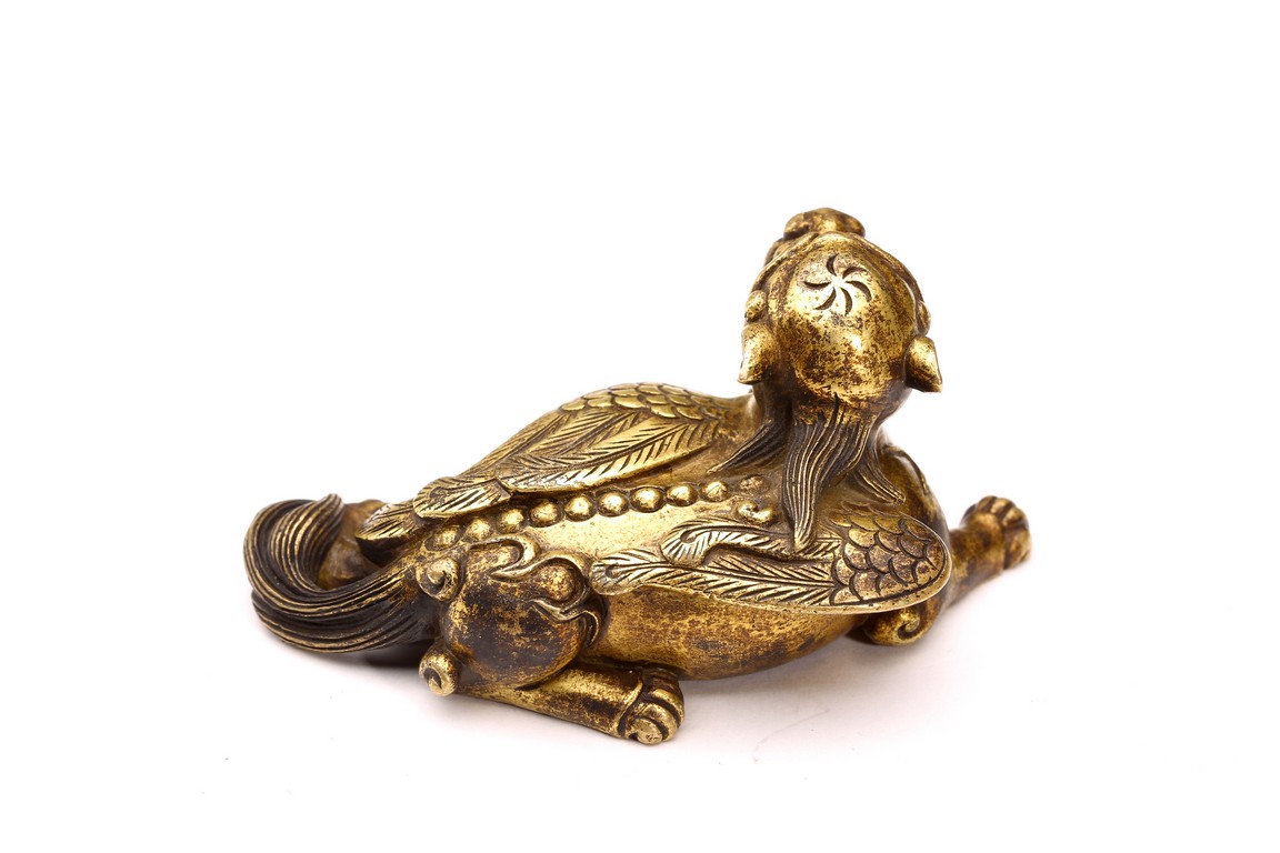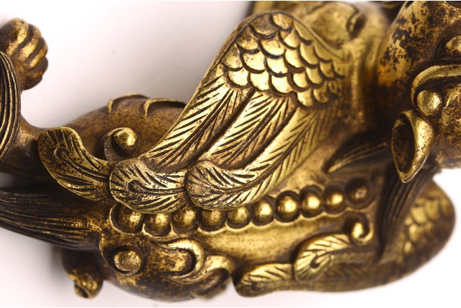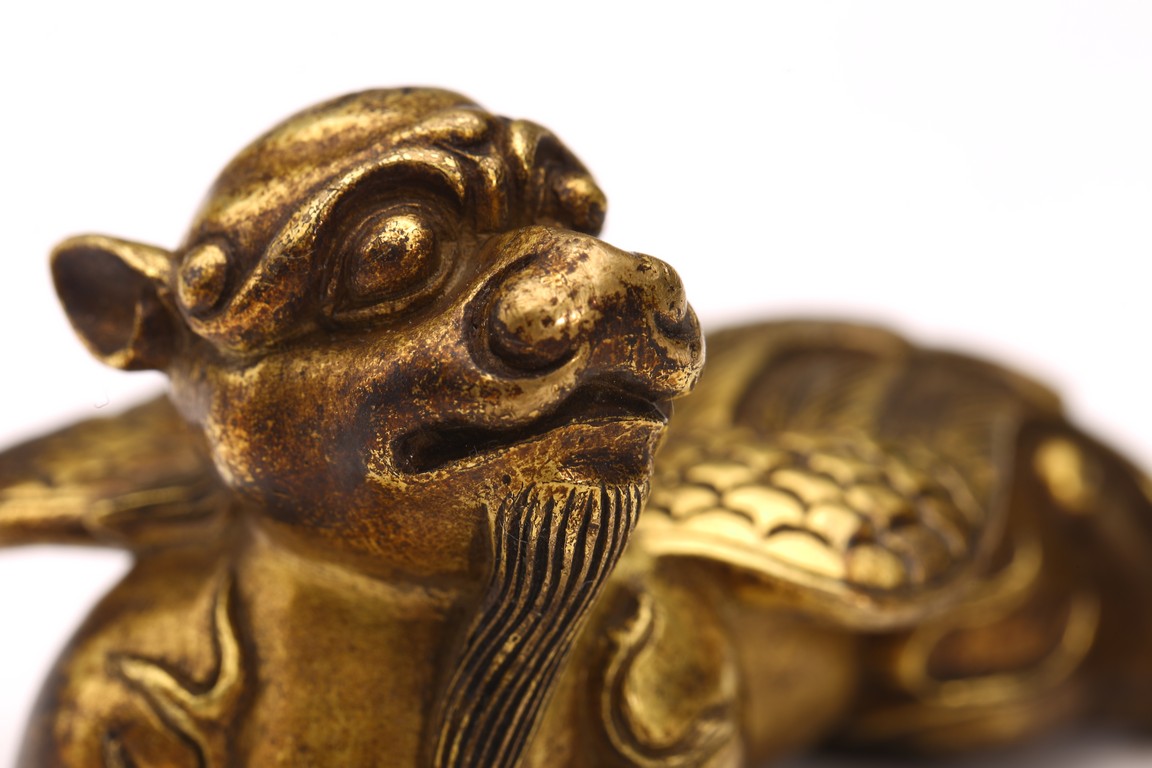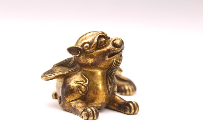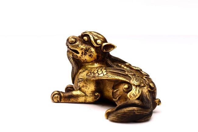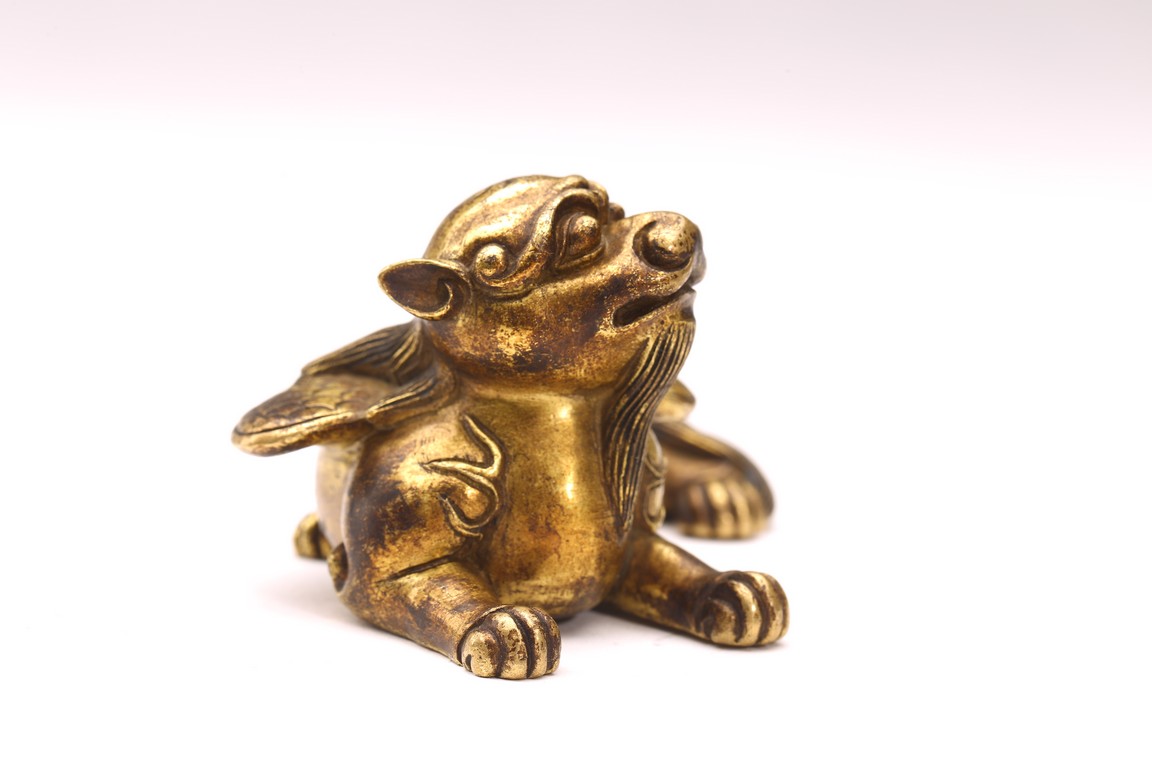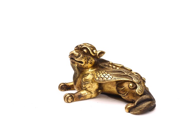 The recumbent buddhist lion with outstretched paws, head turned to the side, with bushy tails and body with a pair of wings.