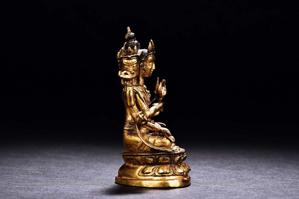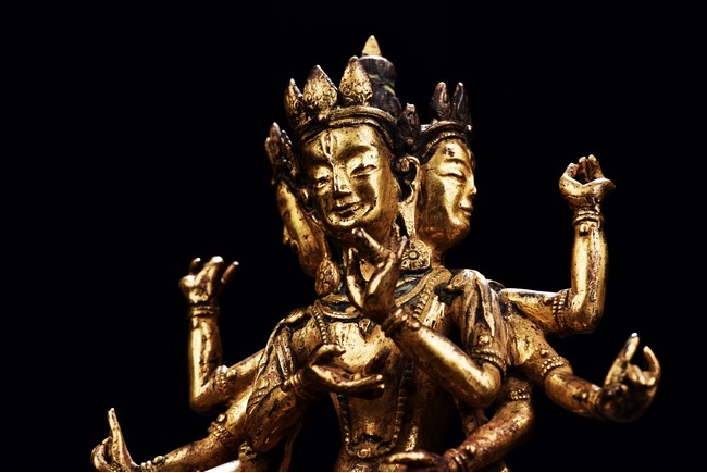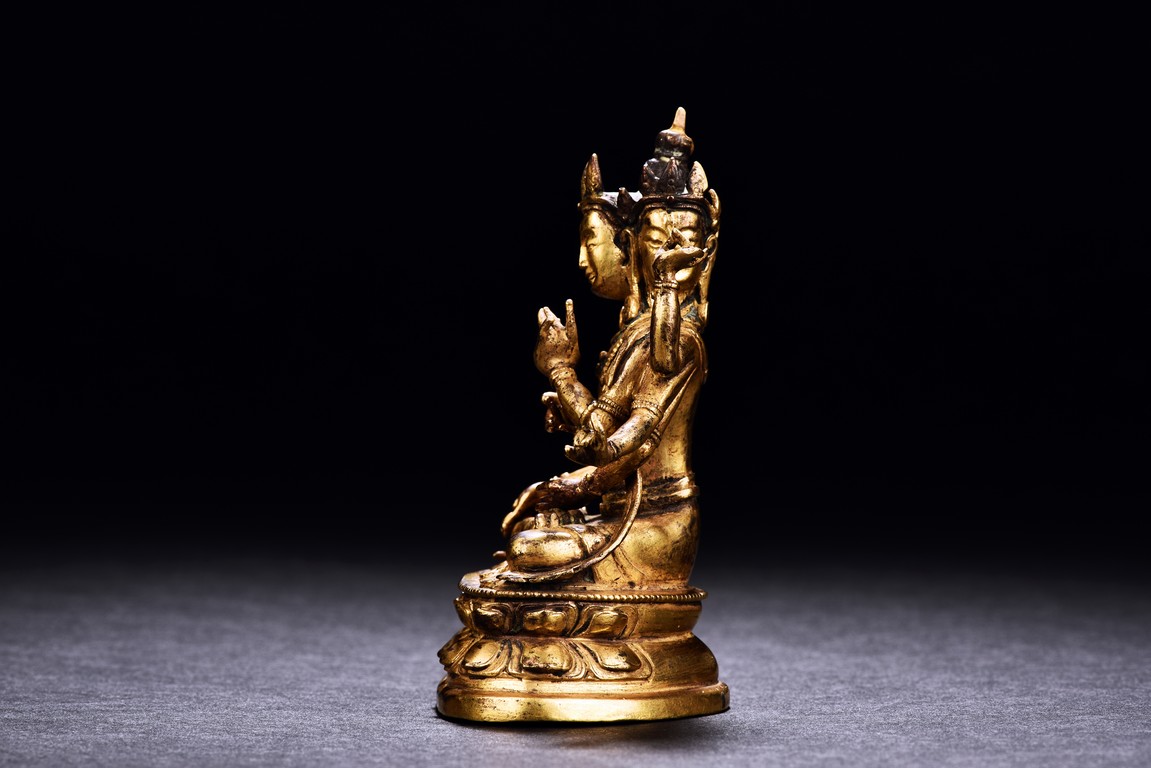 Qing Dynasty period. The three headed deity seated in dhyanasana on a double lotus base, the eight arms held in various mudras, dressed in a dhoti with elaborate jewellery, the hair piled up into a chignon crowned with a tiara.