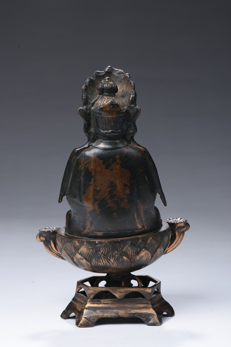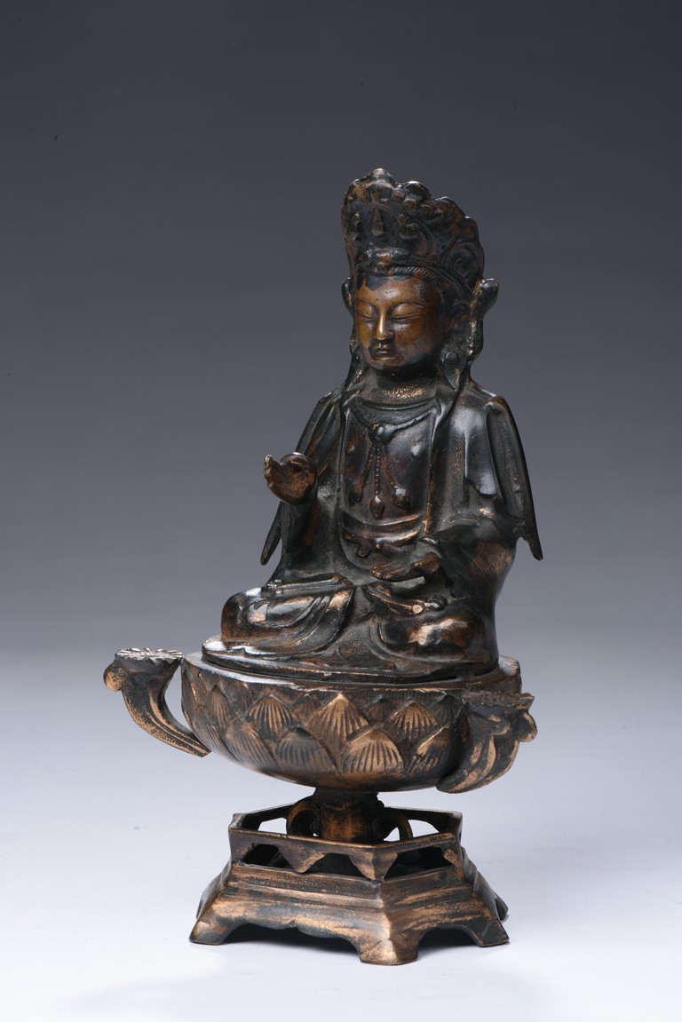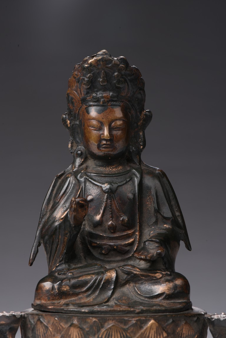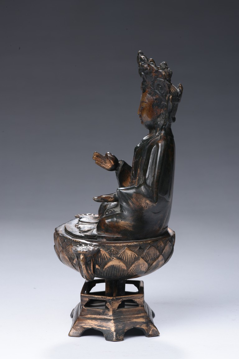 Qing Dynasty period. Shown seated on a lotus throne supported by a stand, the bodhisattva is shown in dhyanasana, hands in abhaya mudra , wearing long and voluminous robe, chest adorned with beaded jewelry, the face shown in meditative expression, wearing a crown with a seated Amitabha at center.