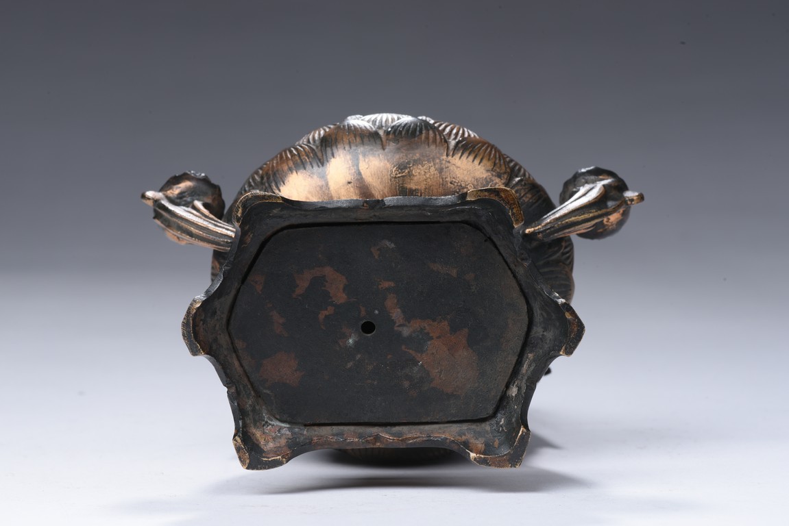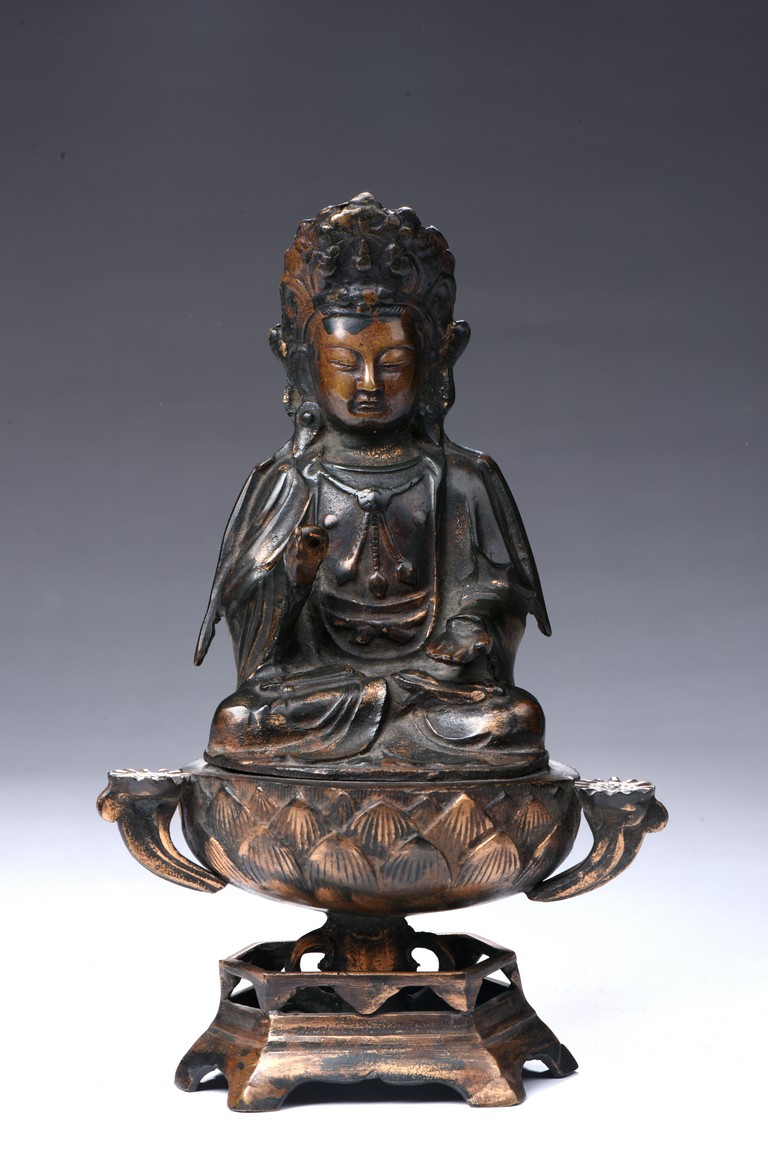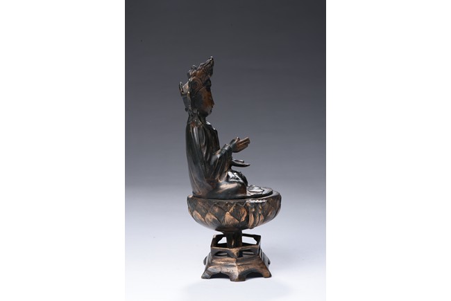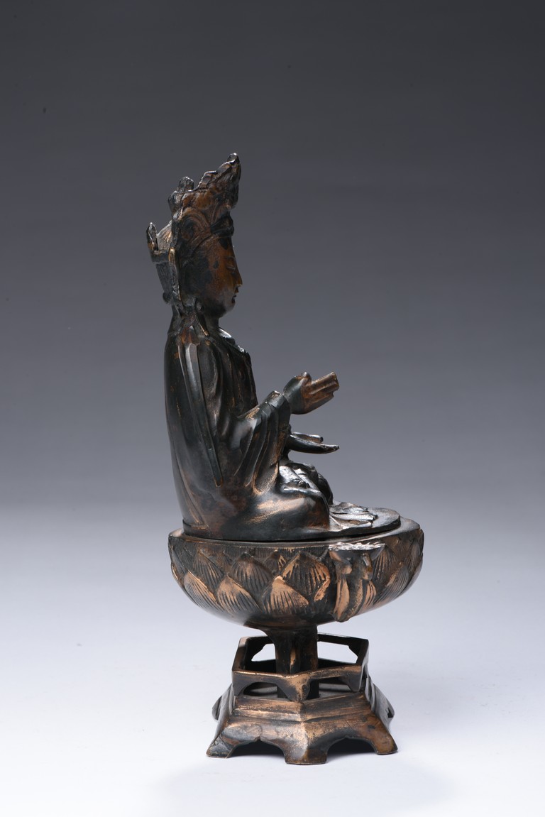 Qing Dynasty period. Shown seated on a lotus throne supported by a stand, the bodhisattva is shown in dhyanasana, hands in abhaya mudra , wearing long and voluminous robe, chest adorned with beaded jewelry, the face shown in meditative expression, wearing a crown with a seated Amitabha at center.
