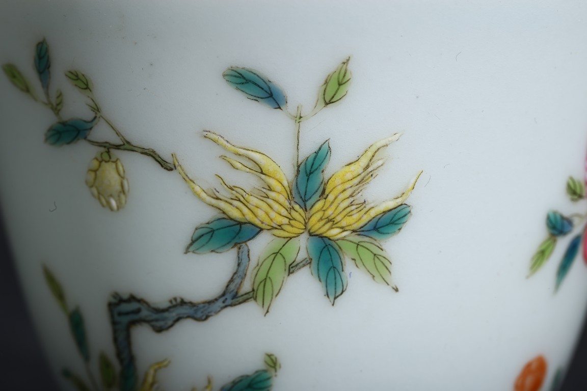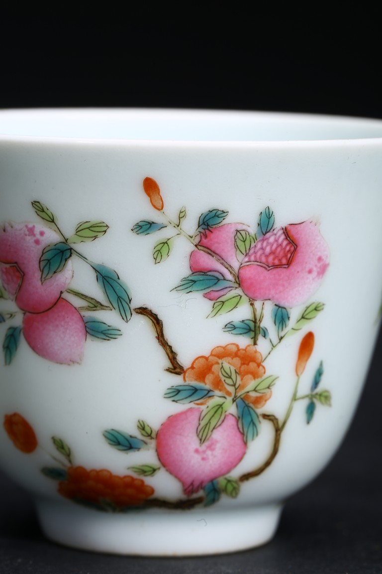 Qing Dynasty period. Each cup finely painted a plum tree, a pomegranate tree, and a bergamot tree.