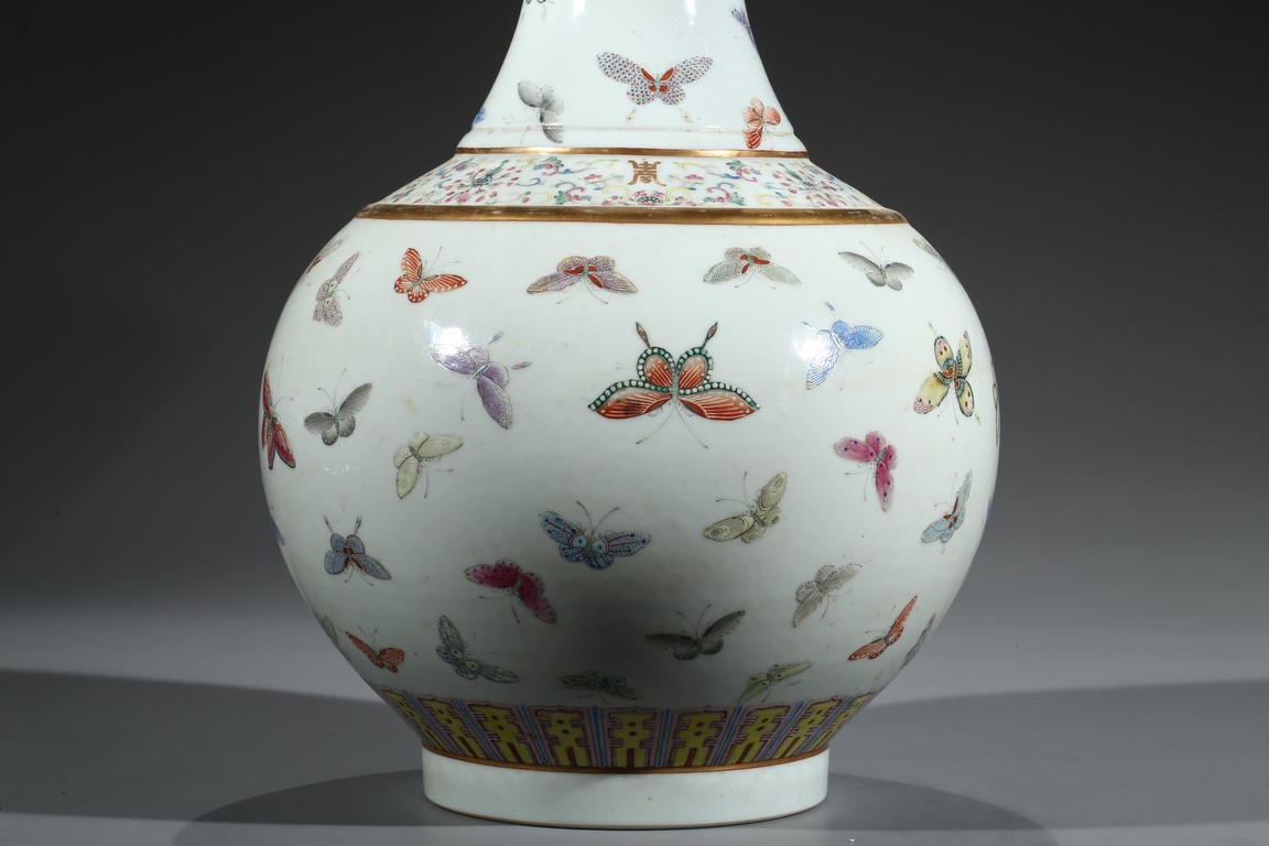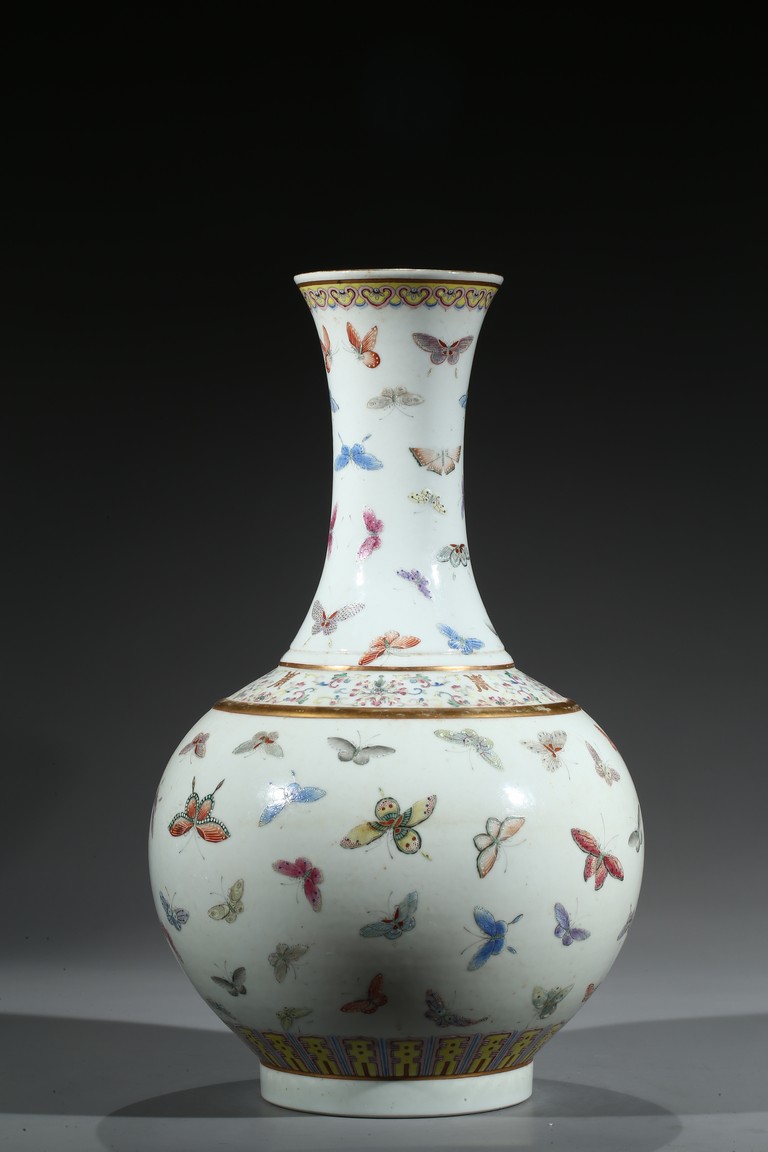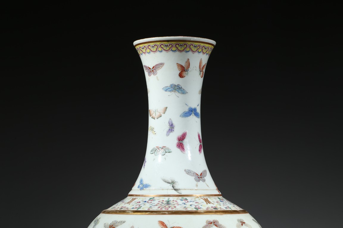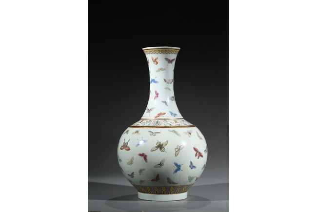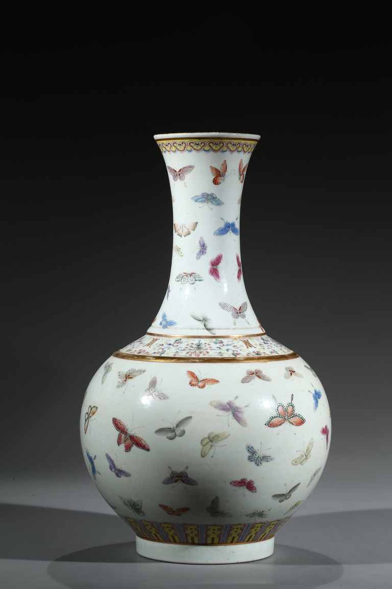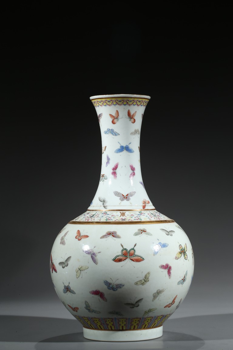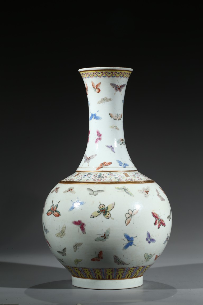The compressed globular body rising from a short foot to a tall waisted neck, decorated with the ‘Hundred butterflies’ design divided by a band of lotus scrolls and stylised shou characters at the shoulder, the rim and the foot with ruyi and lappet bands, inscribed to the base with a six-character iron-red reign mark. Qing Dynasty Guangxu period.