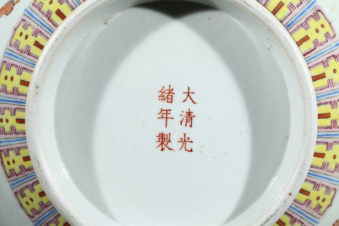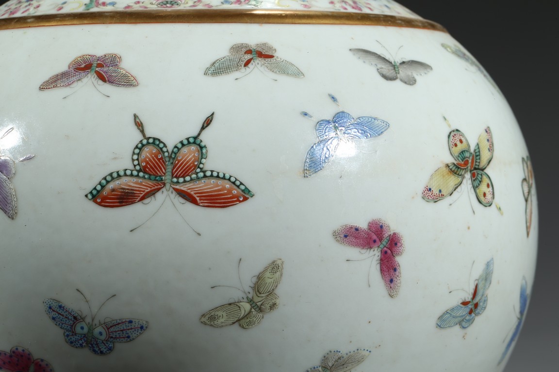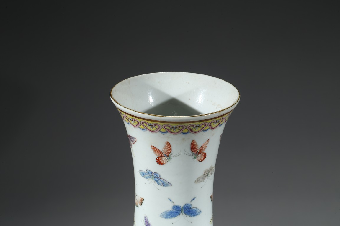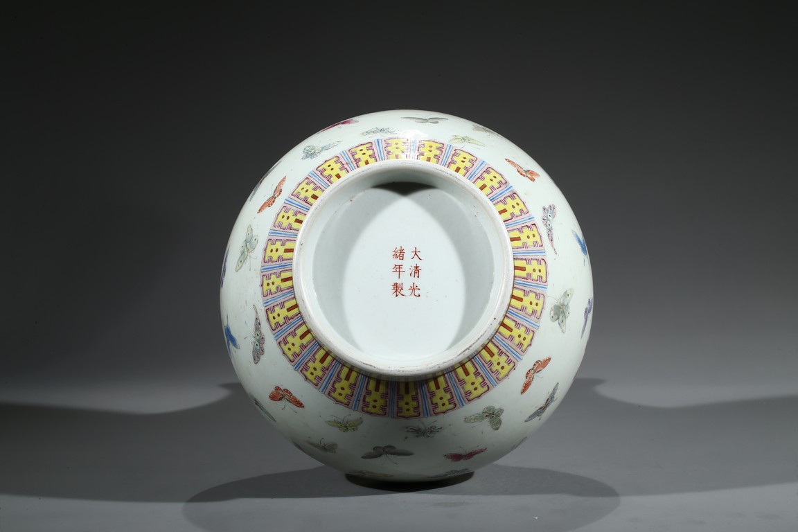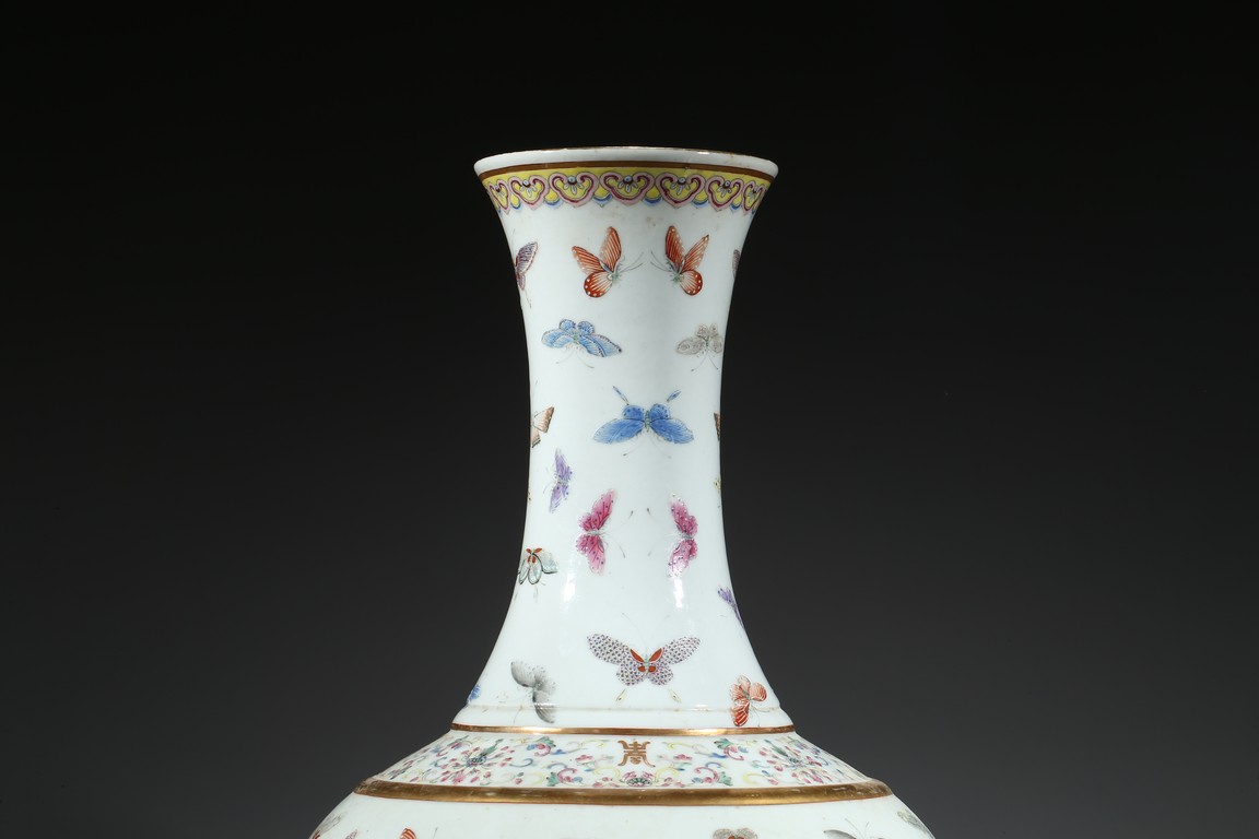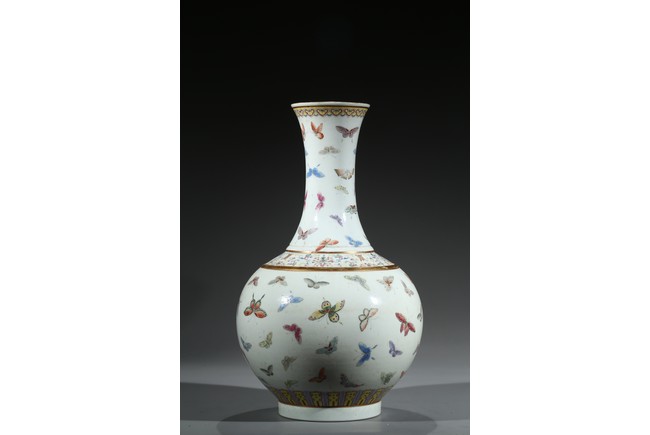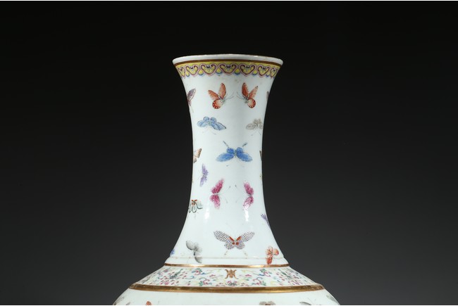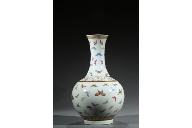The compressed globular body rising from a short foot to a tall waisted neck, decorated with the ‘Hundred butterflies’ design divided by a band of lotus scrolls and stylised shou characters at the shoulder, the rim and the foot with ruyi and lappet bands, inscribed to the base with a six-character iron-red reign mark. Qing Dynasty Guangxu period.