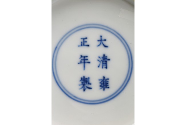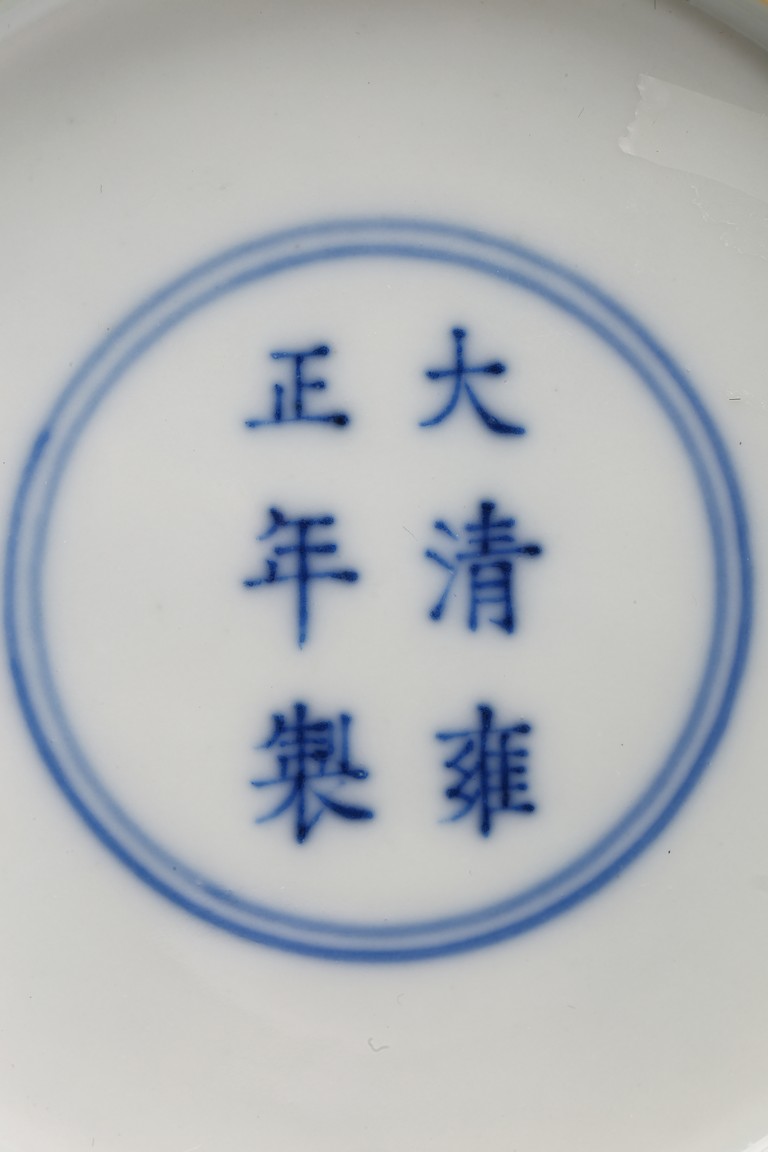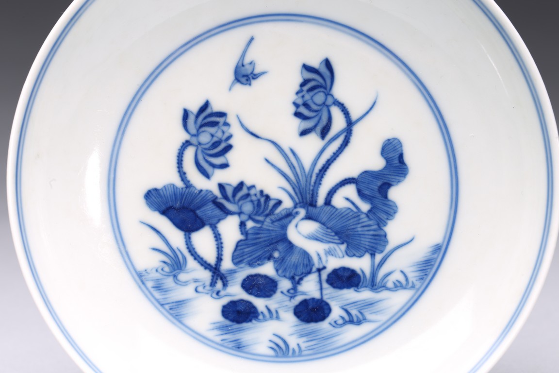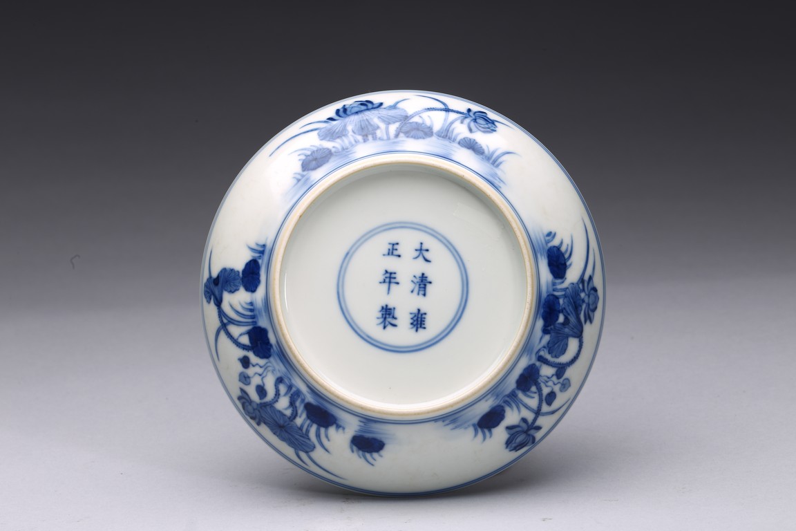 Painted in bright tones of cobalt blue to depict a scene of egret in a lotus pond, the reverse with similar scenes of lotus pond decorations, the base with six character Yongzheng mark. Qing Dynasty period.