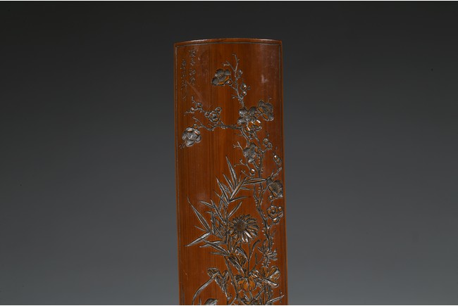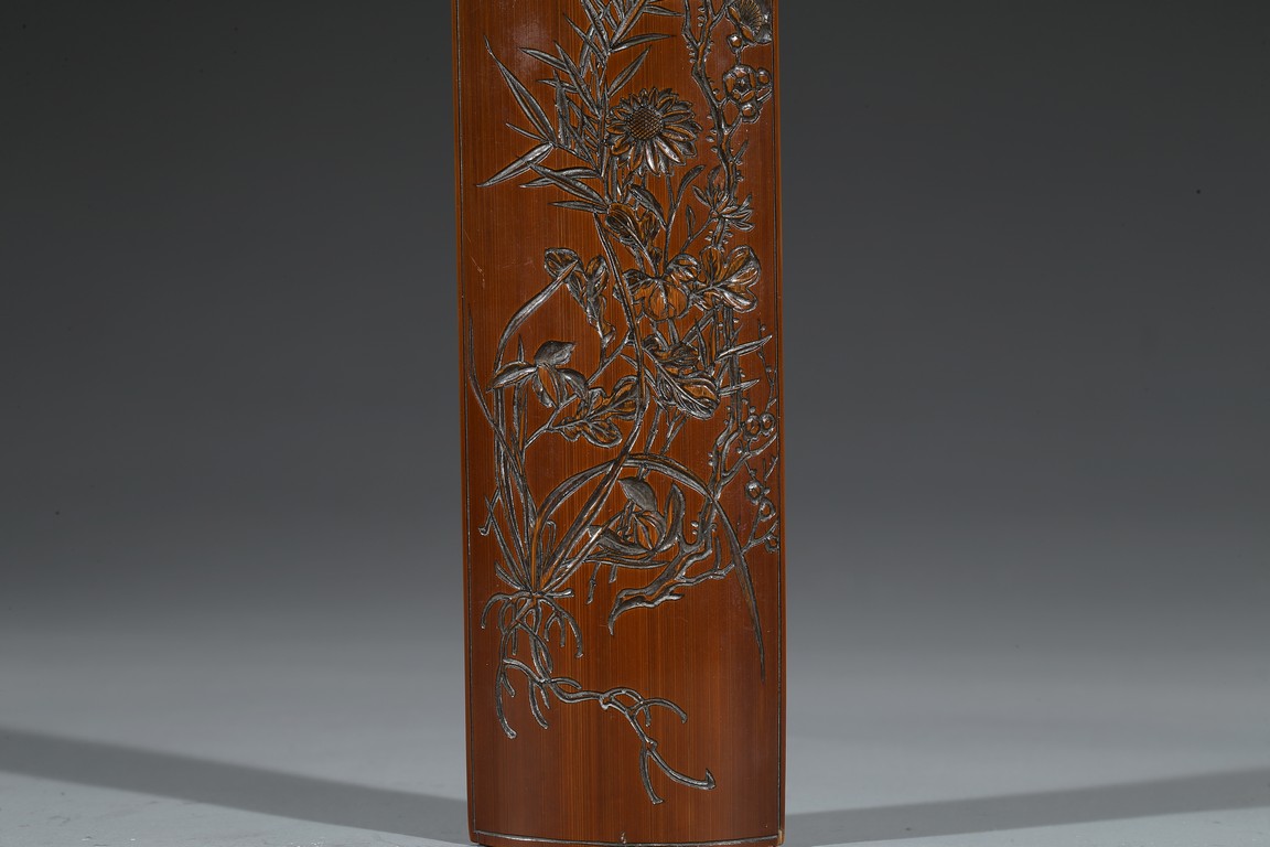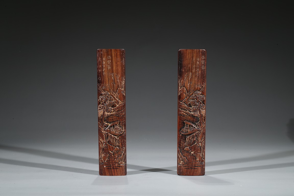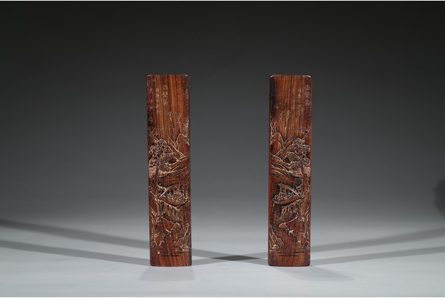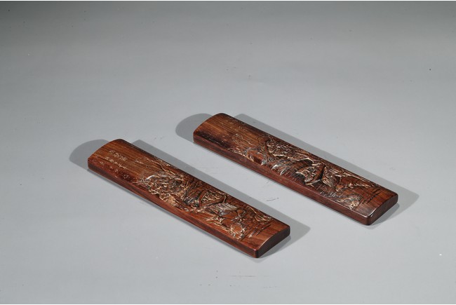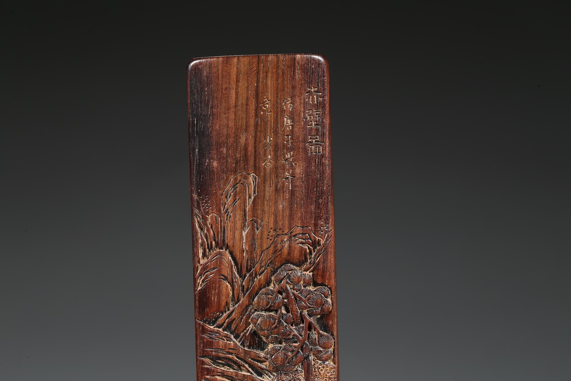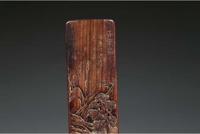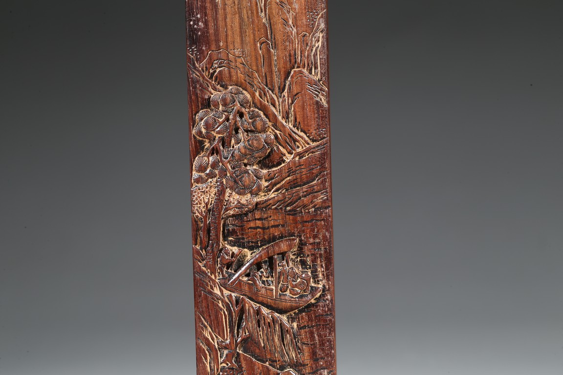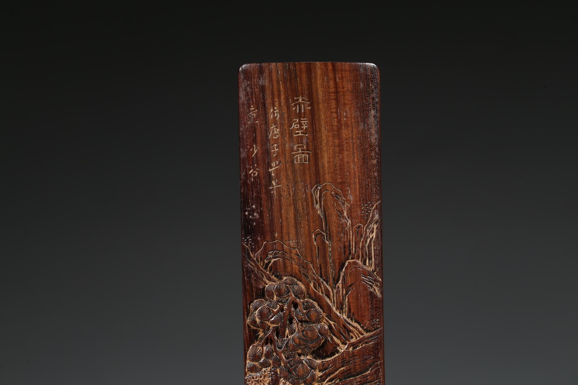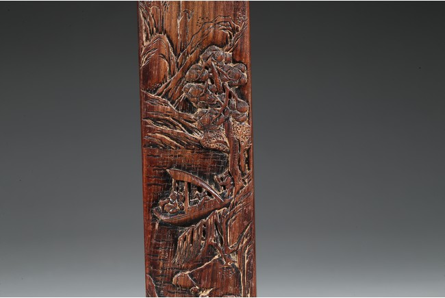 Of rectangular form, one side carved in relief with figures on a boat in a river setting, with cliff and mountains in the background, top left with inscription. Qing Dynasty period.