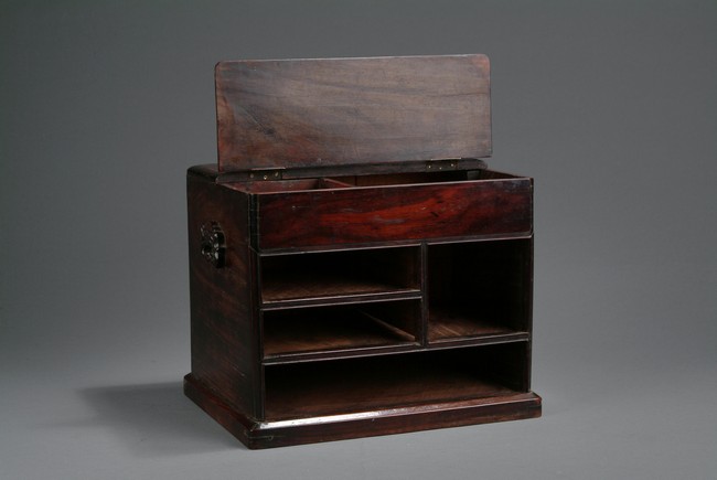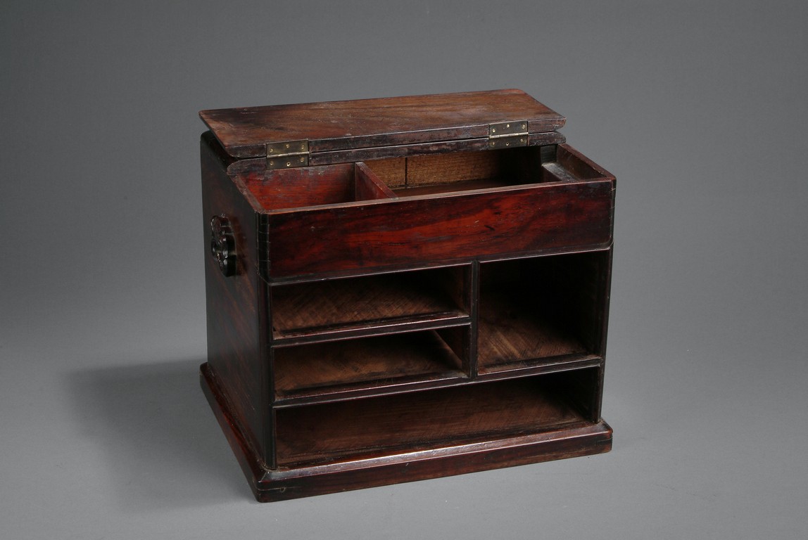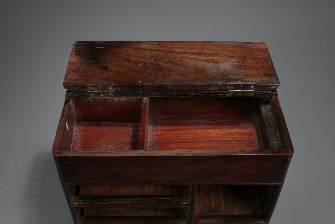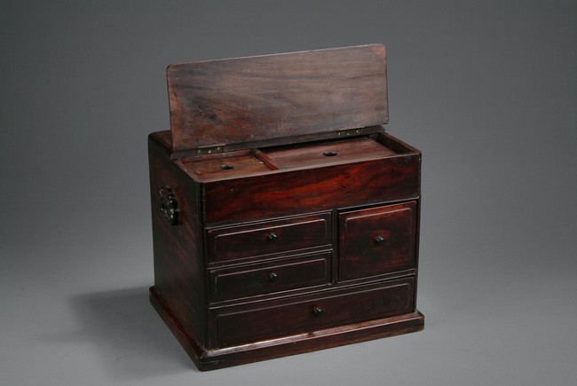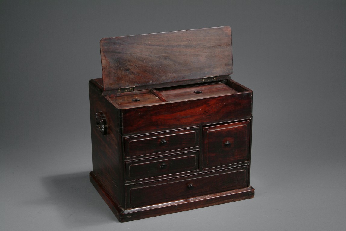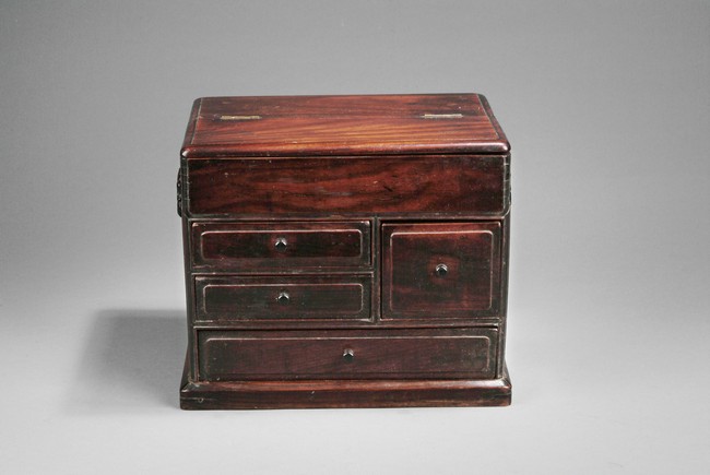 Qing Dynasty period. Of rectangular shape, the front of cabinet has four drawers, three rectangular and one square. The top opens to a two-compartment storage, one square and one rectangular. Deep and rich natural color all around, with two handles on the side.