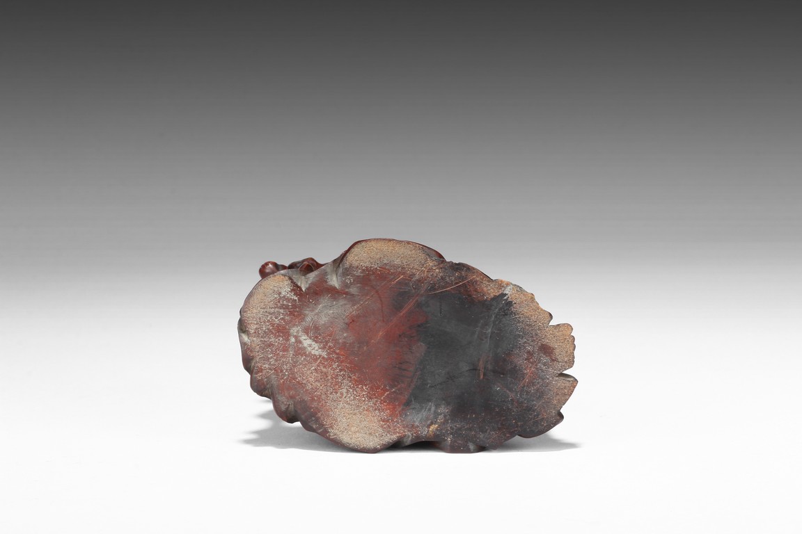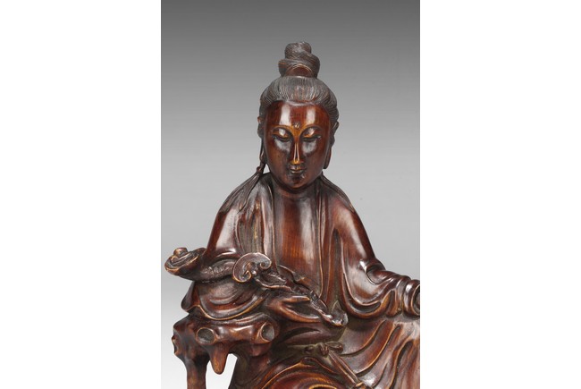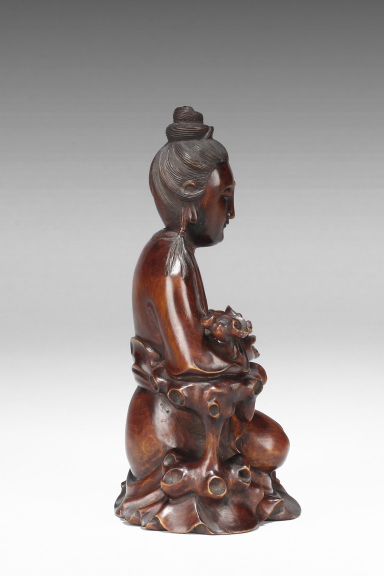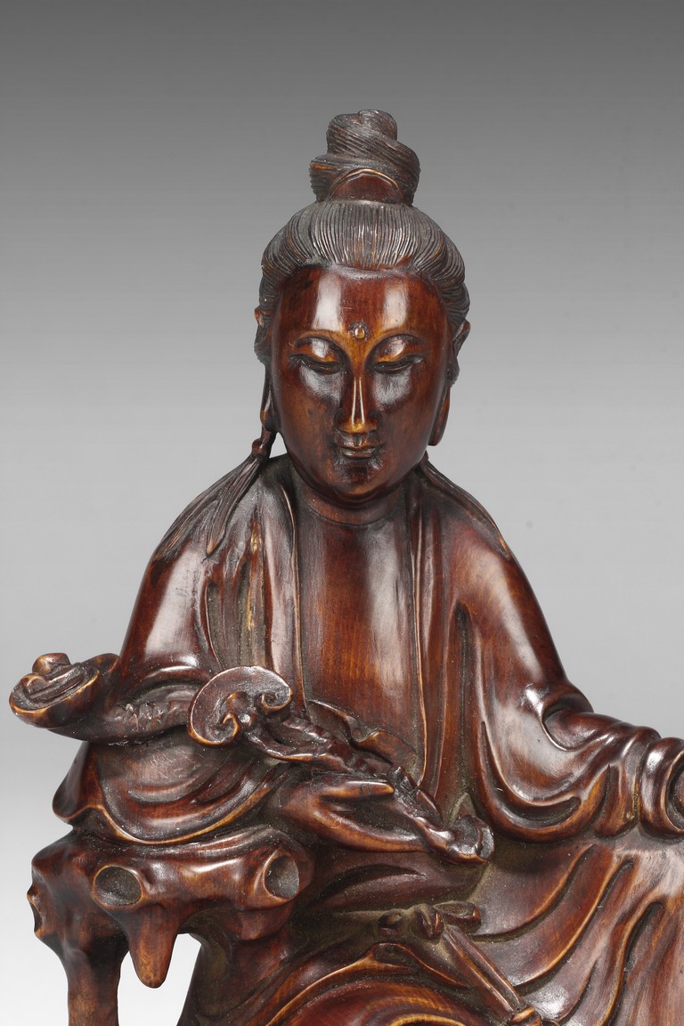 Qing Dynasty Period. The Guanyin figure is shown seated at ease in peaceful manner. Her left hand rests on left bent knee and right hand holds an Lingzhi ruyi scepter with elbow resting on rock. Wearing an loose and voluminous robe,her face is depicted with an benevolent downcast eyes and her hair is tied in an tall chignon.