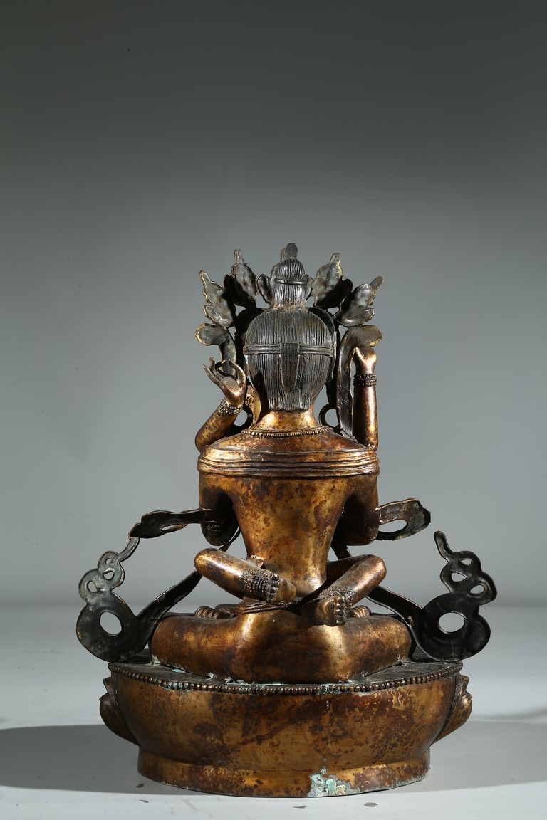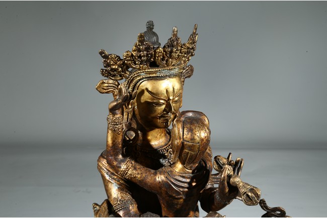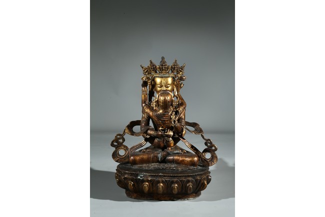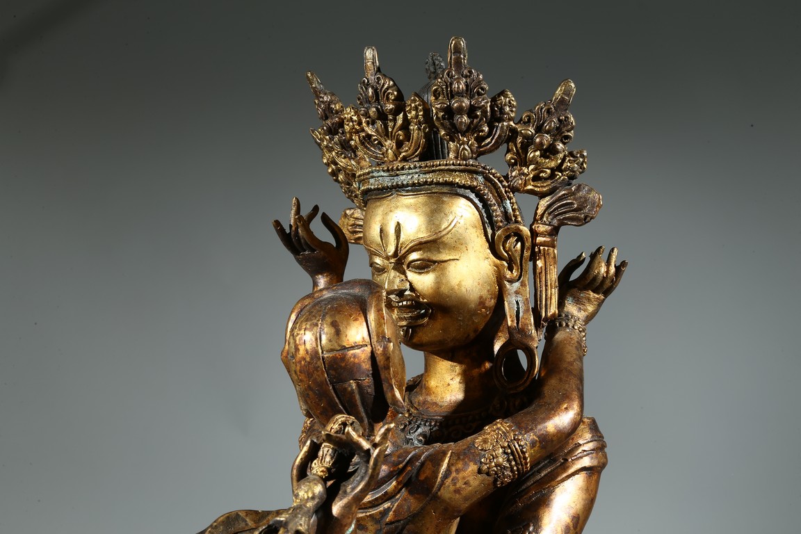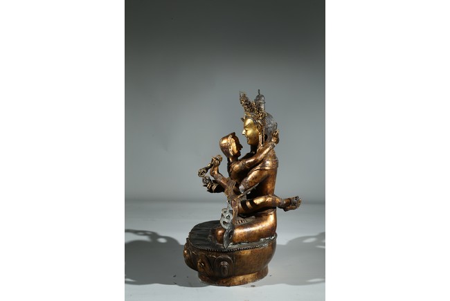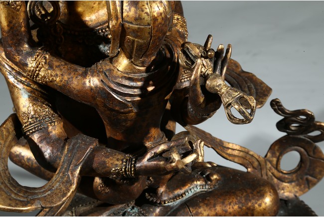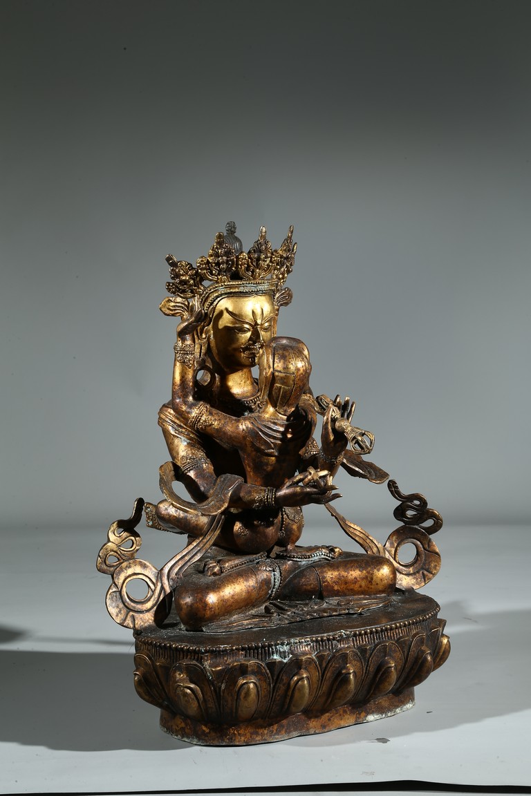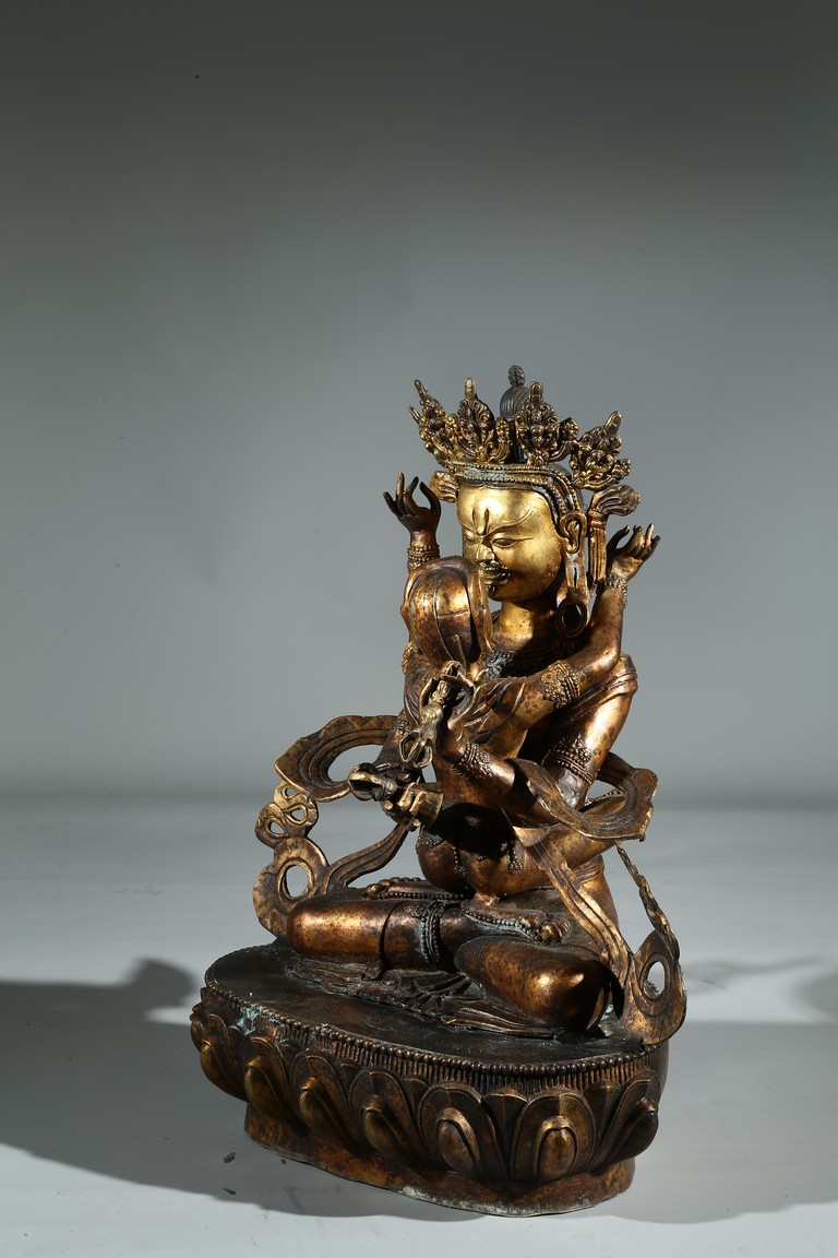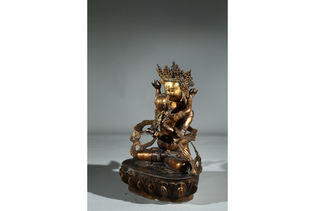 雙身金剛持又名“勝者金剛持”, 是藏傳佛教無上密乘的本尊,其崇拜與密教後期的時輪教法有關。主尊頭戴花冠,寶繒於耳際飄拂,面容寂靜。右手持金剛鈴,左手執金剛杵,雙手結金剛迦羅印擁抱明妃。明妃般若佛母雙腿盤繞主尊,雙手上舉。金剛持是最高真實“空”的化身,般若佛母代表慈悲,雙運相意味進入了空的境界,是密教修行所達到的所謂悲空雙運的最高境界。