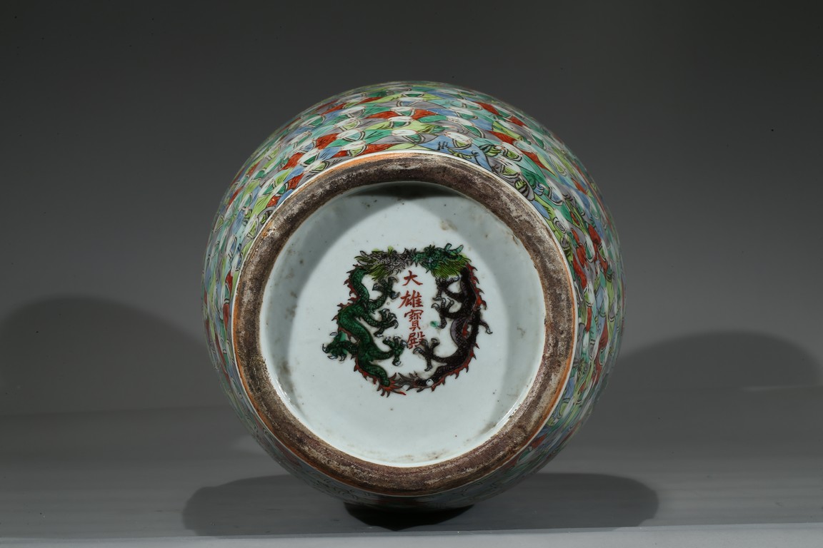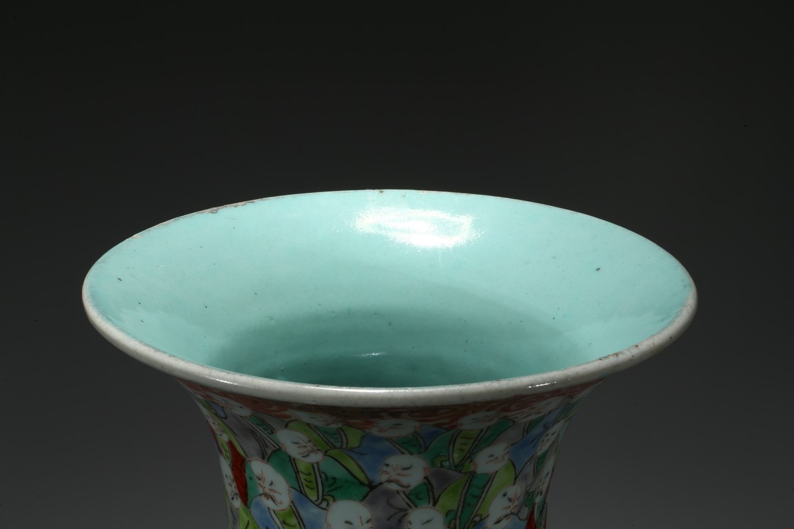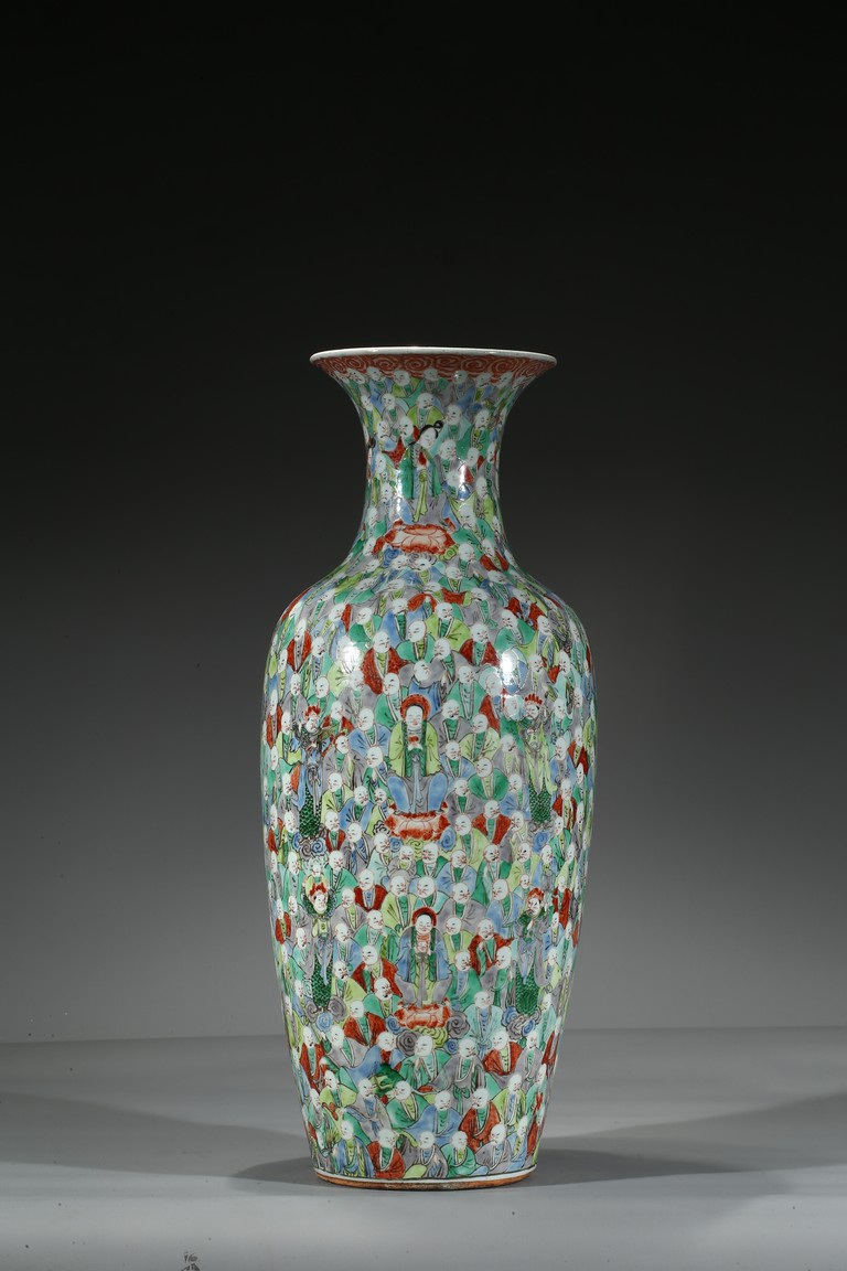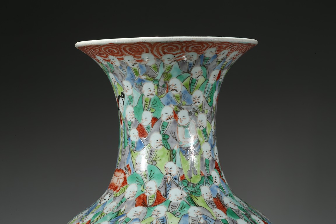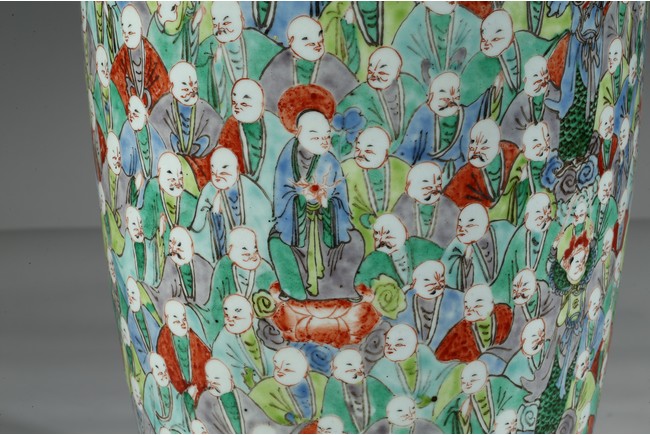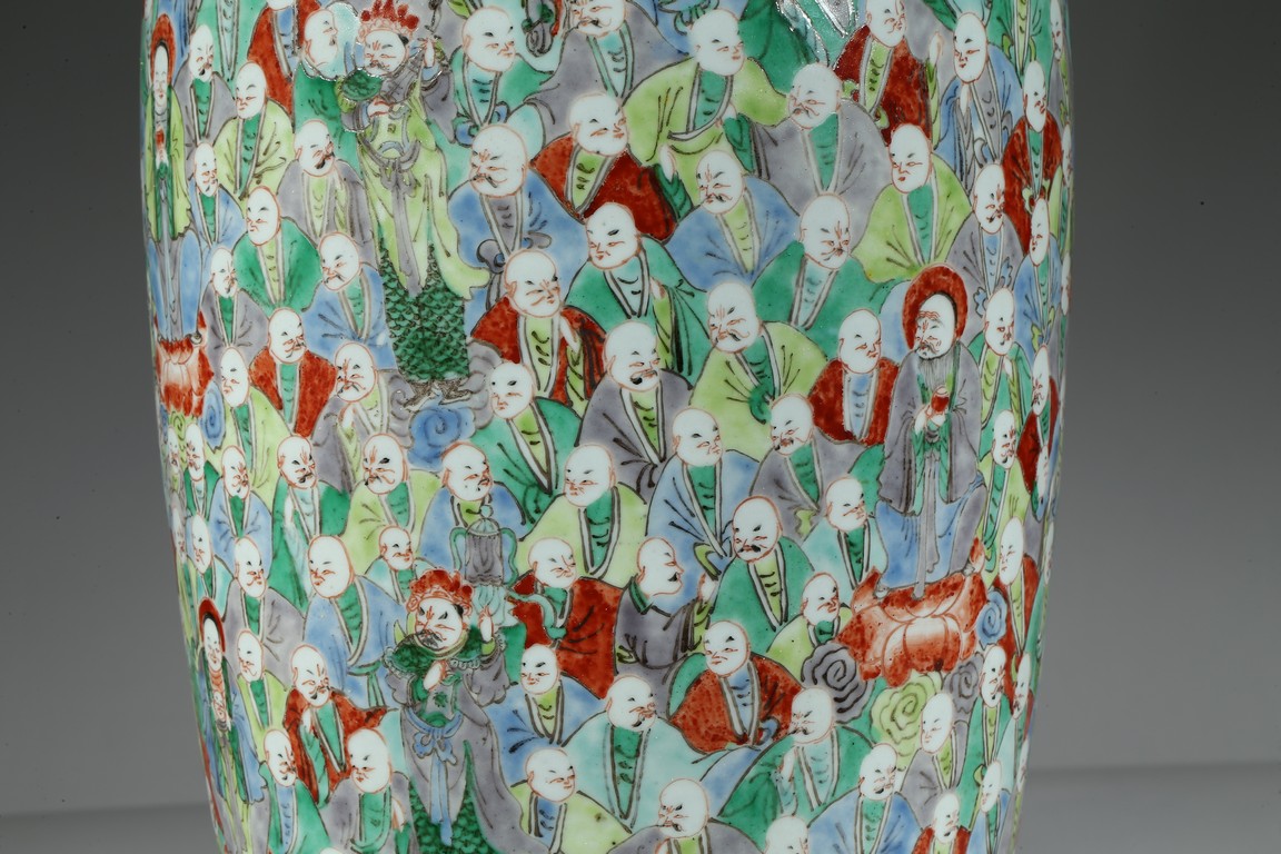 Of tall tapering form, the body exterior densely enamelled with five hundreds arhats wearing colorful robes, all below a band of ruyi pattern around the mouth rim, the base inscribed with a four character 'Da Xiong Bao Dian' mark flanked by two opposing dragons. Qing Dynasty Period.