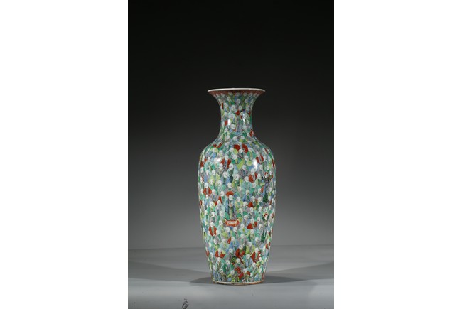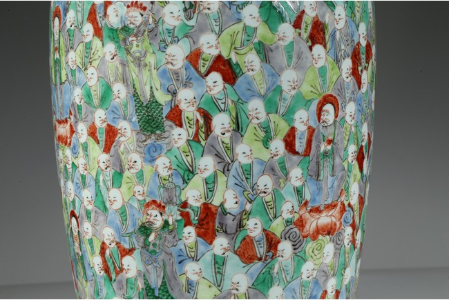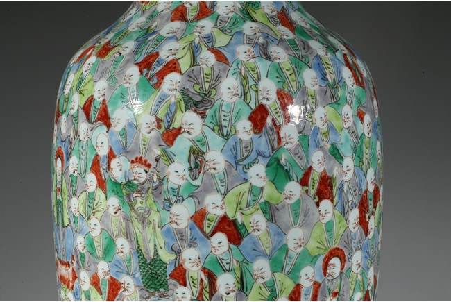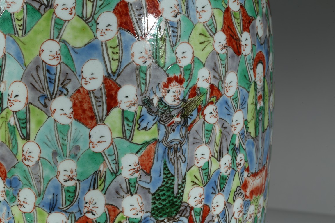 此五彩觀音瓶,束頸、豐肩、修腹、斂足。觀音瓶創燒、流行於康、雍間,器形雋雅高貴,釉面素潔溫潤,線條舒展柔美,工藝精湛細緻而無造作之痕,為康熙時期內府花器的上品。瓶身以五彩裝飾為基礎,採用通景式構圖方法勾勒出一百零八羅漢紋飾,紋樣富麗,著色豐富,歎為觀止。整器紋飾著色豐富,以敷彩濃艷的紅、黃 藍、綠為主色,間以赭、紫、黑等色,衣紋、雲彩更施以金彩,使畫面呈現出富麗吉祥之感。題材中人物描寫精到,眉毛、眼珠和頭髮鬍鬚用黑色勾勒,面部膚色也因人而異,不同神情,清晰可見。底部“大雄寶殿”款識,在佛教寺院中,大雄寶殿是供奉佛像的正殿。大雄寶殿是整座寺院的核心建築,也是僧眾朝暮集中修持的地方。