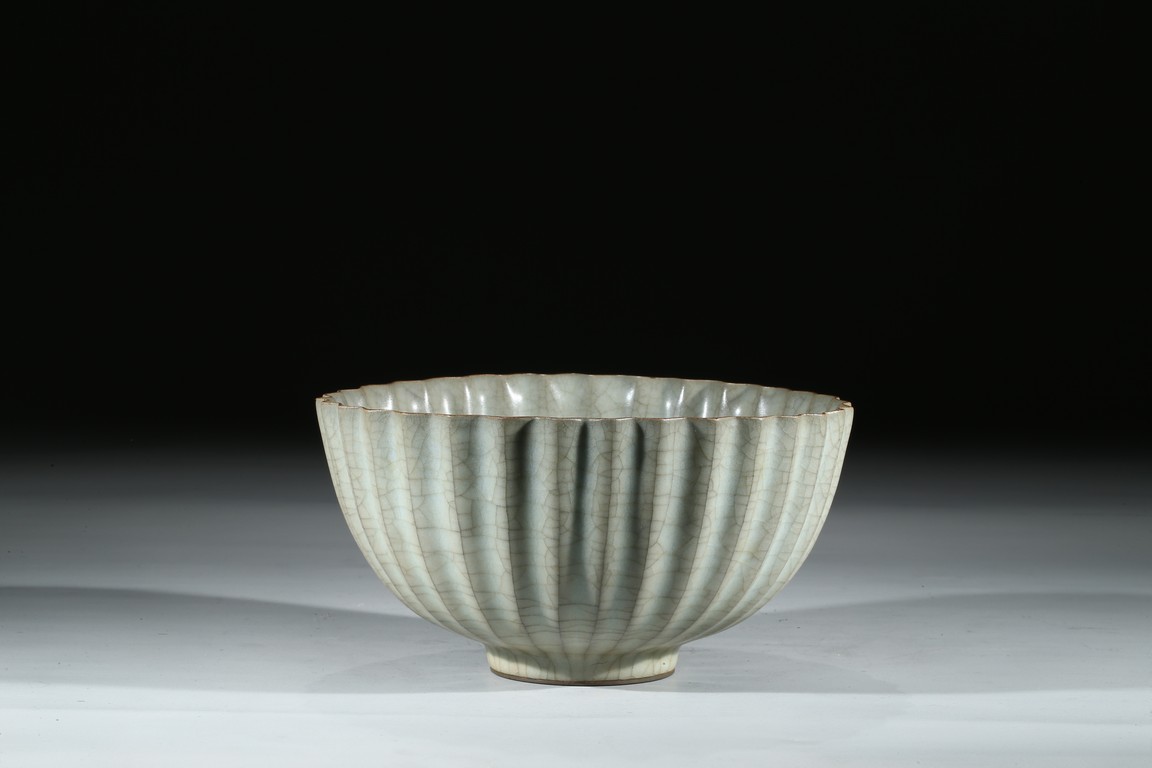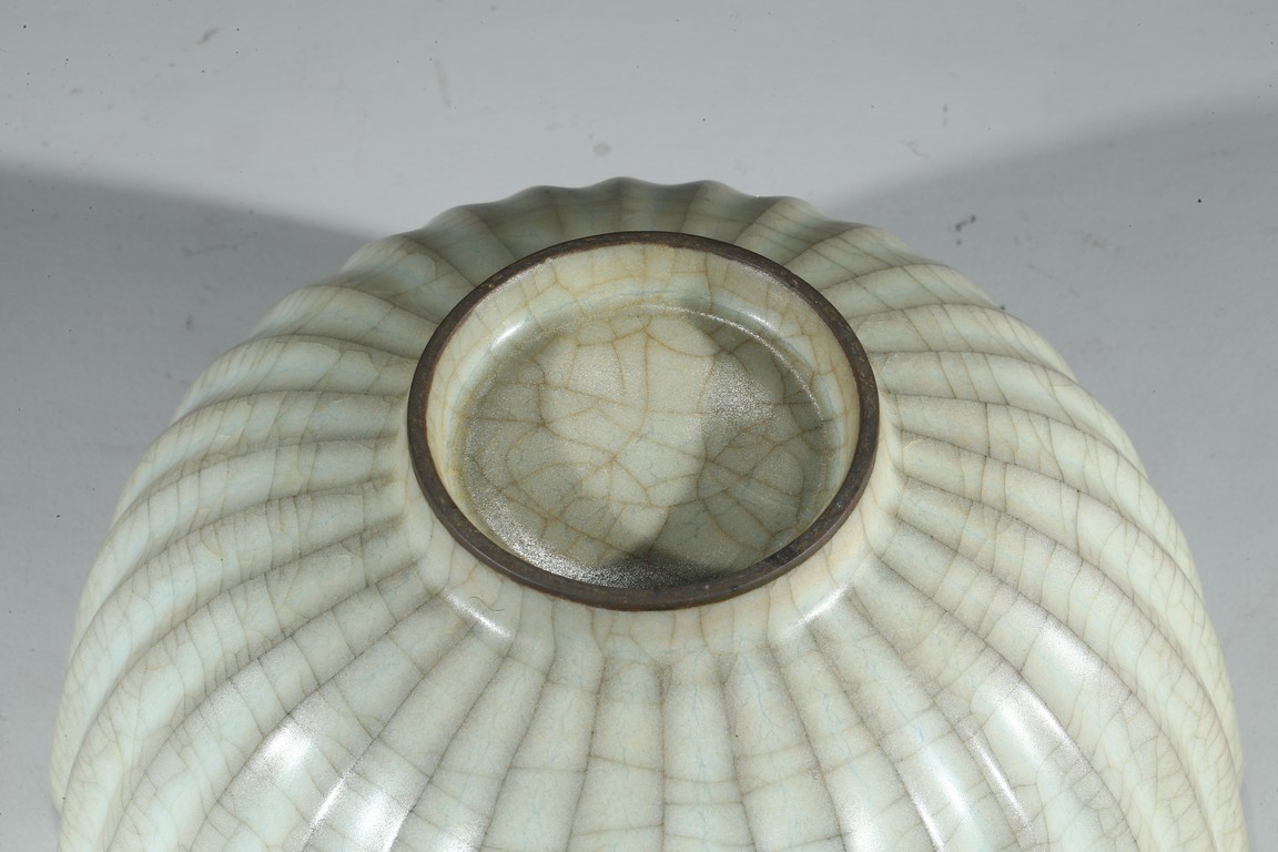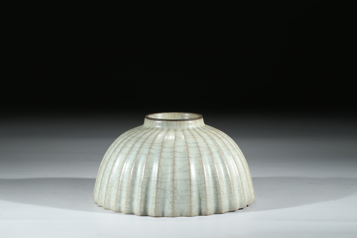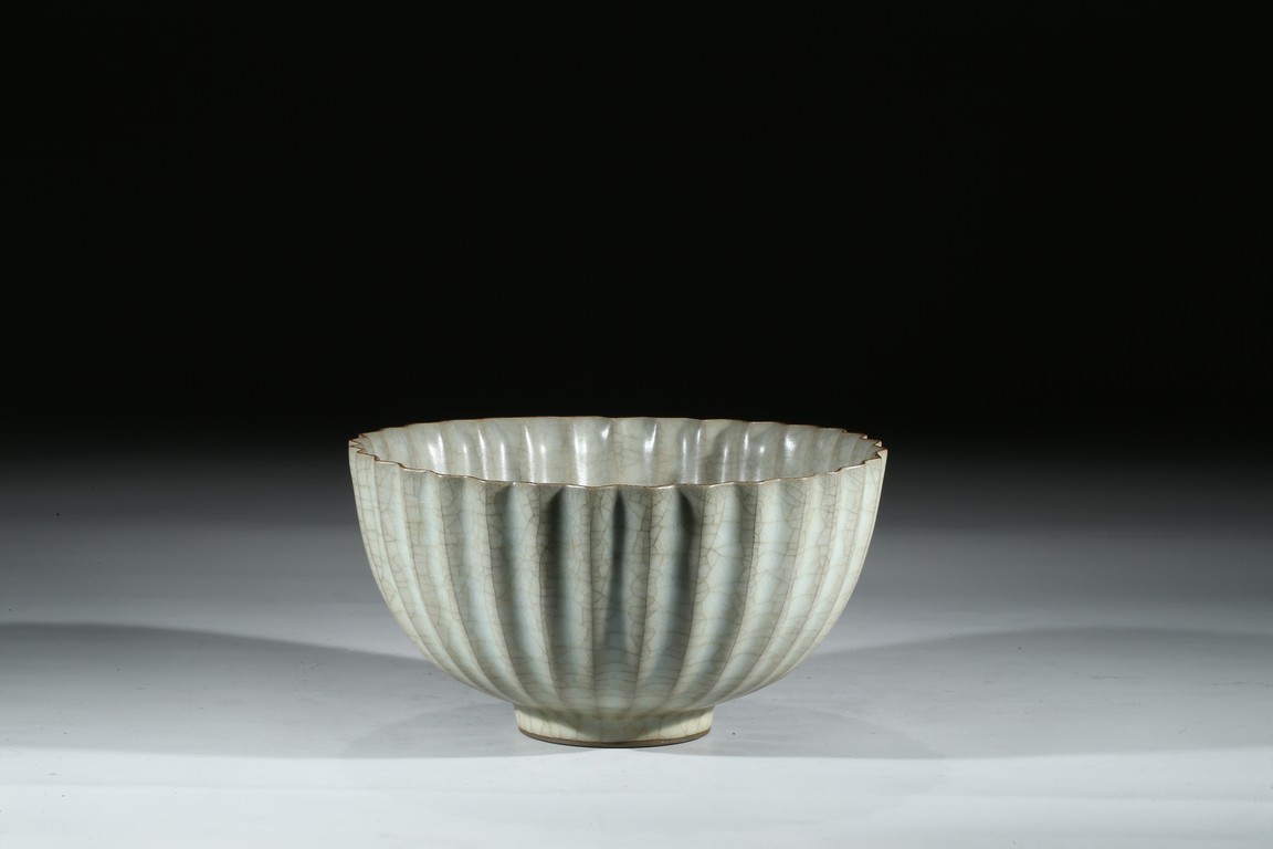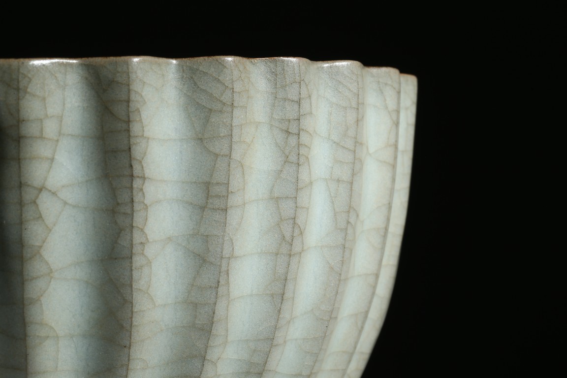 Finely potted with petal shaped lobes rising from the short straight foot, overall suffused with greyish-blue glaze with networks of crackles. Song Dynasty period.