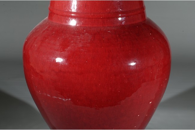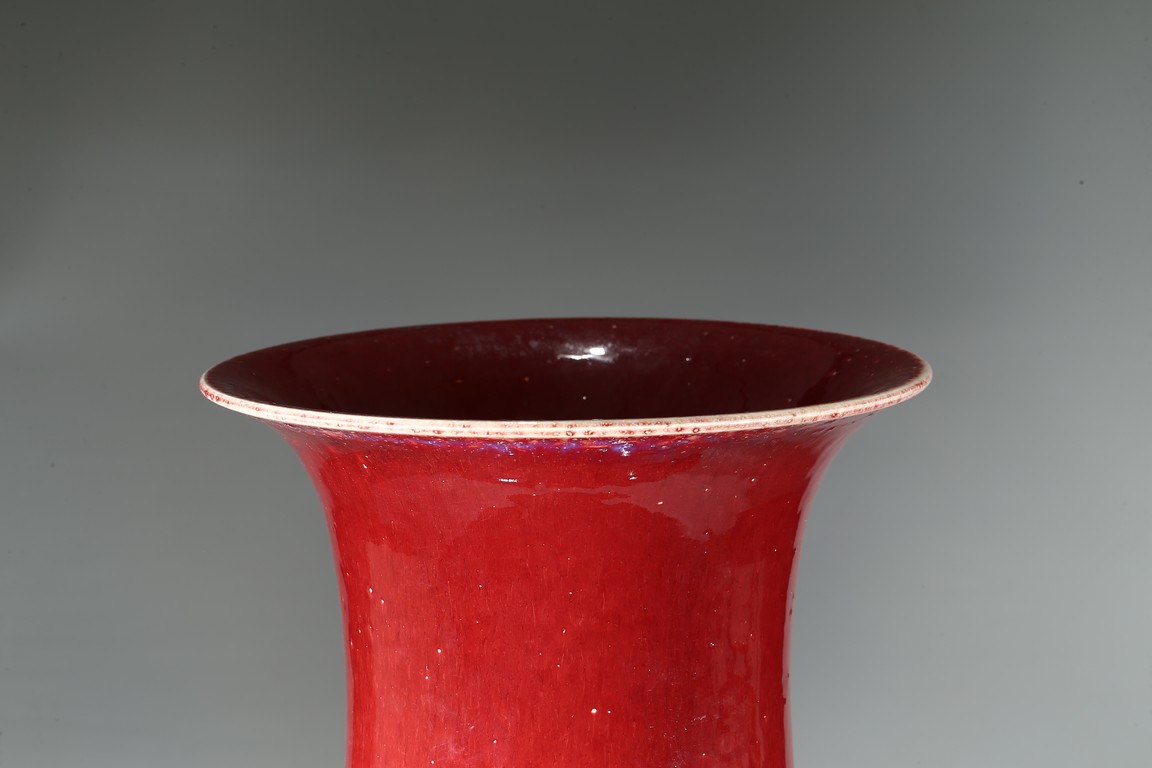 The baluster body rising from a spreading foot to a slightly waisted neck flaring at the rim, the exterior covered in a rich copper-red glaze suffused with a network of crackle throughout. Qing Dynasty period.