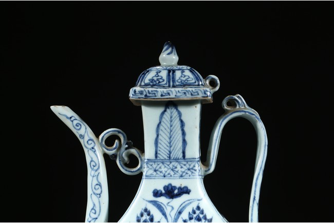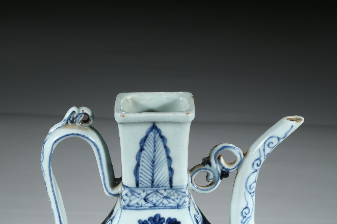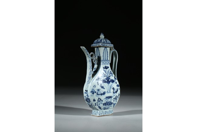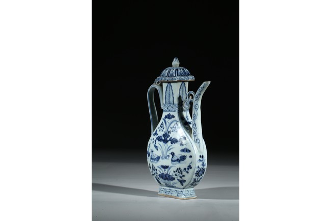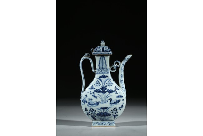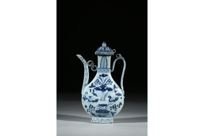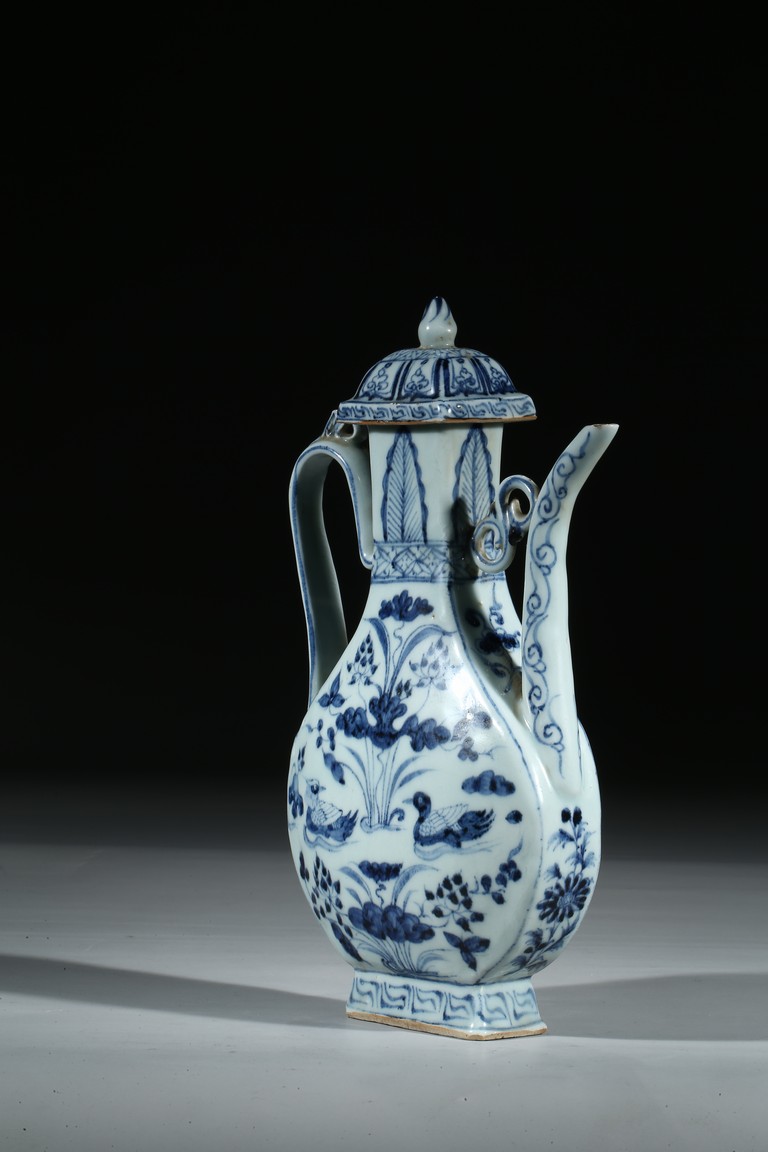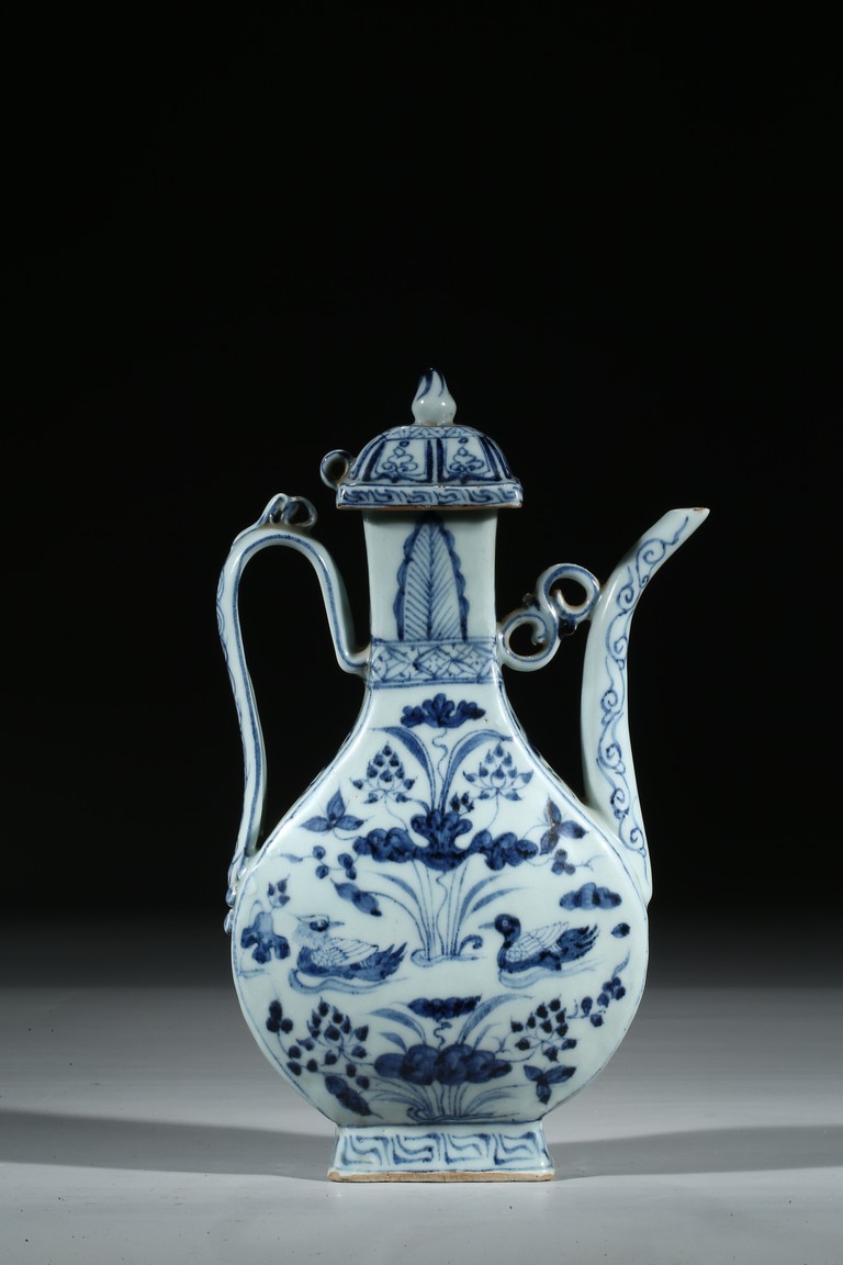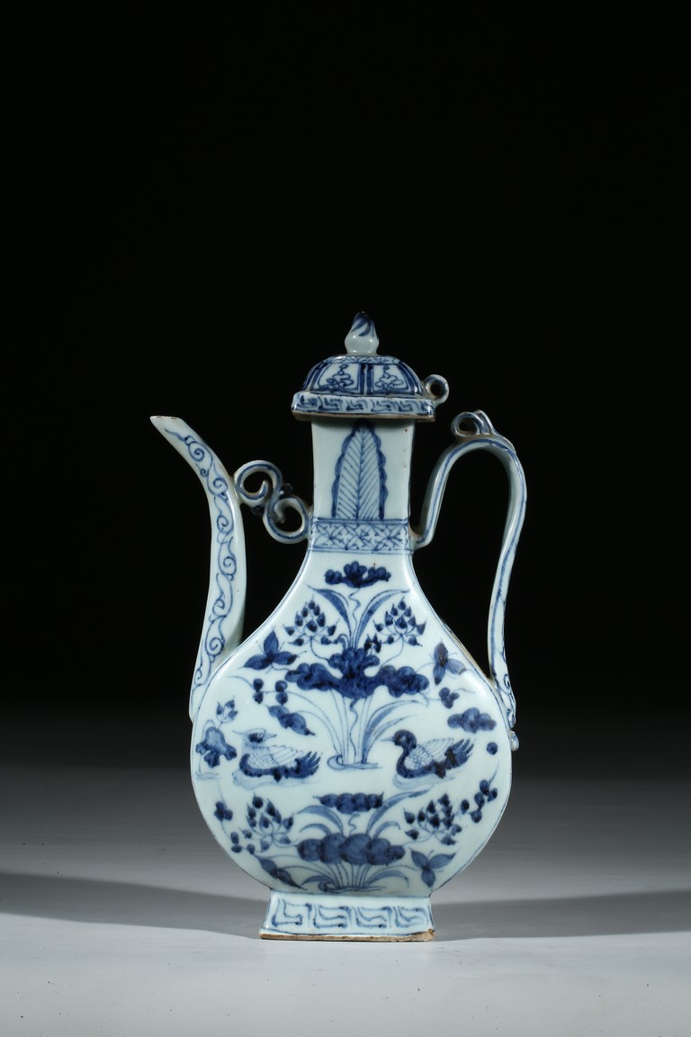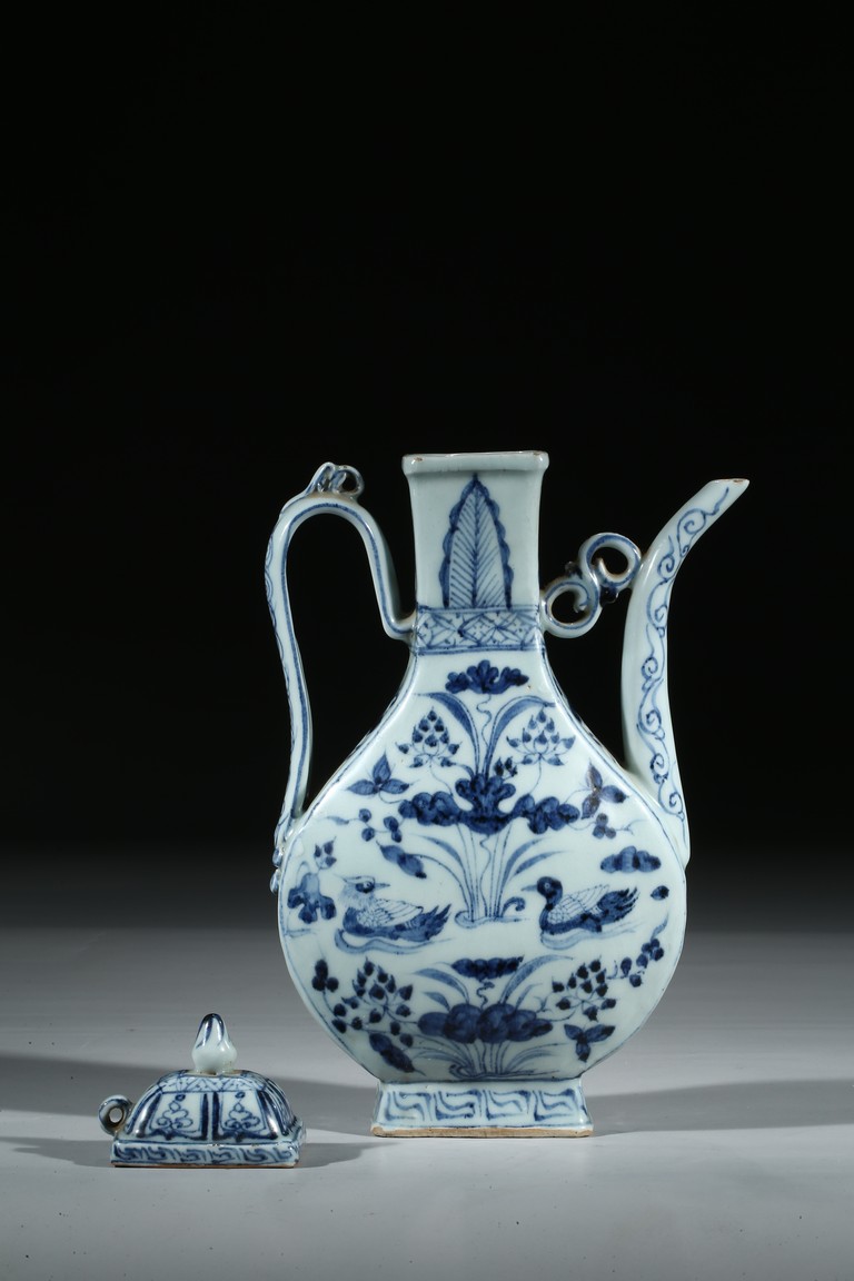 A BLUE AND WHITE 'MANDARIN DUCKS' TEAPOT    明 青花鴛鴦戲水執壺