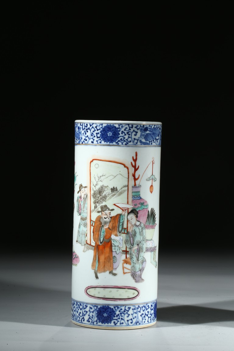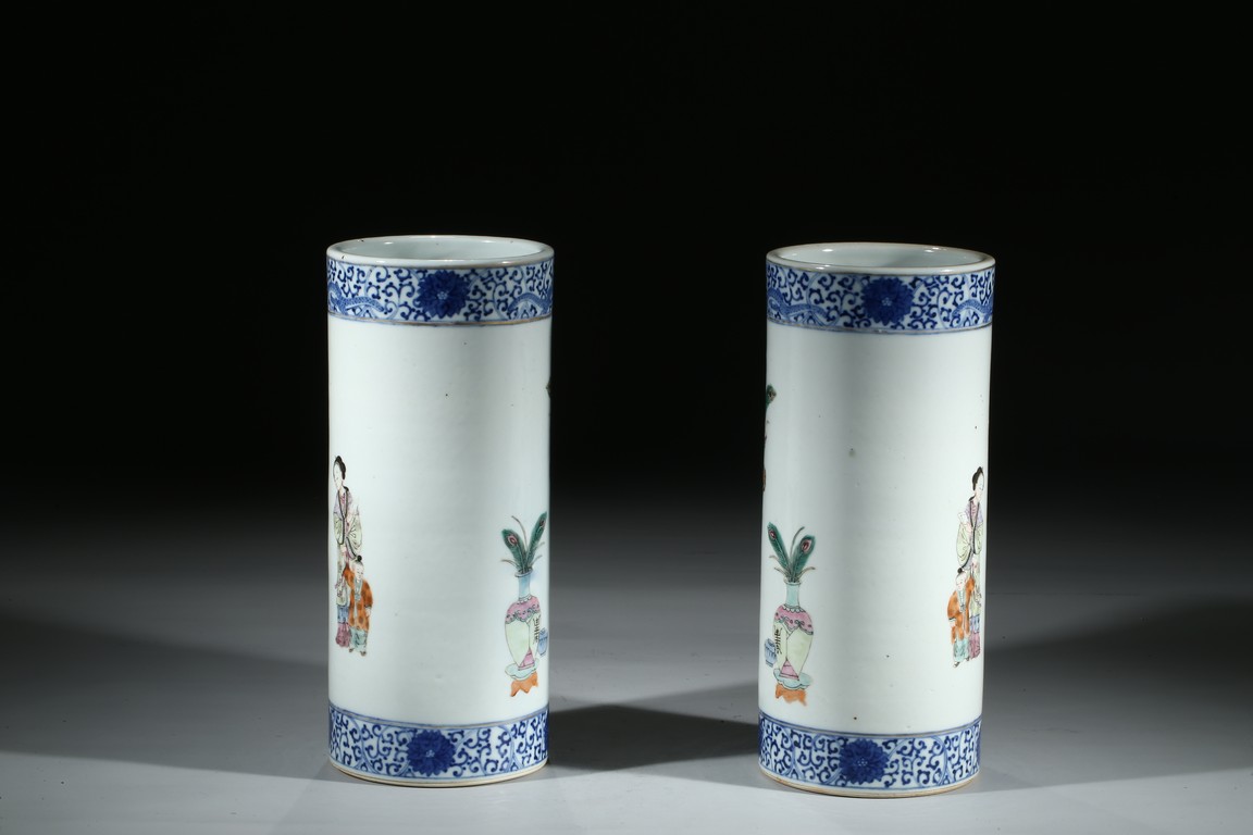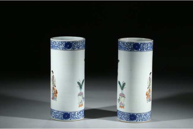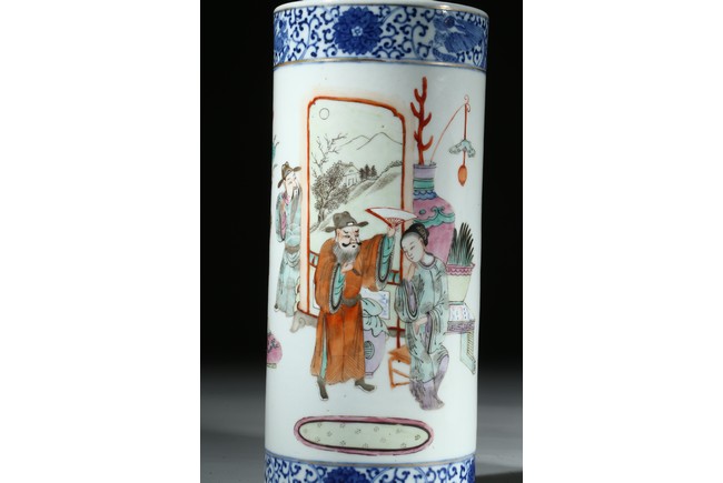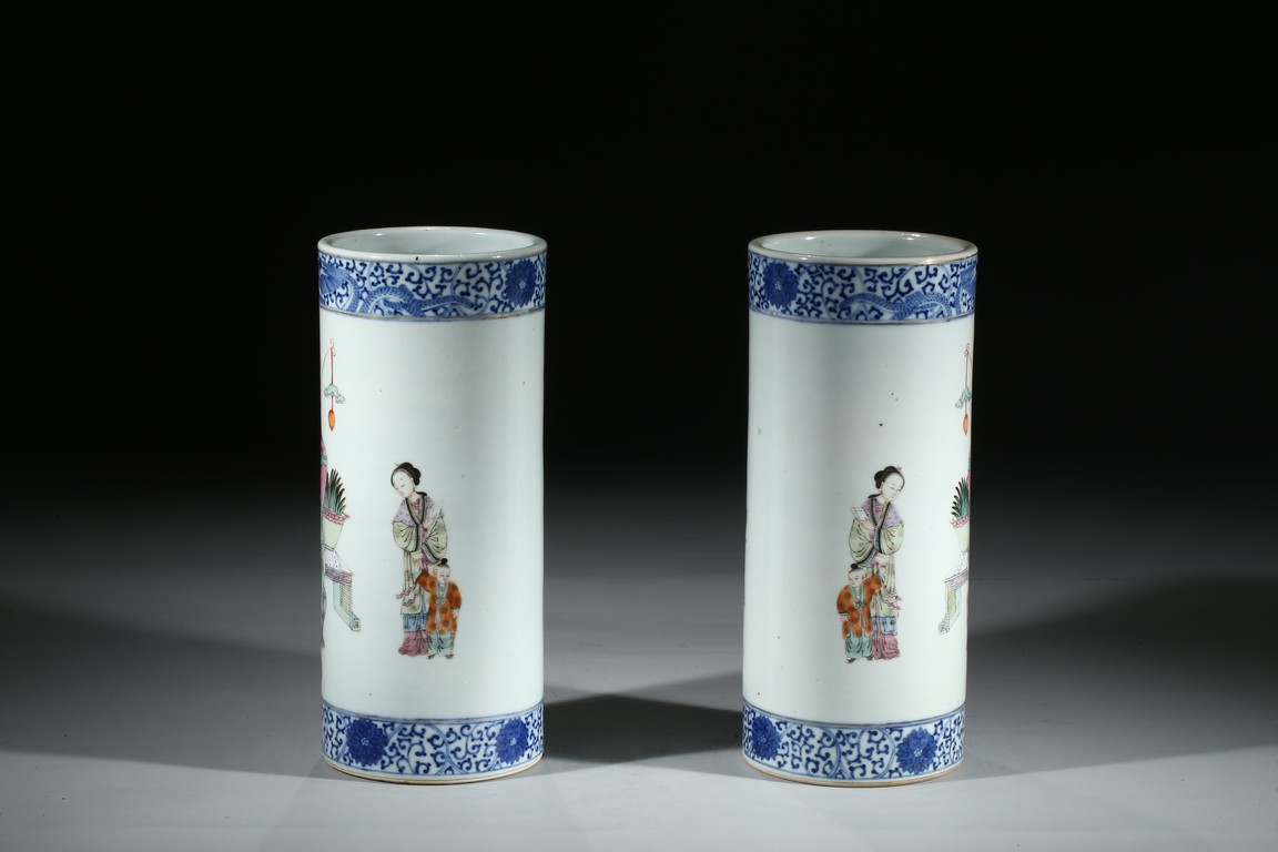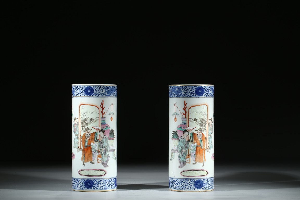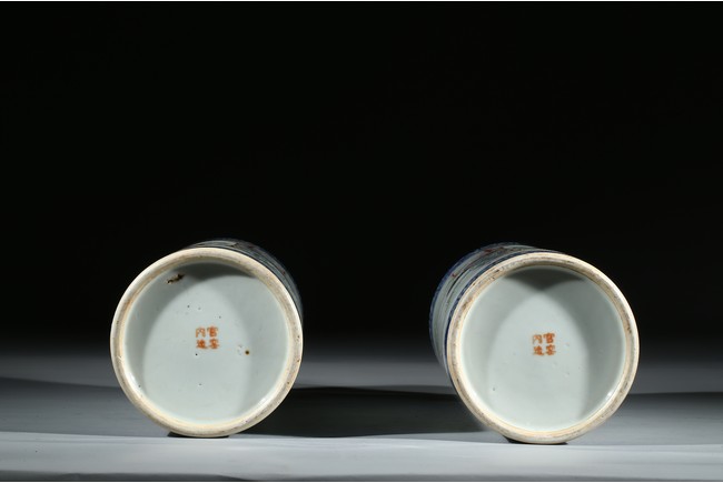 Each of cylindrical form, the body enamelled with a scene of elderly official figure and his concubine in an interior setting, the base with four character mark. Late Qing Dynasty period.