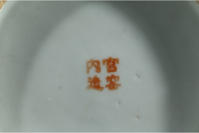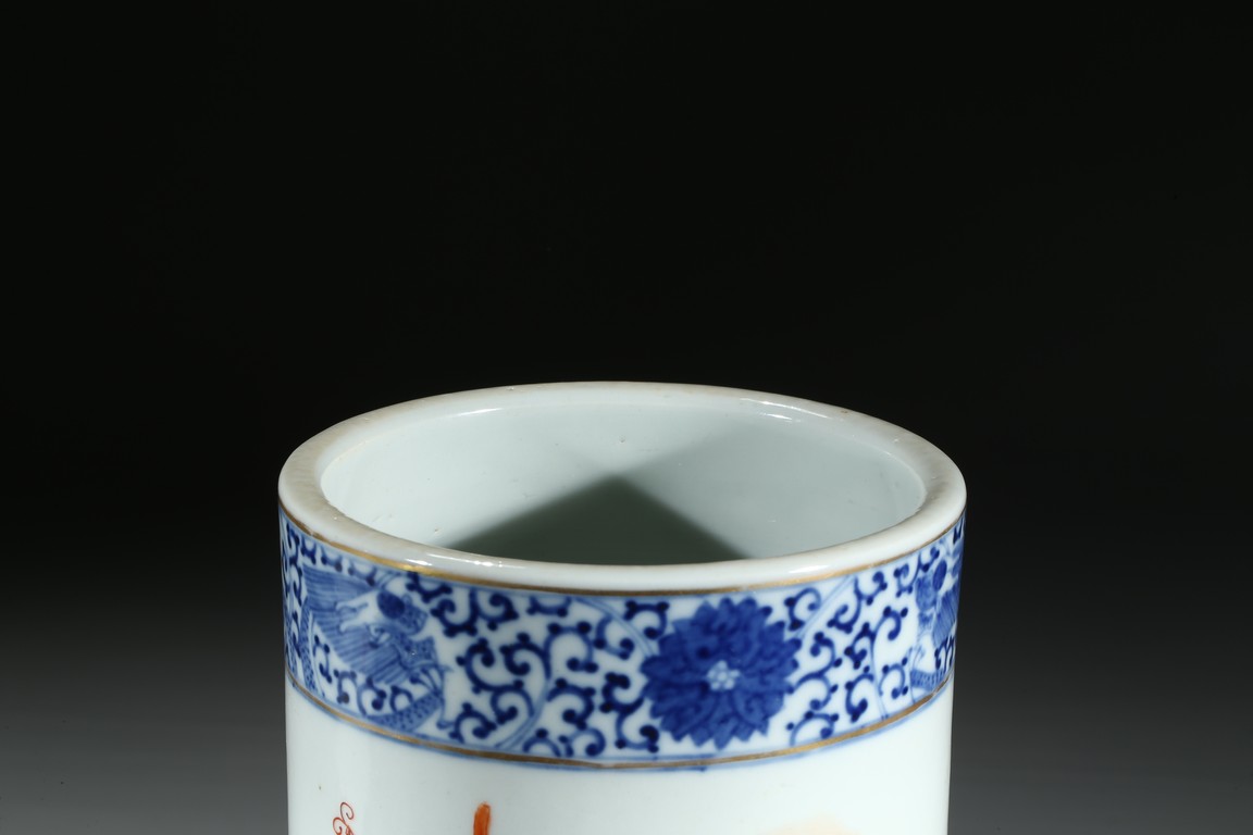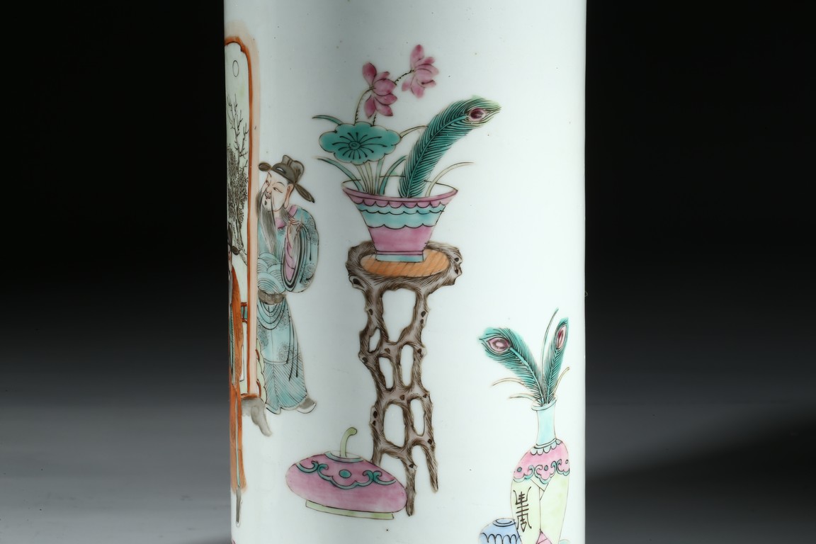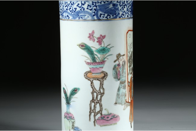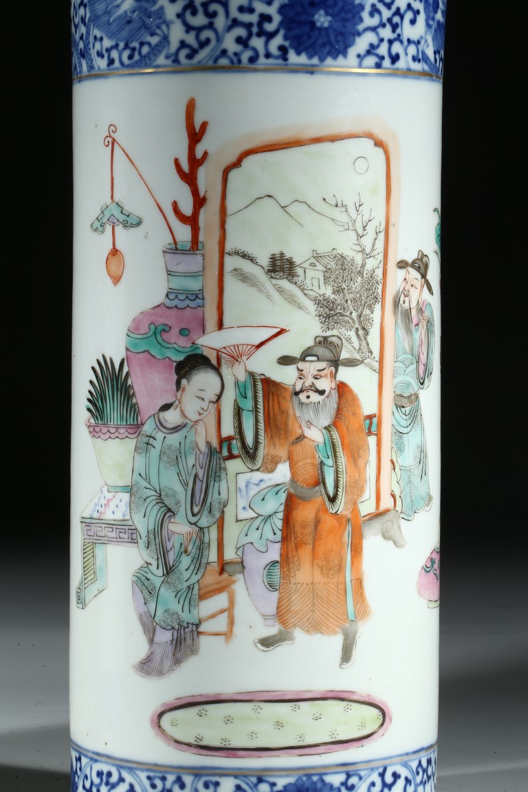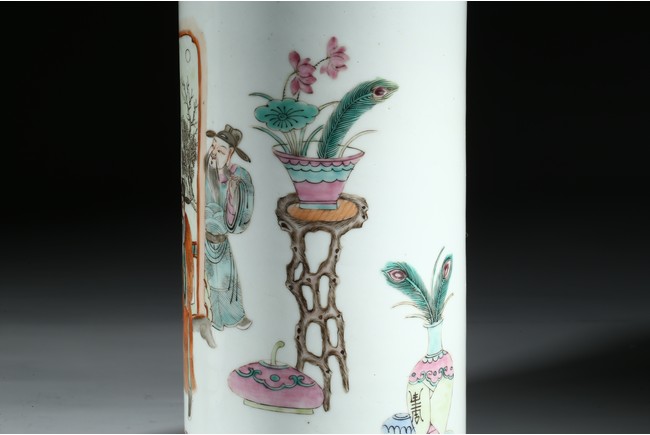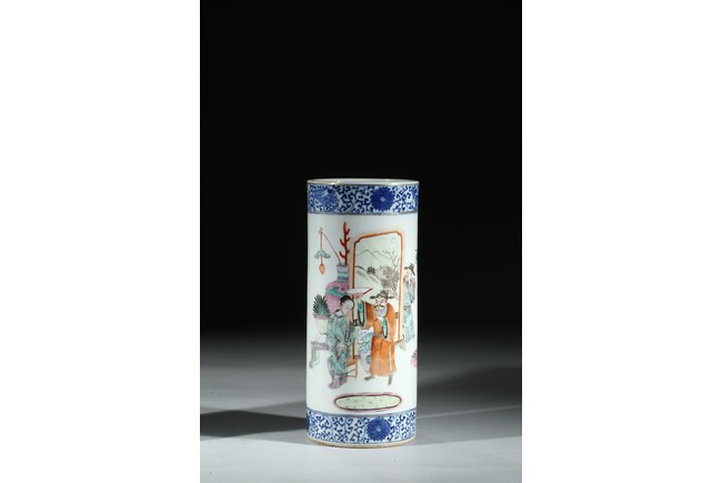 Each of cylindrical form, the body enamelled with a scene of elderly official figure and his concubine in an interior setting, the base with four character mark. Late Qing Dynasty period.