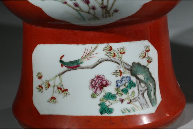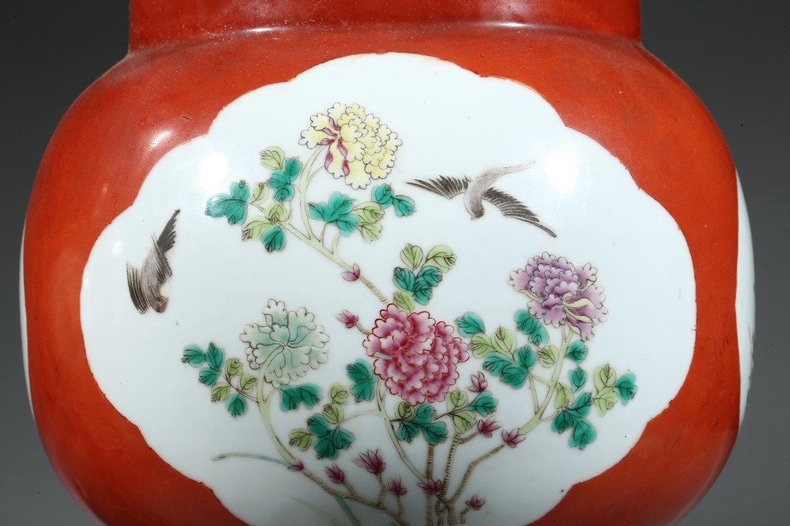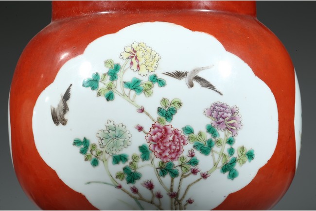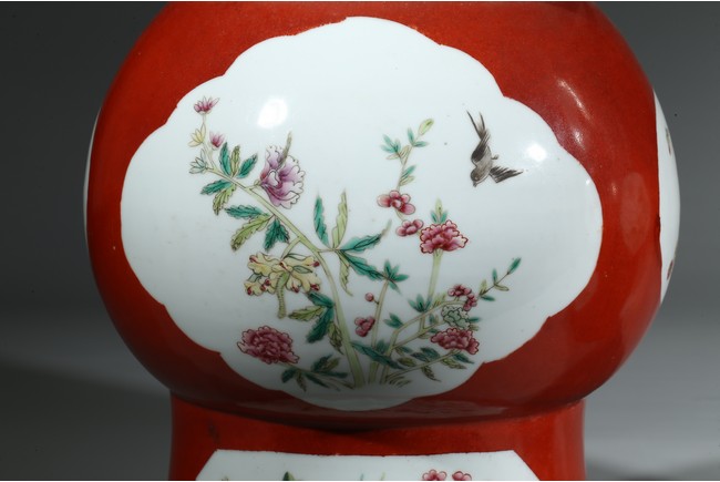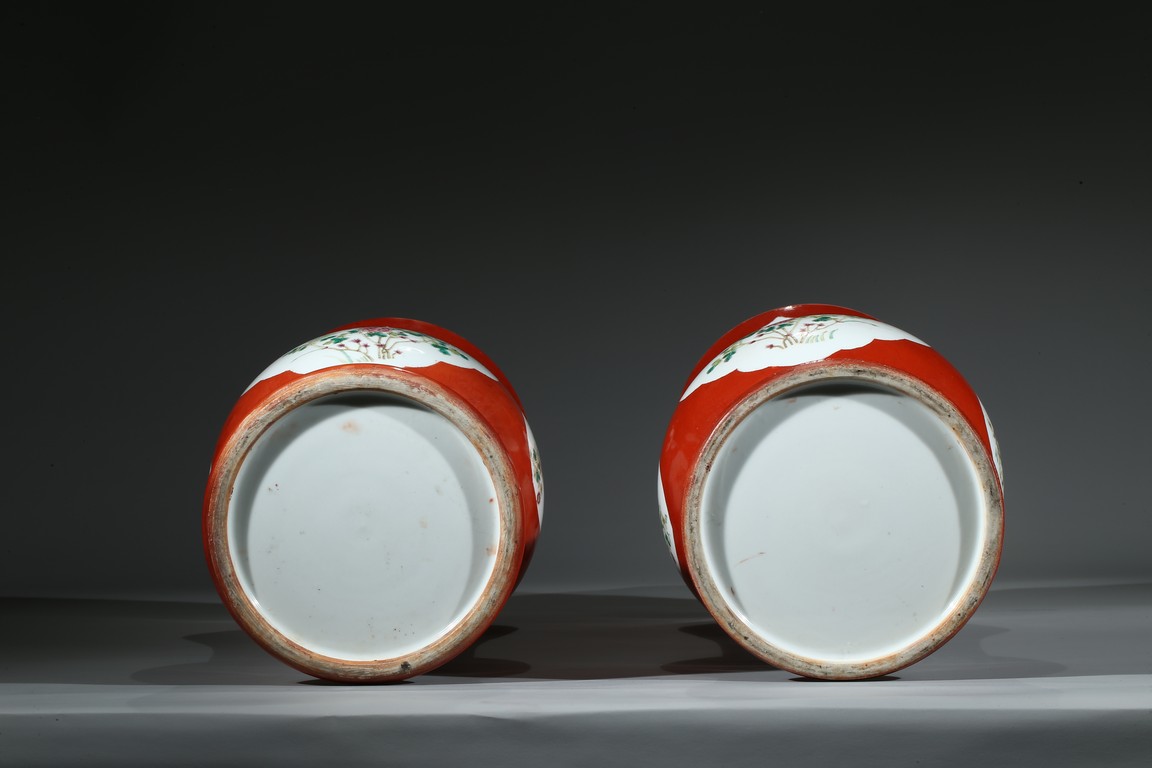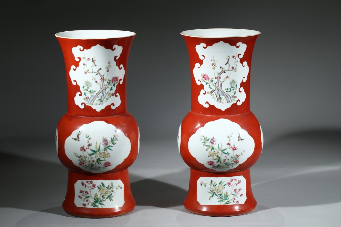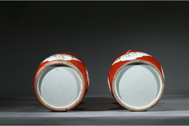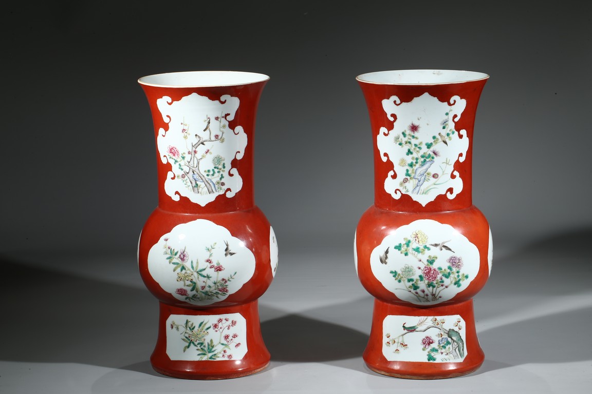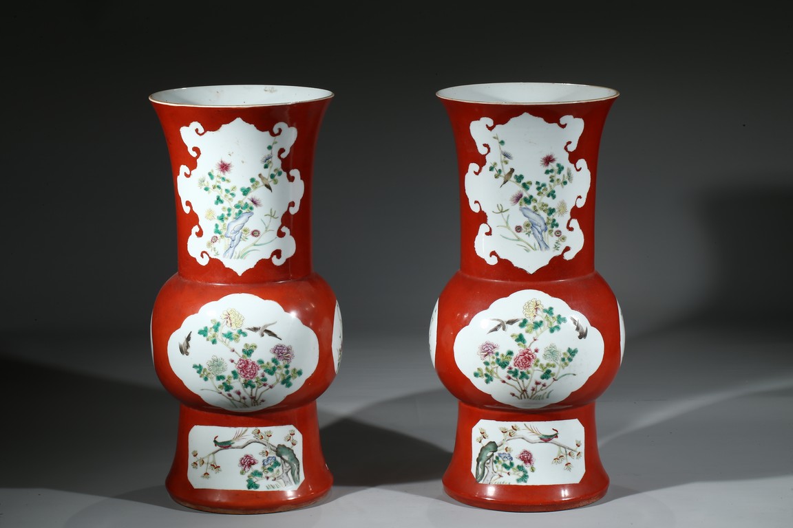 長頸,豐肩鼓上腹,腹下漸收,至底外撇,器型莊重典雅,體態婀娜秀美。以紅彩為地,開光繪粉彩花鳥紋樣,造型生動精巧,整體畫面構思精巧,色澤濃淡適宜,繁麗中殊有玲瓏剔透之致,極是清雅。成對保存,實屬不易。