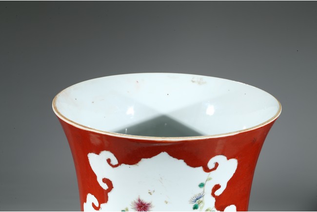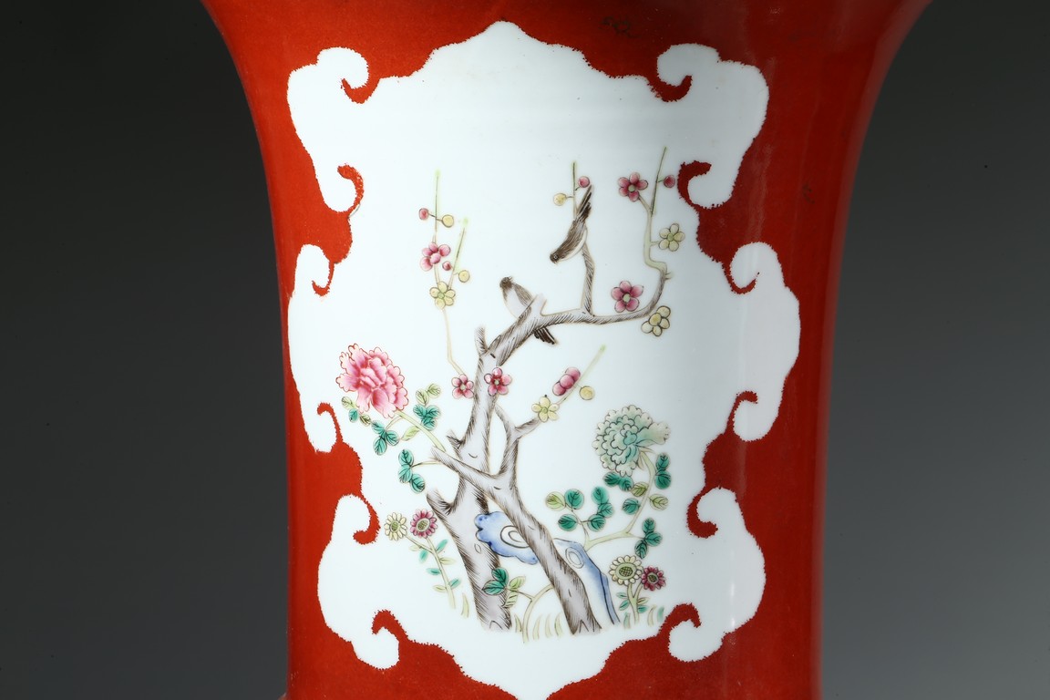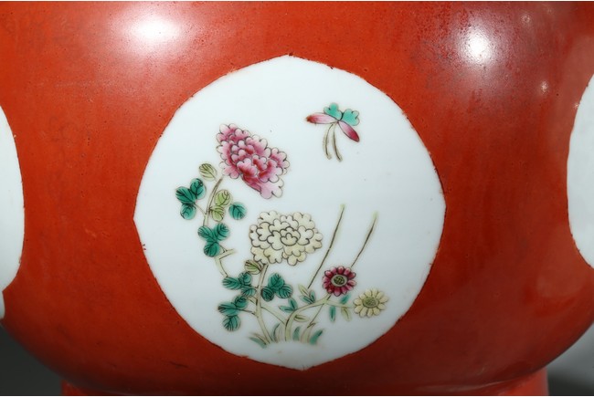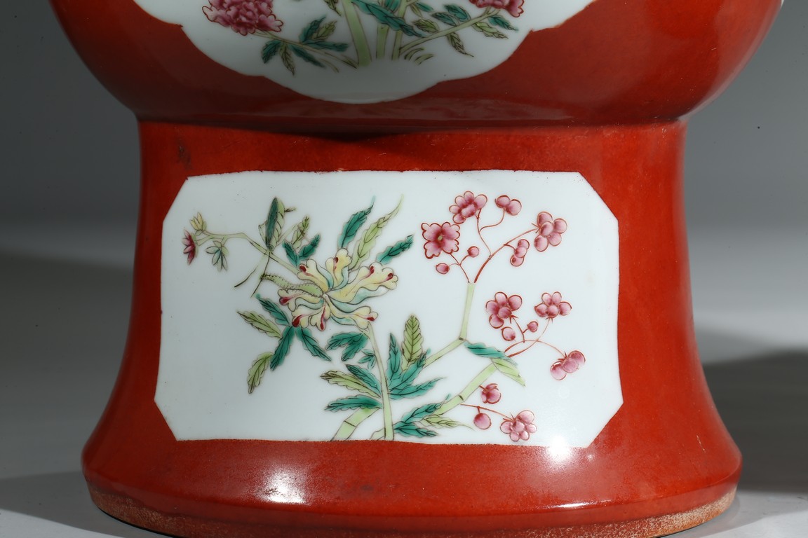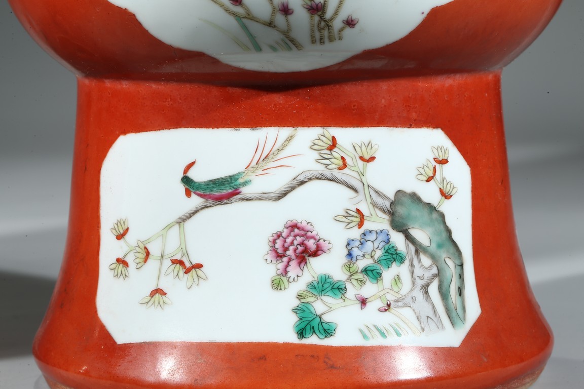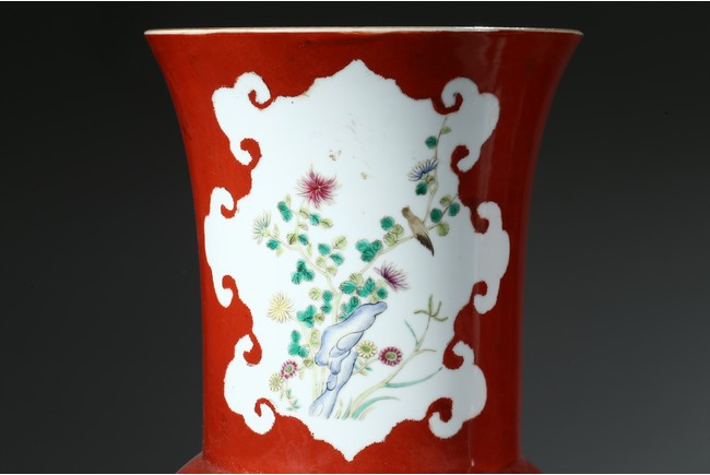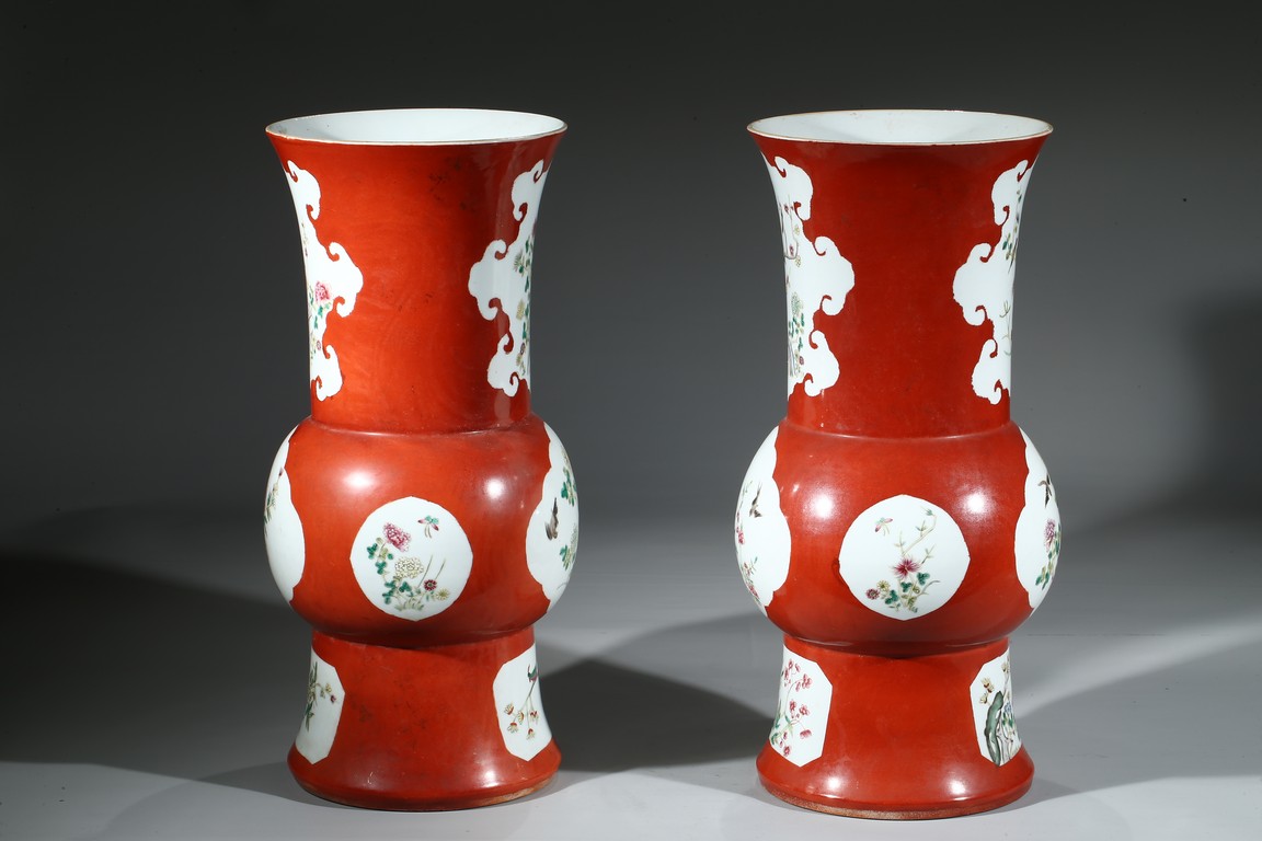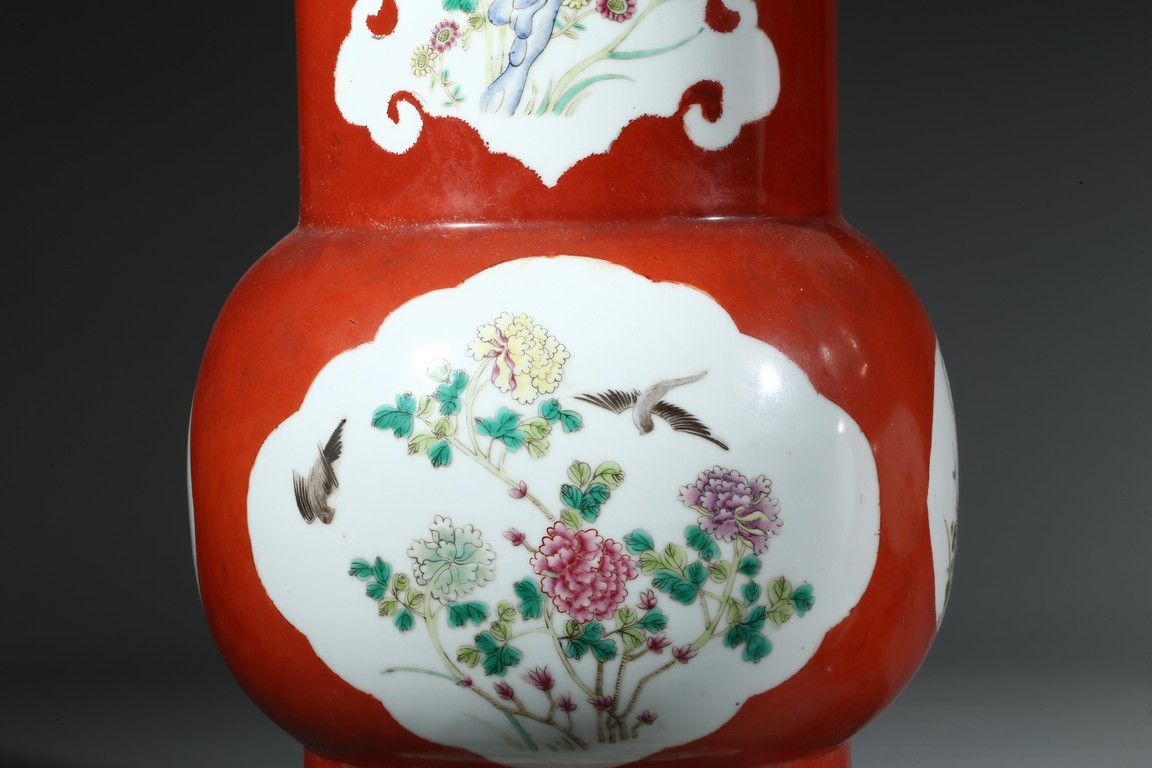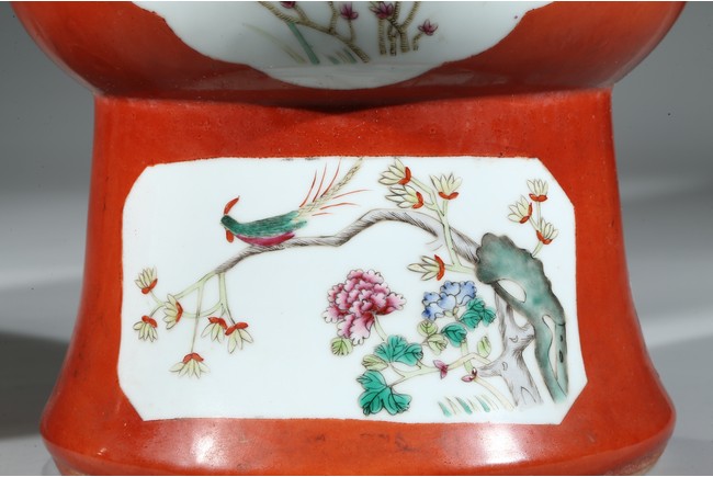 長頸,豐肩鼓上腹,腹下漸收,至底外撇,器型莊重典雅,體態婀娜秀美。以紅彩為地,開光繪粉彩花鳥紋樣,造型生動精巧,整體畫面構思精巧,色澤濃淡適宜,繁麗中殊有玲瓏剔透之致,極是清雅。成對保存,實屬不易。