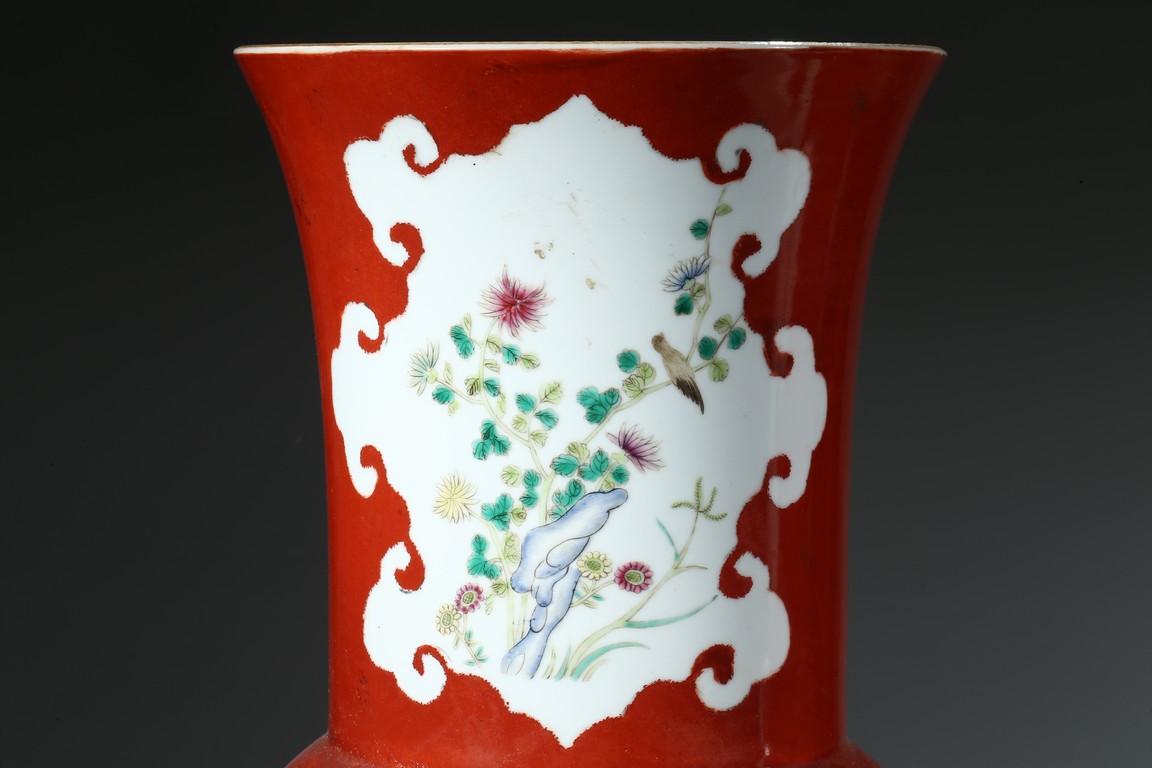 Each of archaic gu shape with neck flaring up to a trumpet mouth, supported on a bell-shaped foot, body enamelled to depict birds and flowers enclosed in shaped cartouches. Qing Dynasty period.