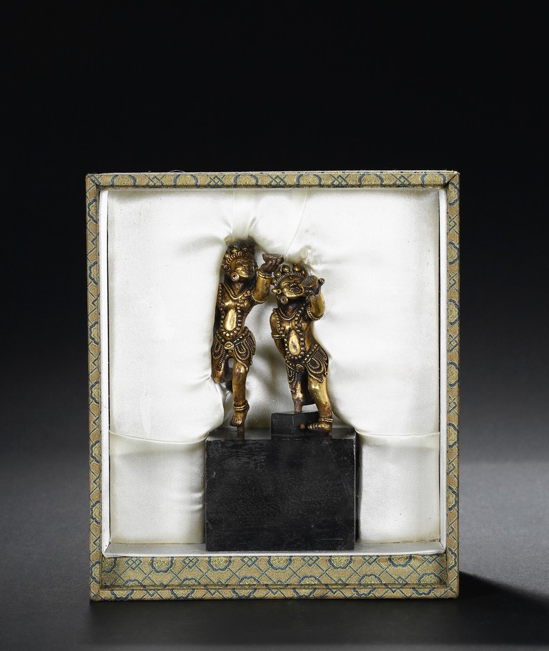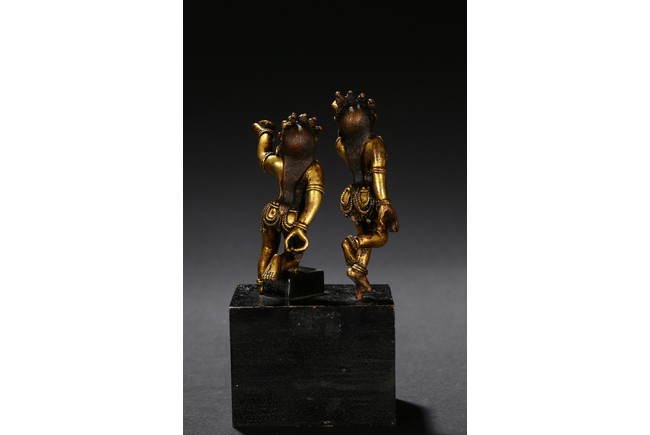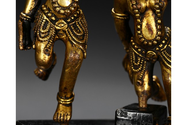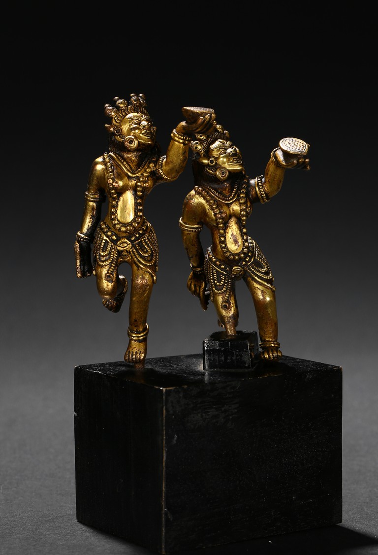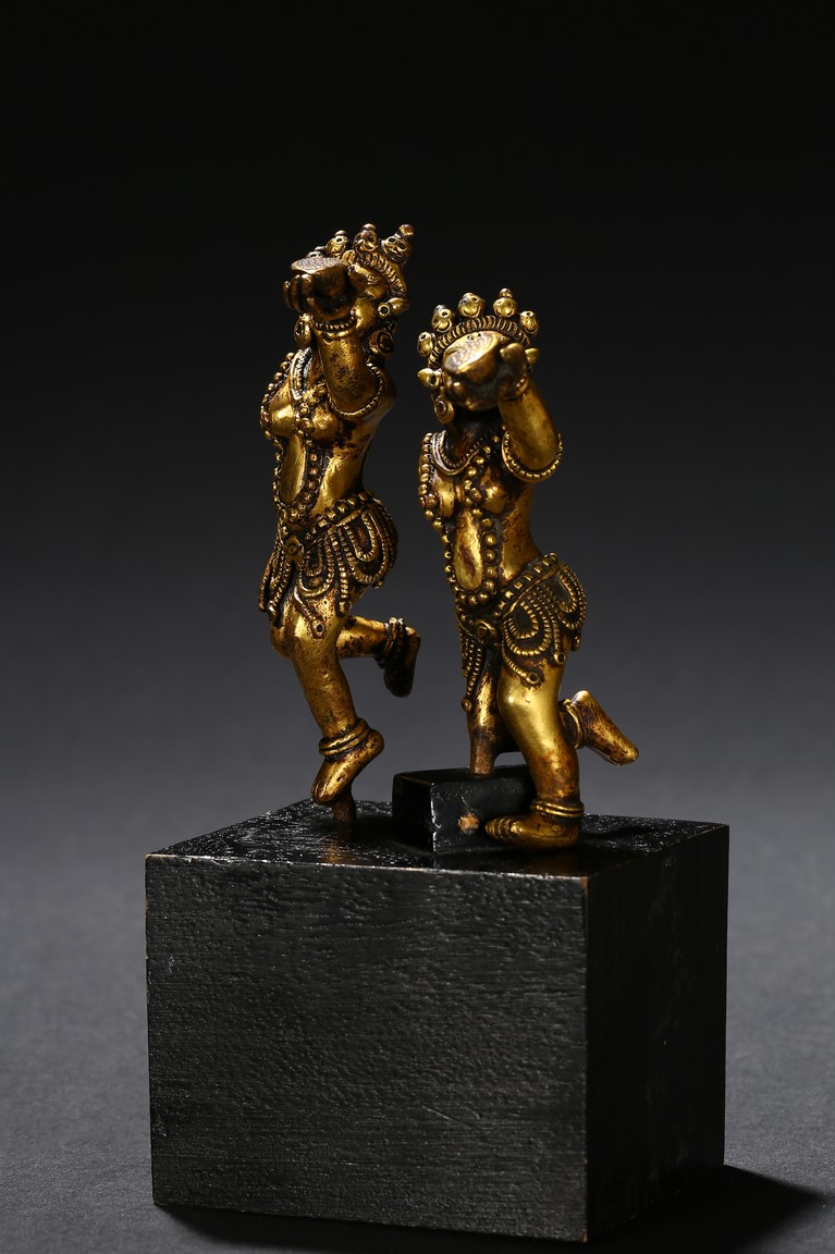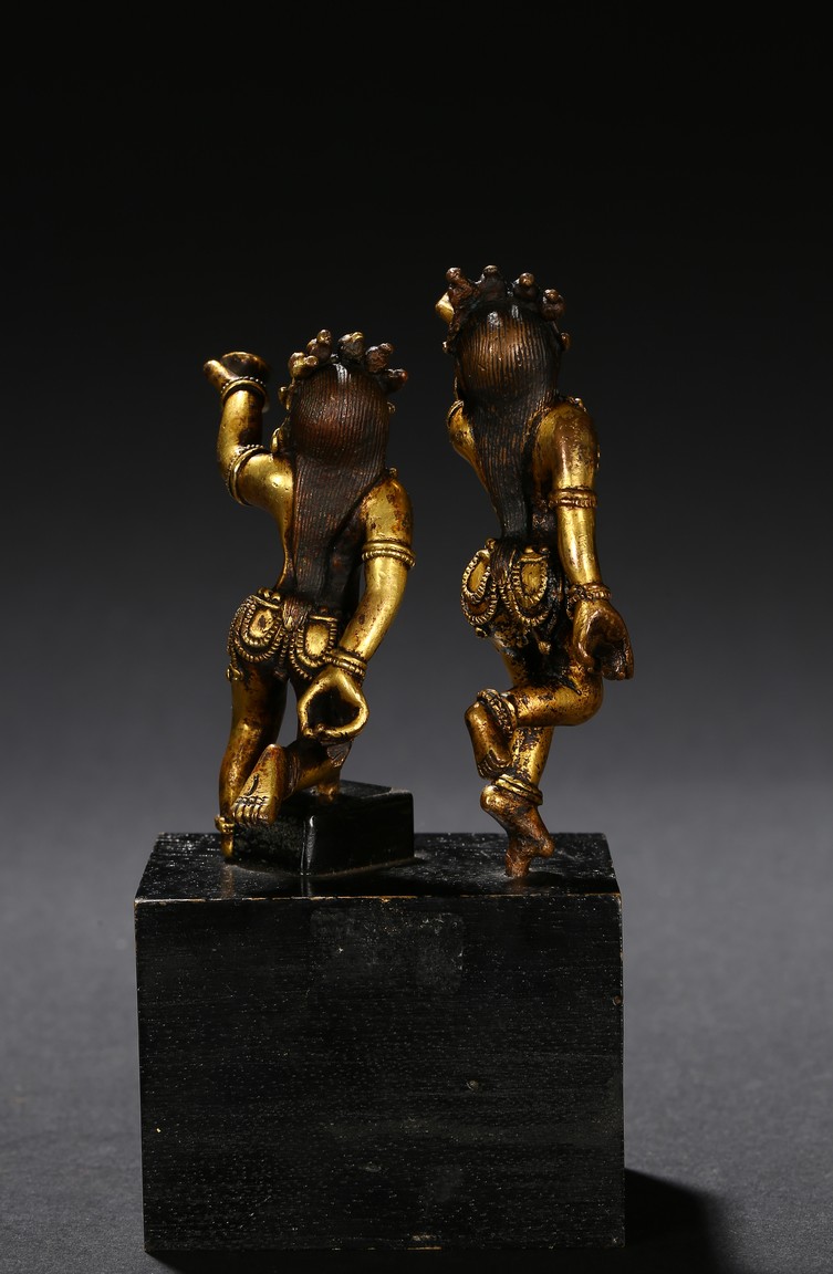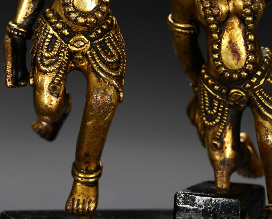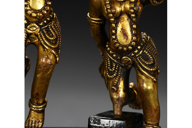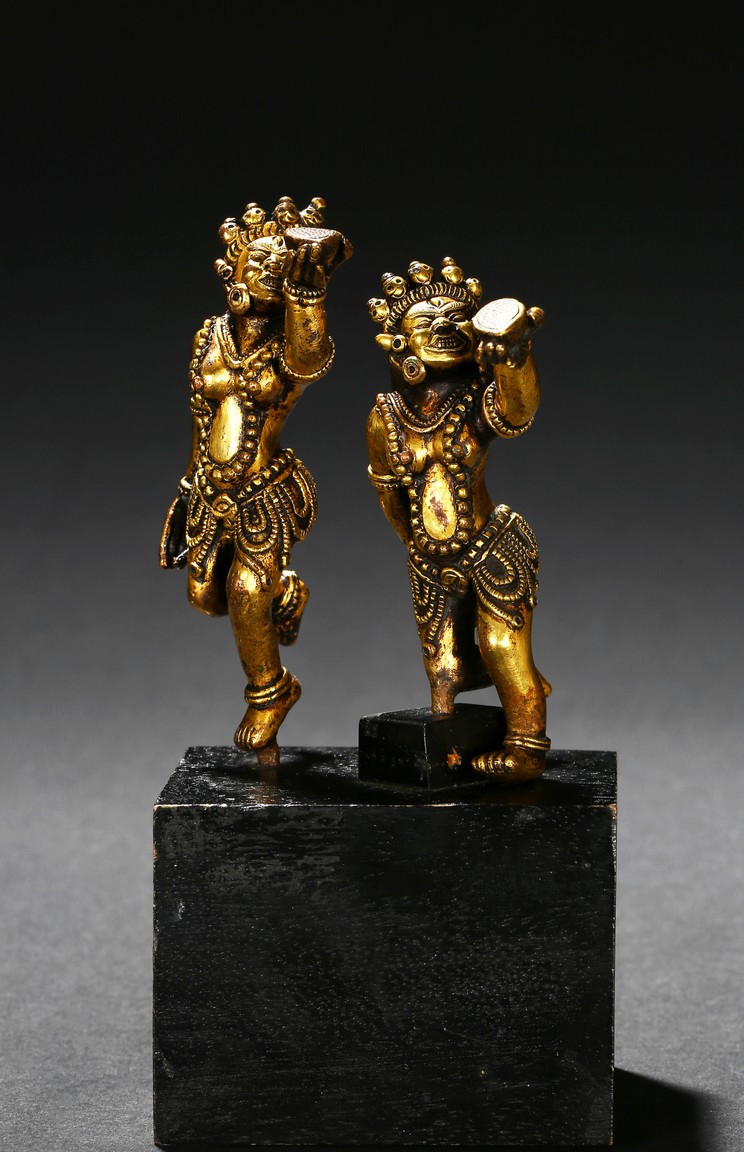 Each deity shown standing upon one foot, holding a tribute on one hand on left hand, body decorated with beaded jewelry, face with ferocious expression. Qing Dynasty period.