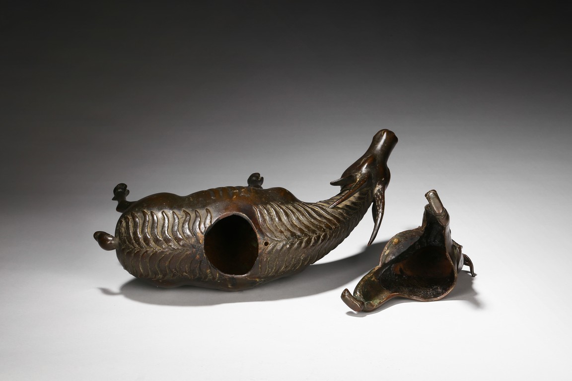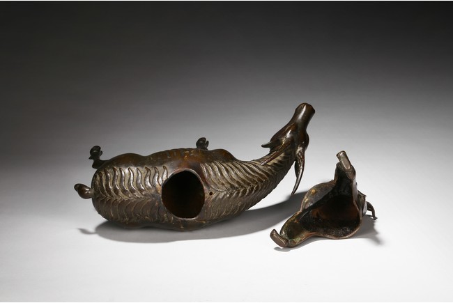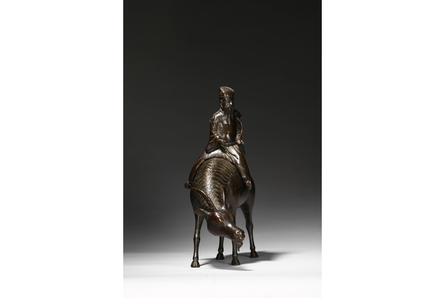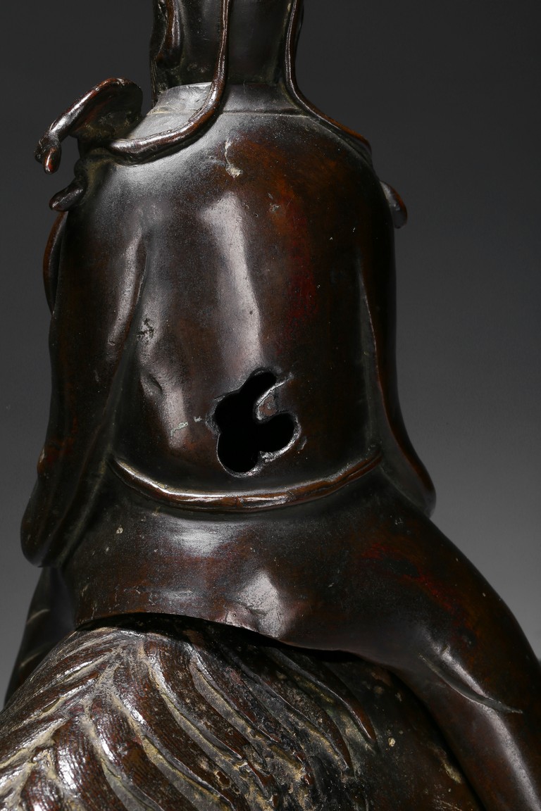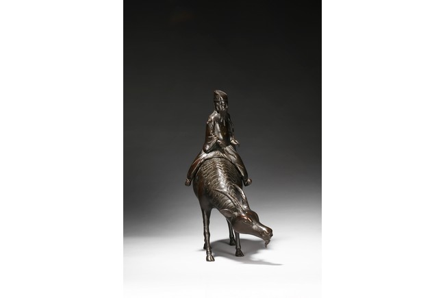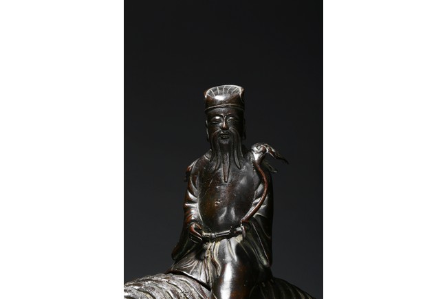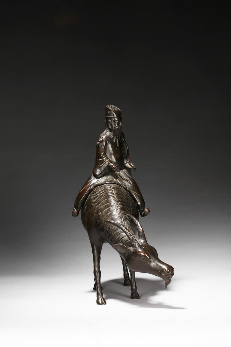 The cast figure with a detachable cover, cast in the form of the immortal elderly figure, dressed in long loose robes and wearing official's hat, with left hand holding a long ruyi scepter, fitted to the back of the hollow ram standing foursquare. Ming Dynasty period.