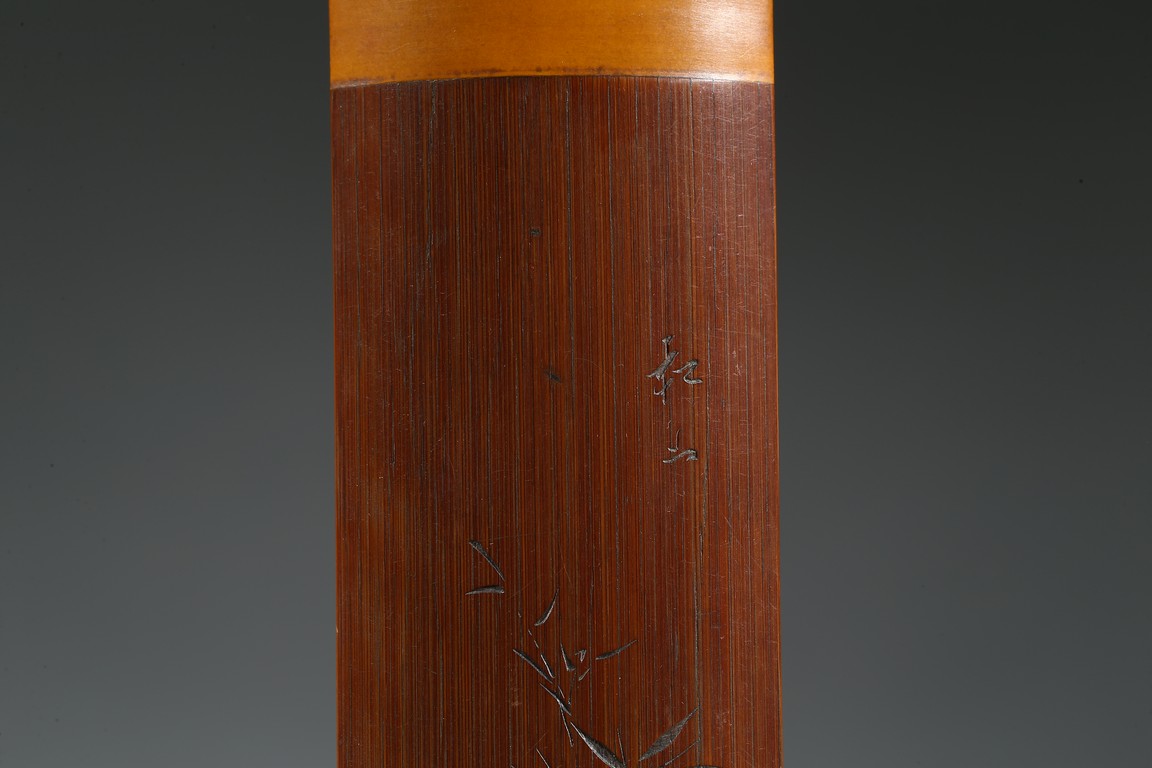 The arced section of bamboo incised with leafy bamboo decorations, inscribed by Song Shan. Qing Dynasty period.