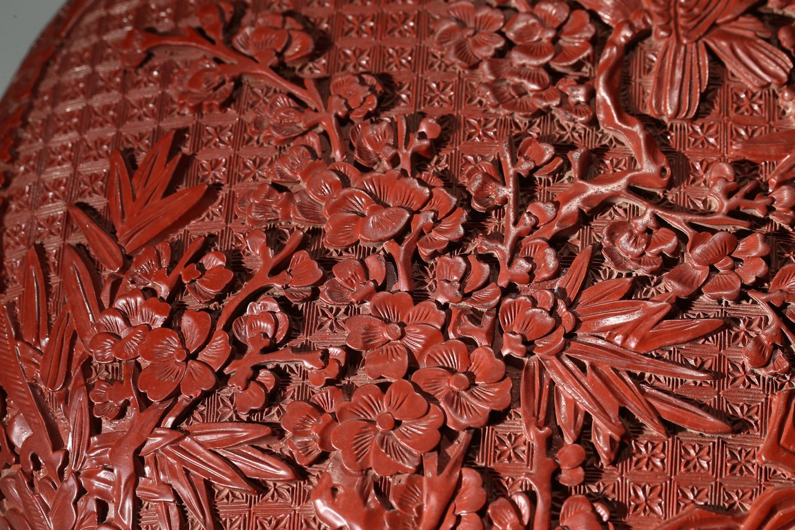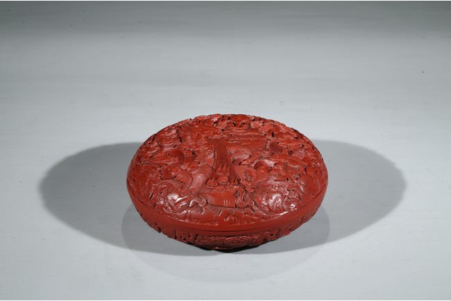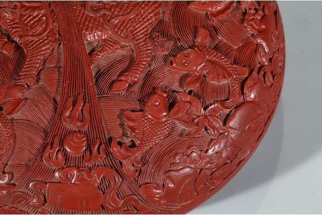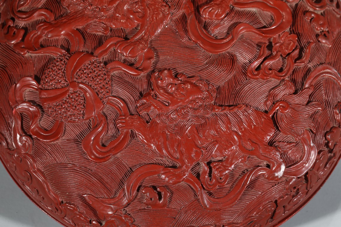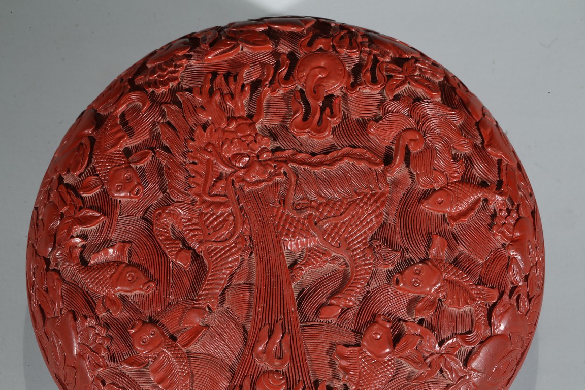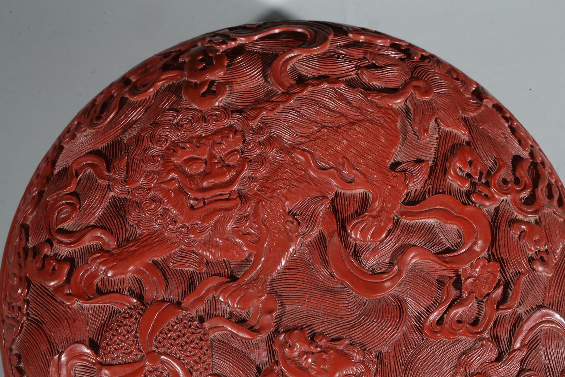 Of circular form, the box carved on one side to depict two buddhist lions playing brocade ball, the other side with a qilin and carp.