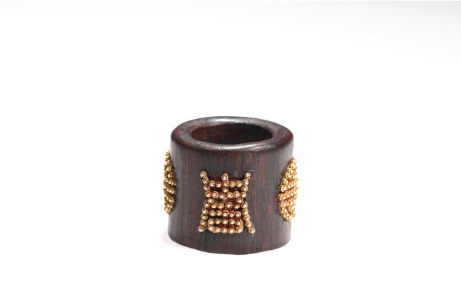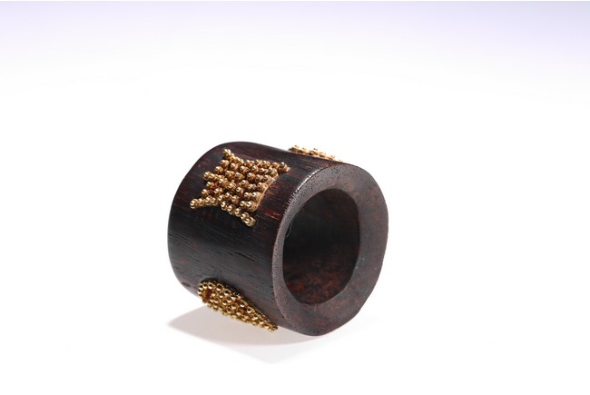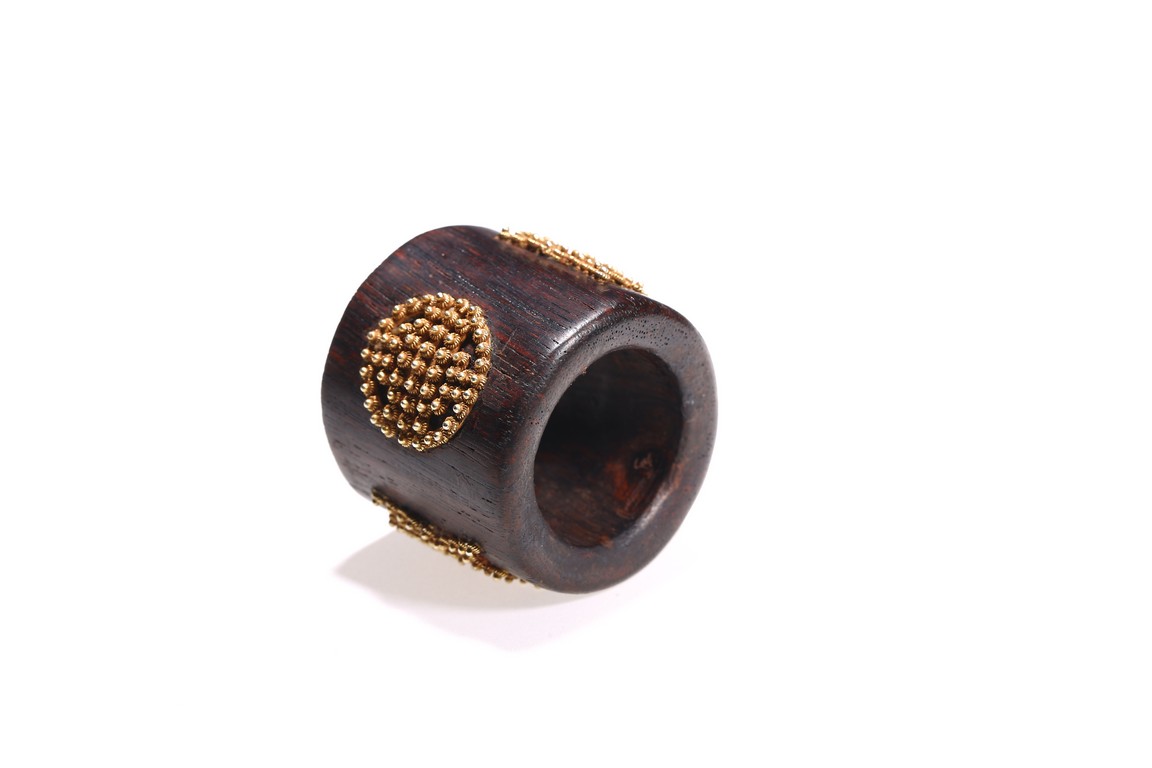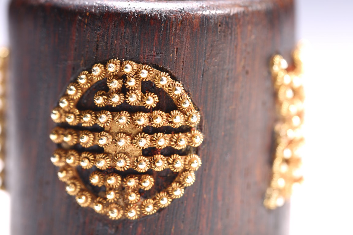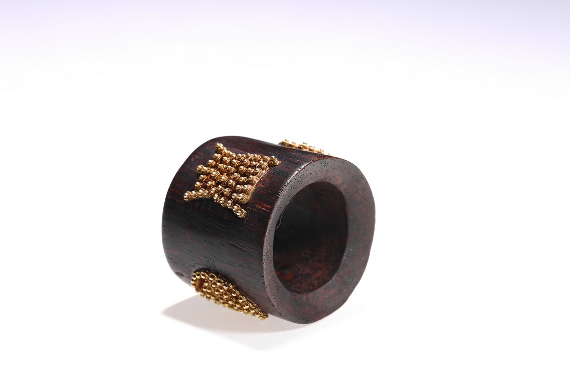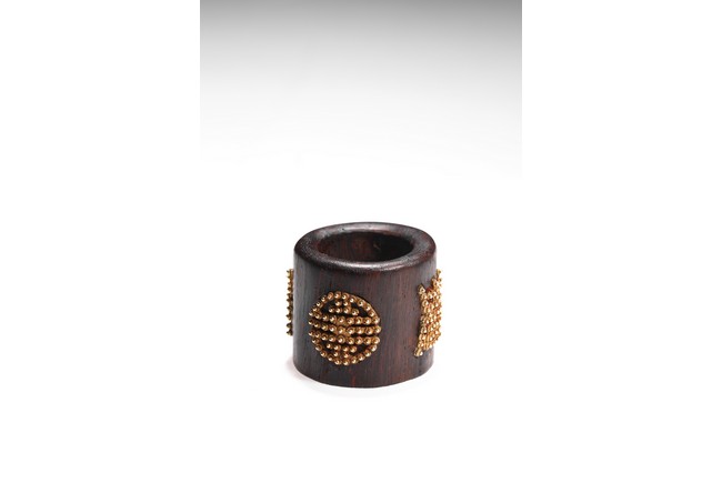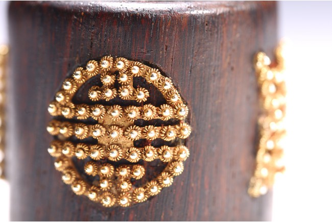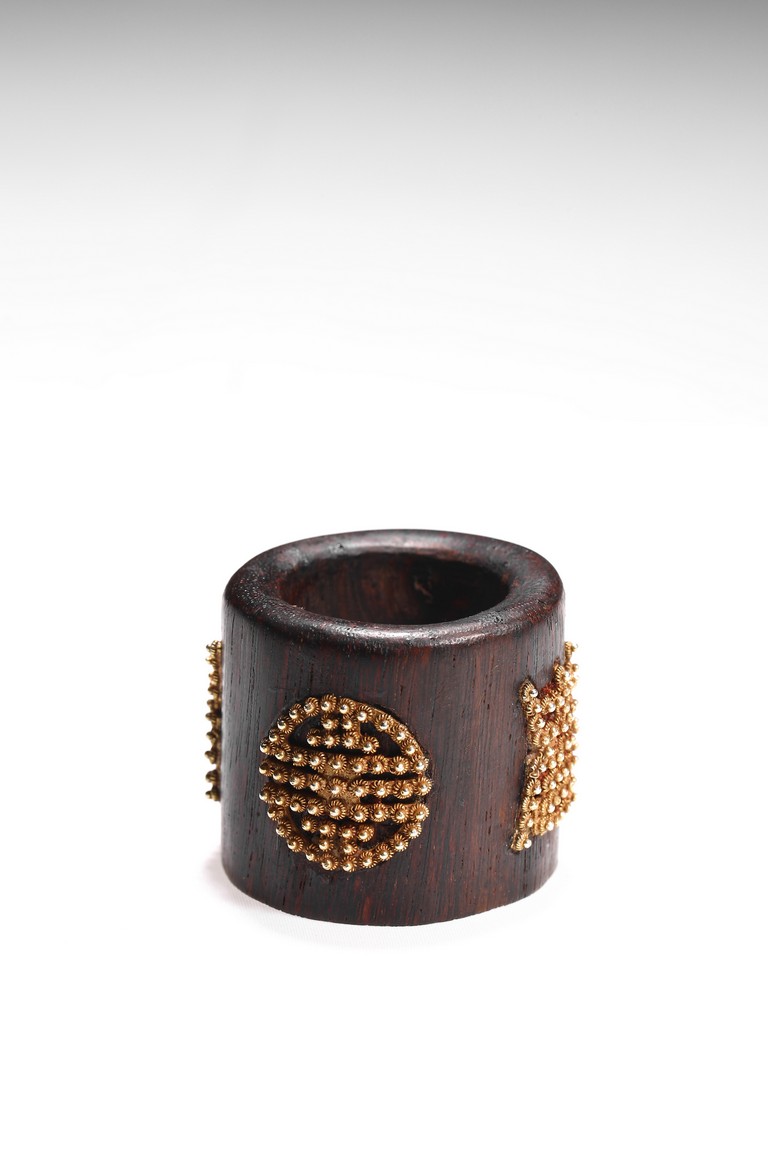 The agarwood carved ring is inlaid in tiny gold beads with stylized character and auspicious symbols. Qing Dynasty period.