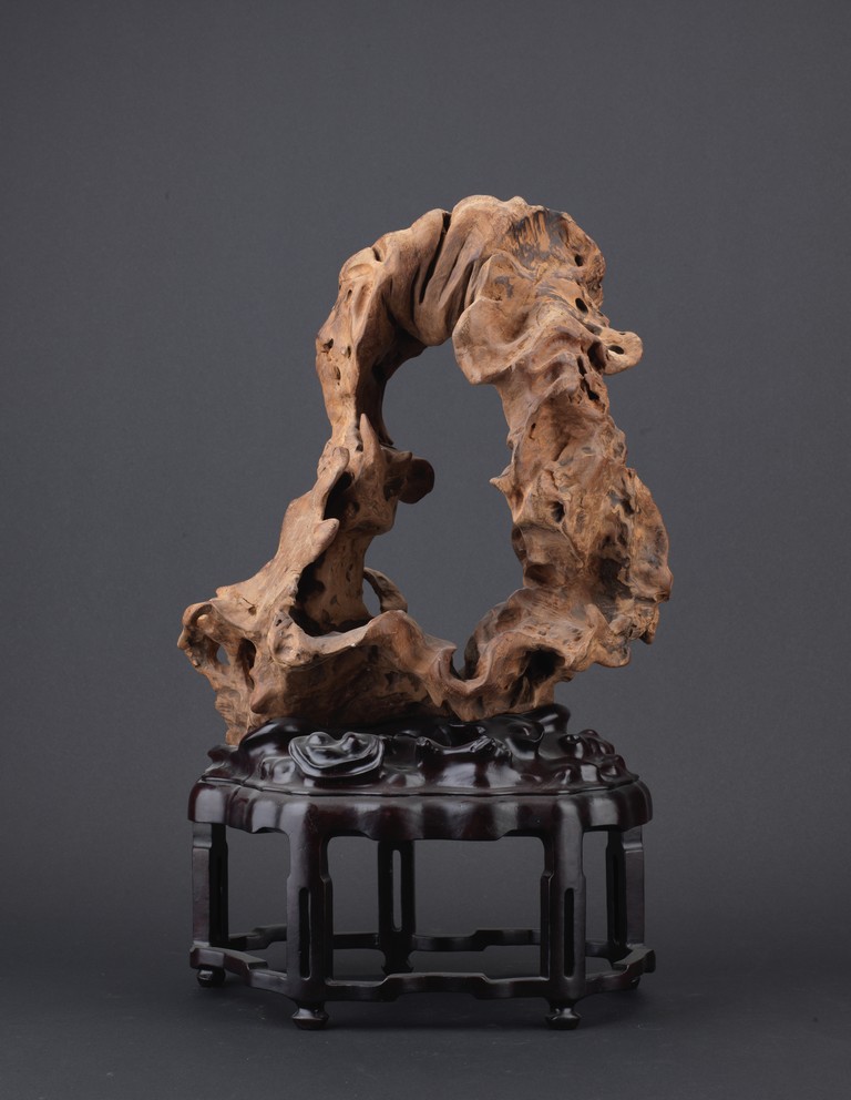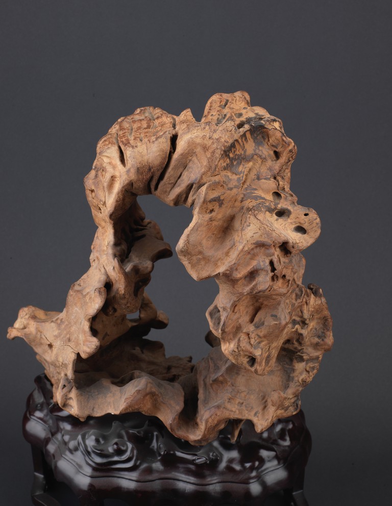 The naturalistic rendered wood with a central aperture and jagged edge, all supported on a wooden stand.