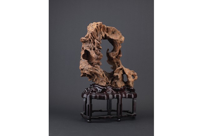 A NATURALISTIC WOOD CARVED 'MOUNTAIN' DISPLAY    隨形山子木雕佛龕擺件
